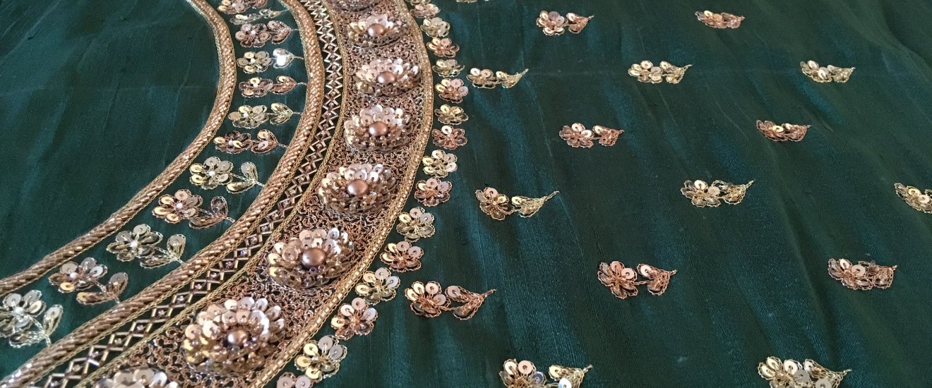 Aari work embroidery is a traditional Indian embroidery technique that involves the use of a hooked needle, called an "aari", to create intricate designs on fabric. The needle is used to create a chain stitch, which is then looped and knotted to form complex patterns. Aari work embroidery is commonly used on sarees, bridal wear, and other traditional Indian garments. This technique is labor-intensive and requires a high degree of skill, as the embroiderer must work with great precision to create the desired design. Aari work embroidery is valued for its intricate beauty and is a cherished part of India's rich cultural heritage.