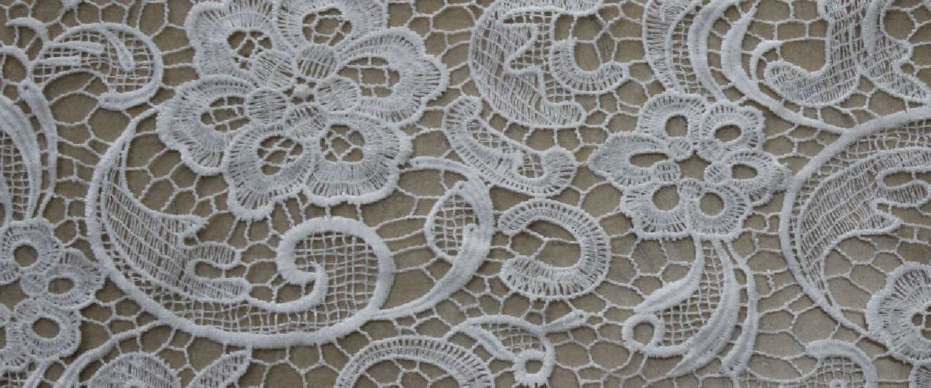 Lace is a delicate and intricate fabric made by weaving or knitting threads in an open web-like pattern. It can be made from a variety of materials, such as silk, cotton, linen, or synthetic fibers. It often features ornamental designs, floral patterns, geometric shapes, and sometimes even depictions of animals or people.