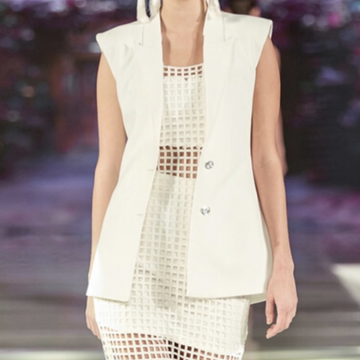 Get ready to dazzle in this stunning white blazer set. With its intricate details and elegant design, you'll surely make heads turn at any event you attend. The set includes sleeveless waistcoat with padded shoulders. Can be paired with the Alfama dress, skirt and bustier top for achieving a sophisticated and stylish look.