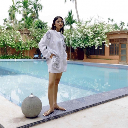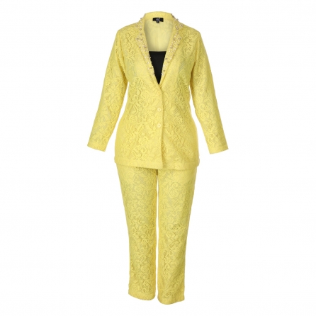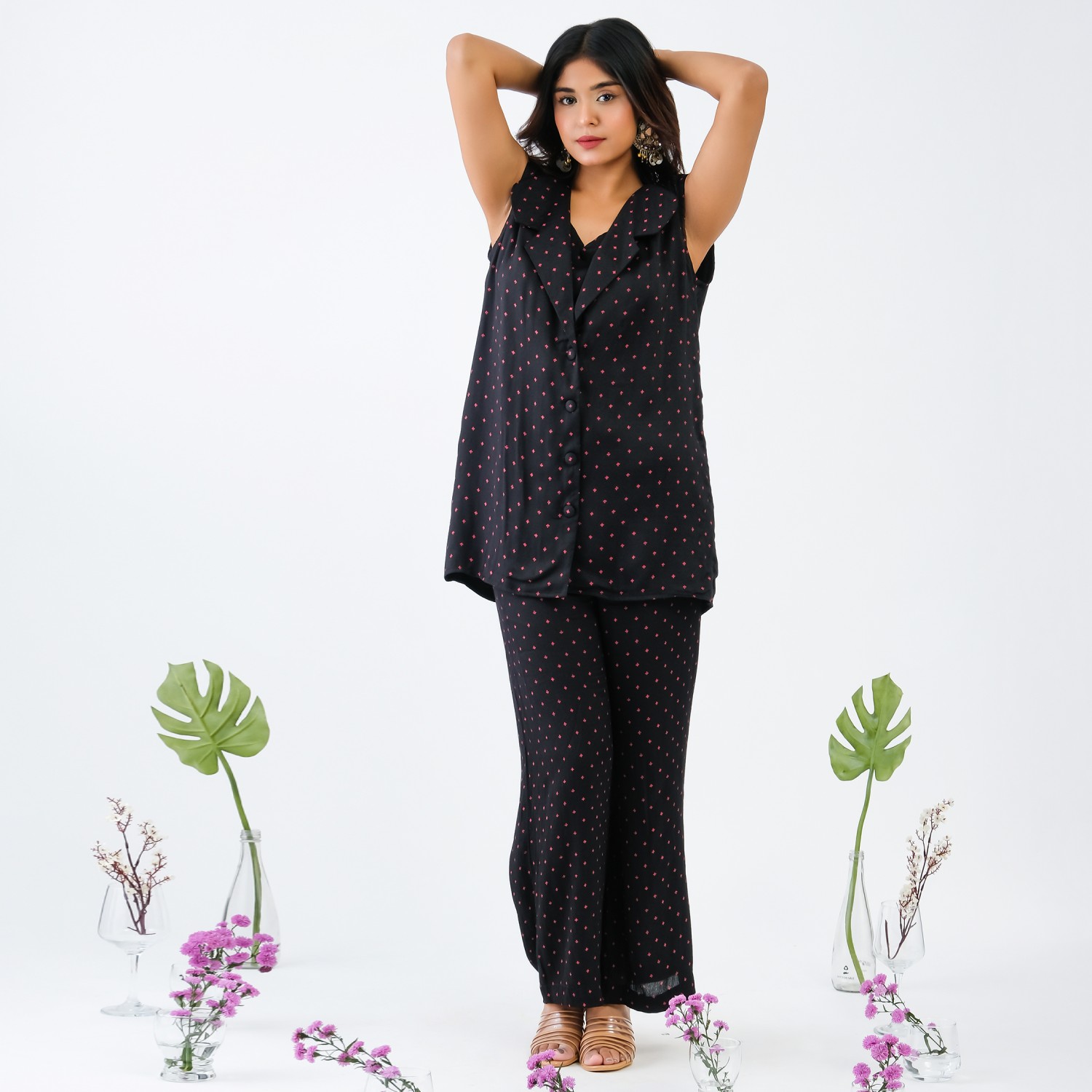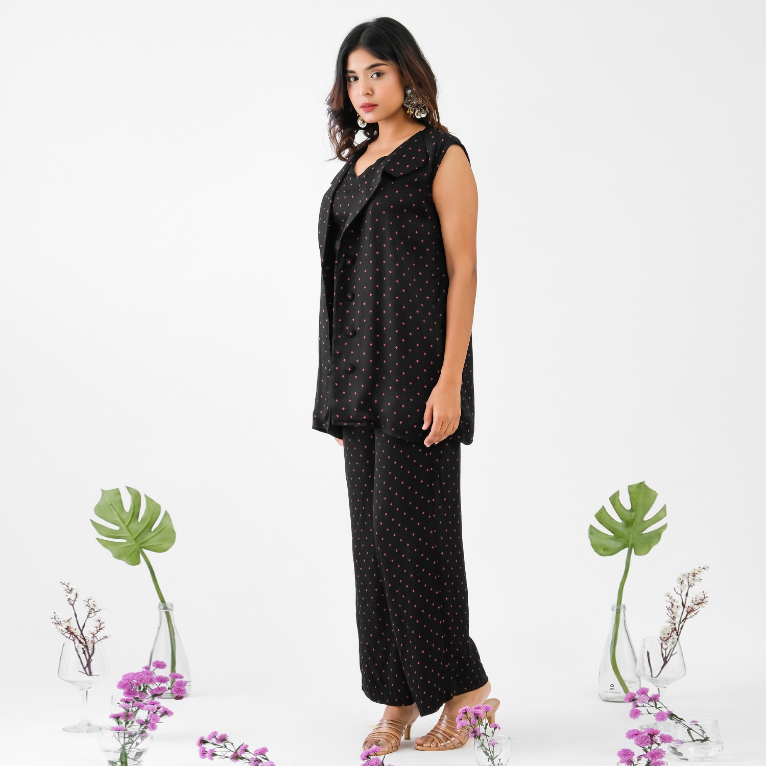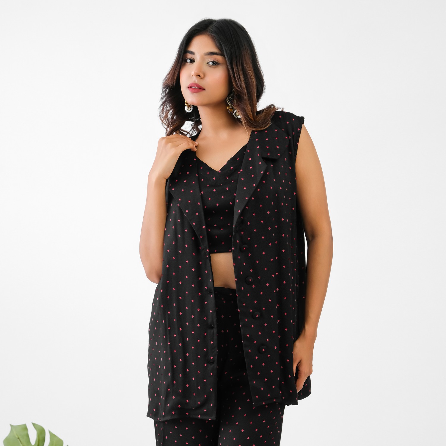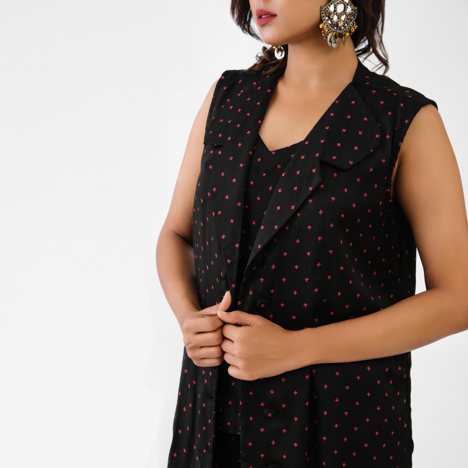 ₹ 7,599 (10% off)This set features stunning black bandhej print straight-fit pants, offering an elegant look. Paired with it is a sleek and sophisticated black blazer with a sleeveless design and long length. This set is crafted from luxurious chiffon fabric, offering comfort and ease of wear. Style it with a solid camisole and statement earrings for a chic look.