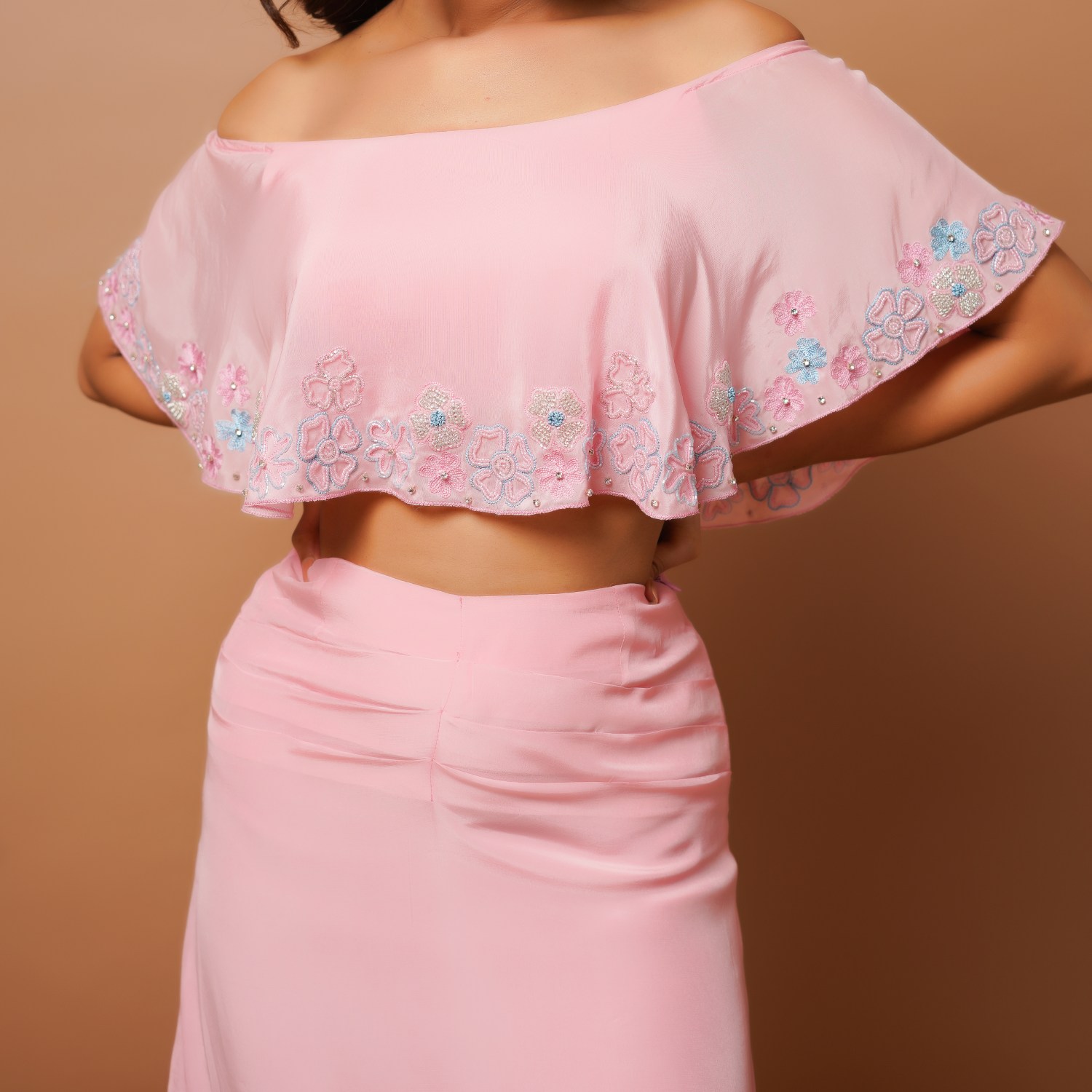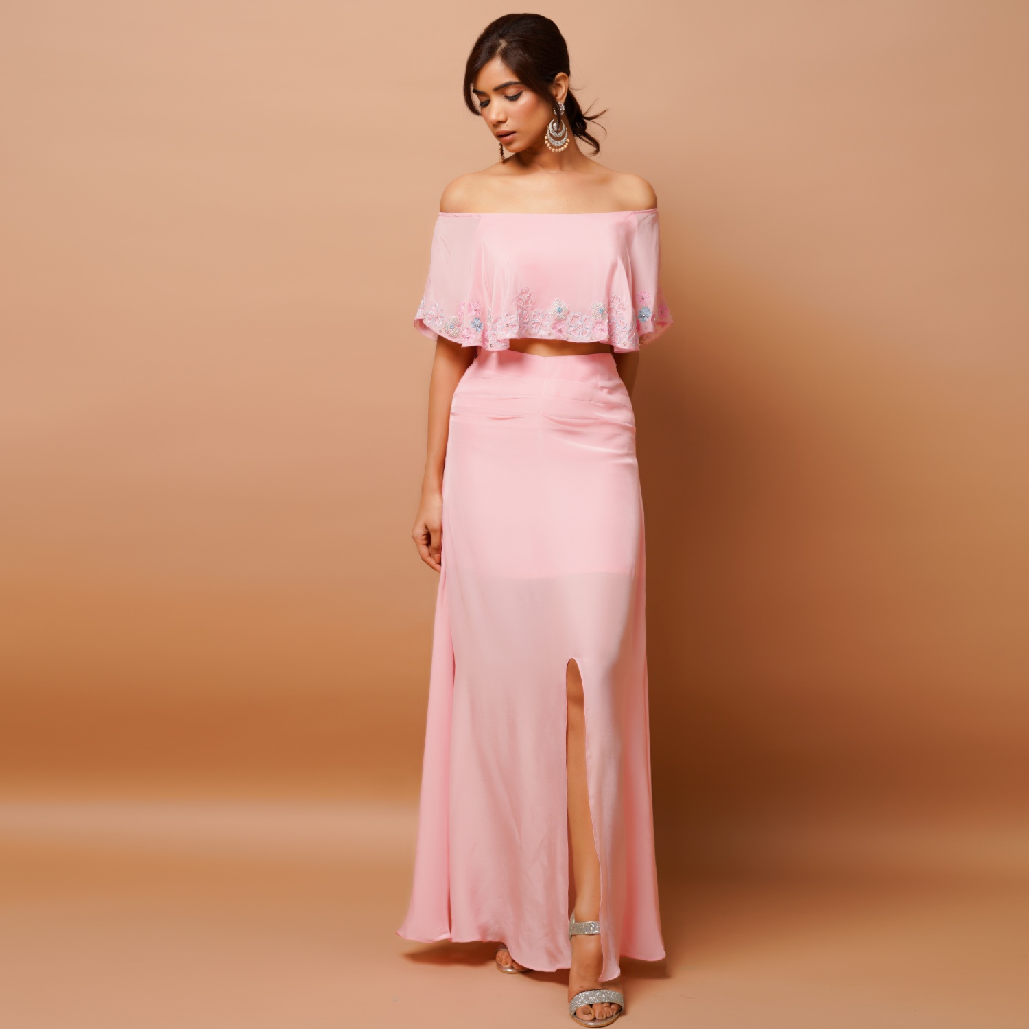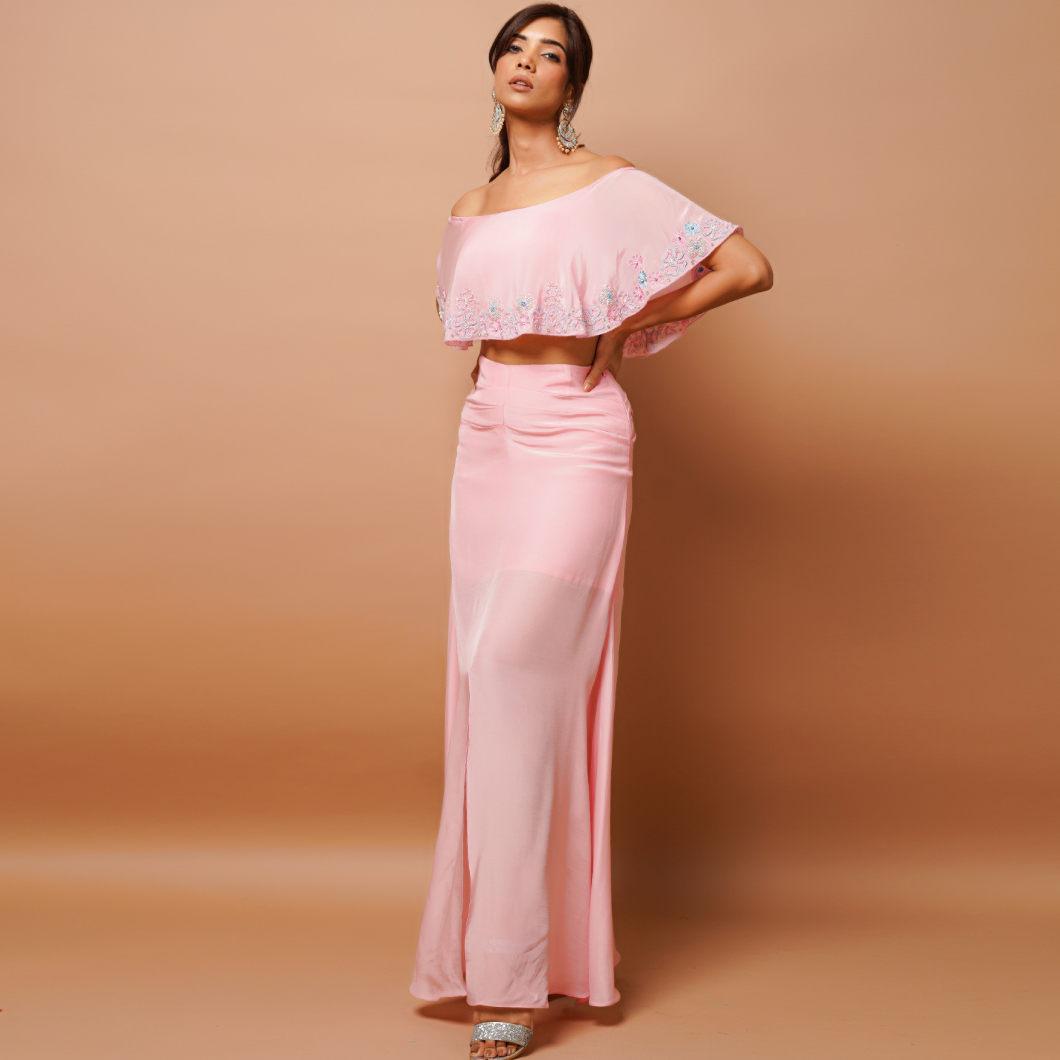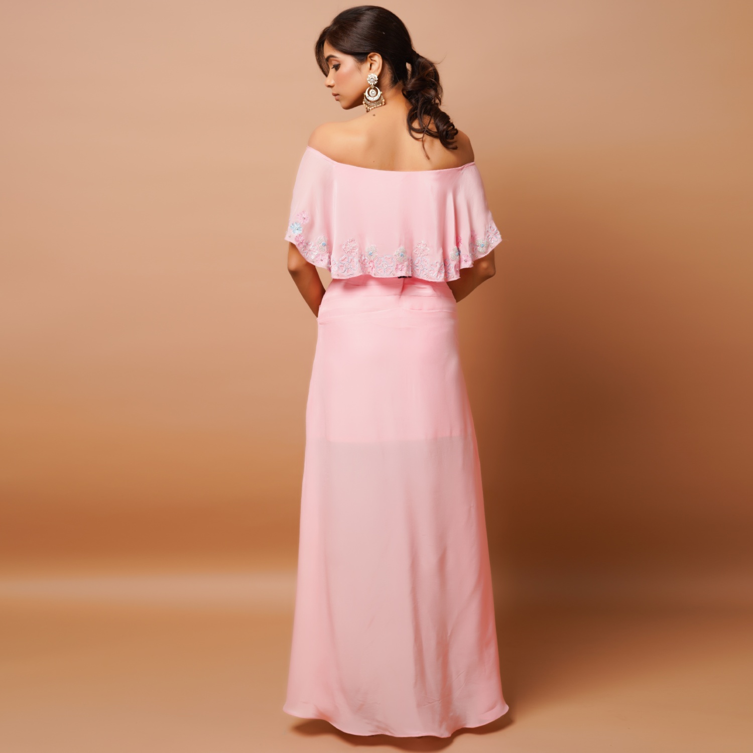 ₹ 24,995 (5% off)This set is crafted from crepe in a soft baby pink shade. The off-shoulder cape padded top is the focal point of the outfit. It is embellished with intricate handwork, featuring beads, zari, resham, zardozi, cutdana and stone work for a luxurious and ornate look. The A-line front slit high waist drape skirt complements the top, providing a balanced and elegant silhouette.