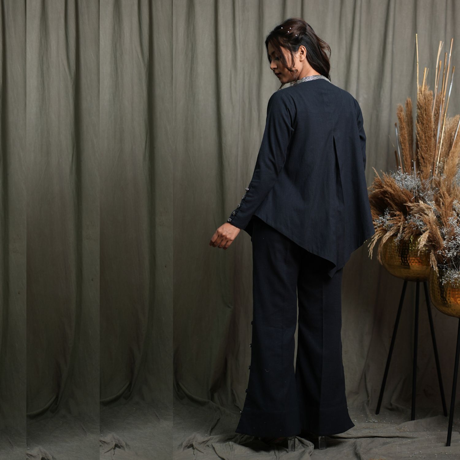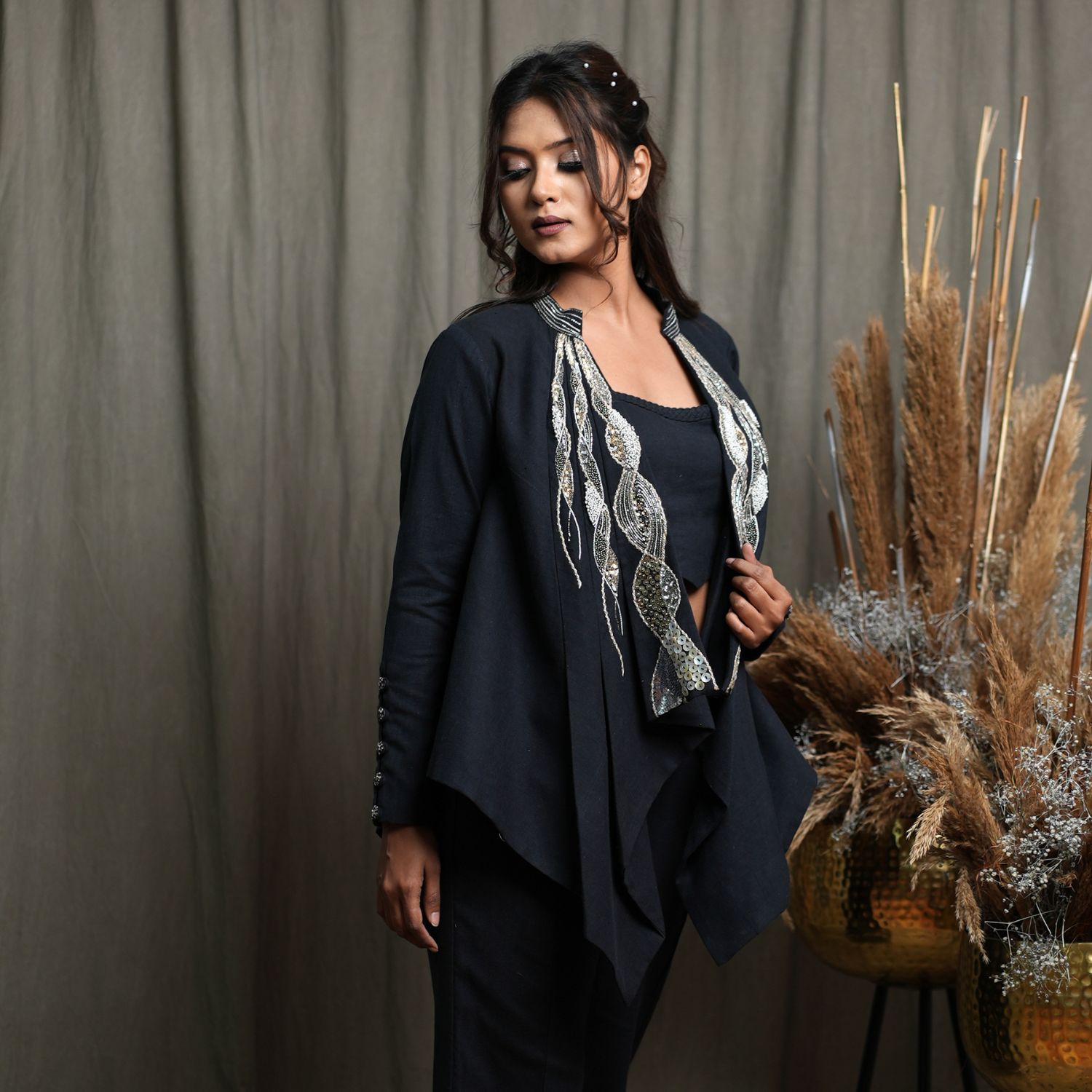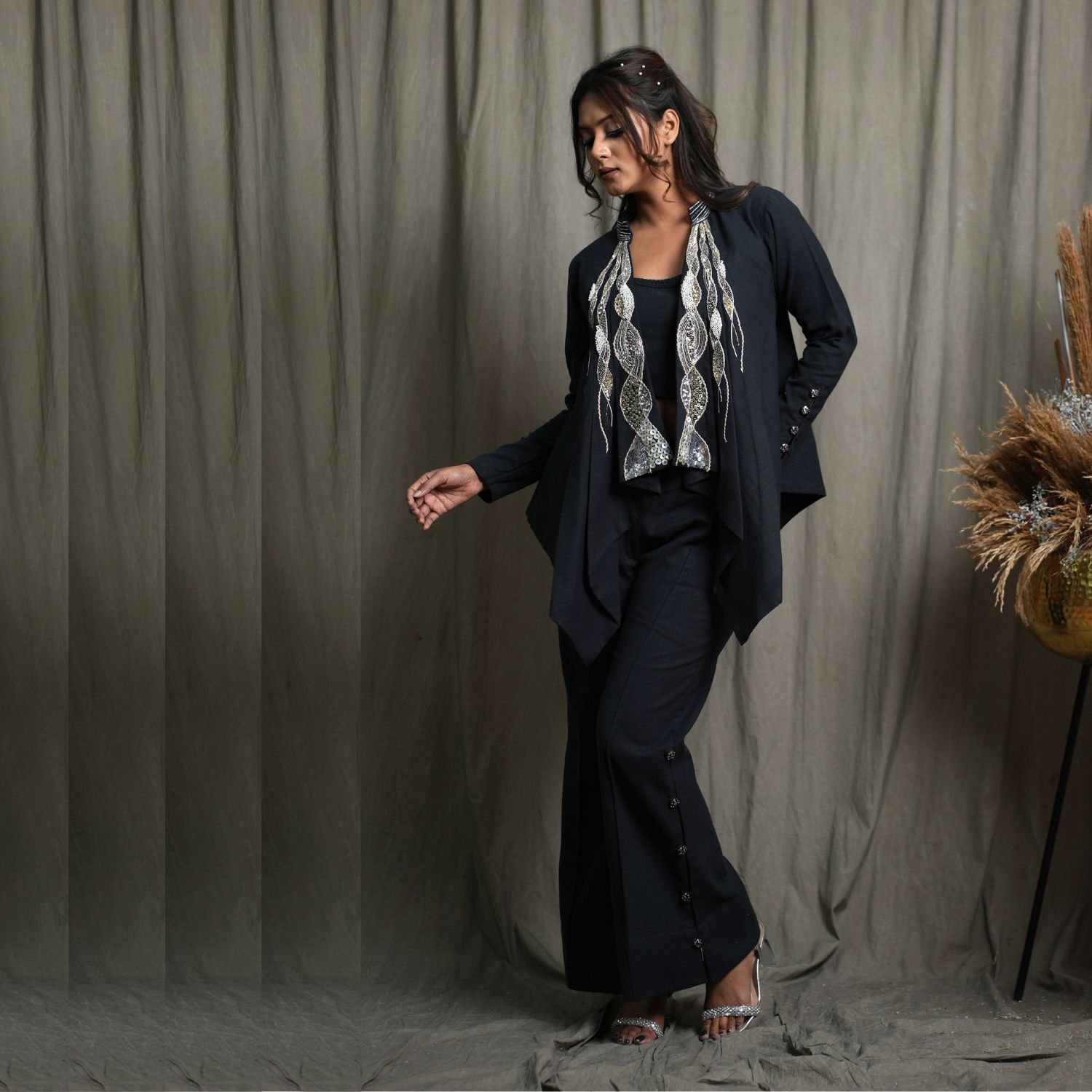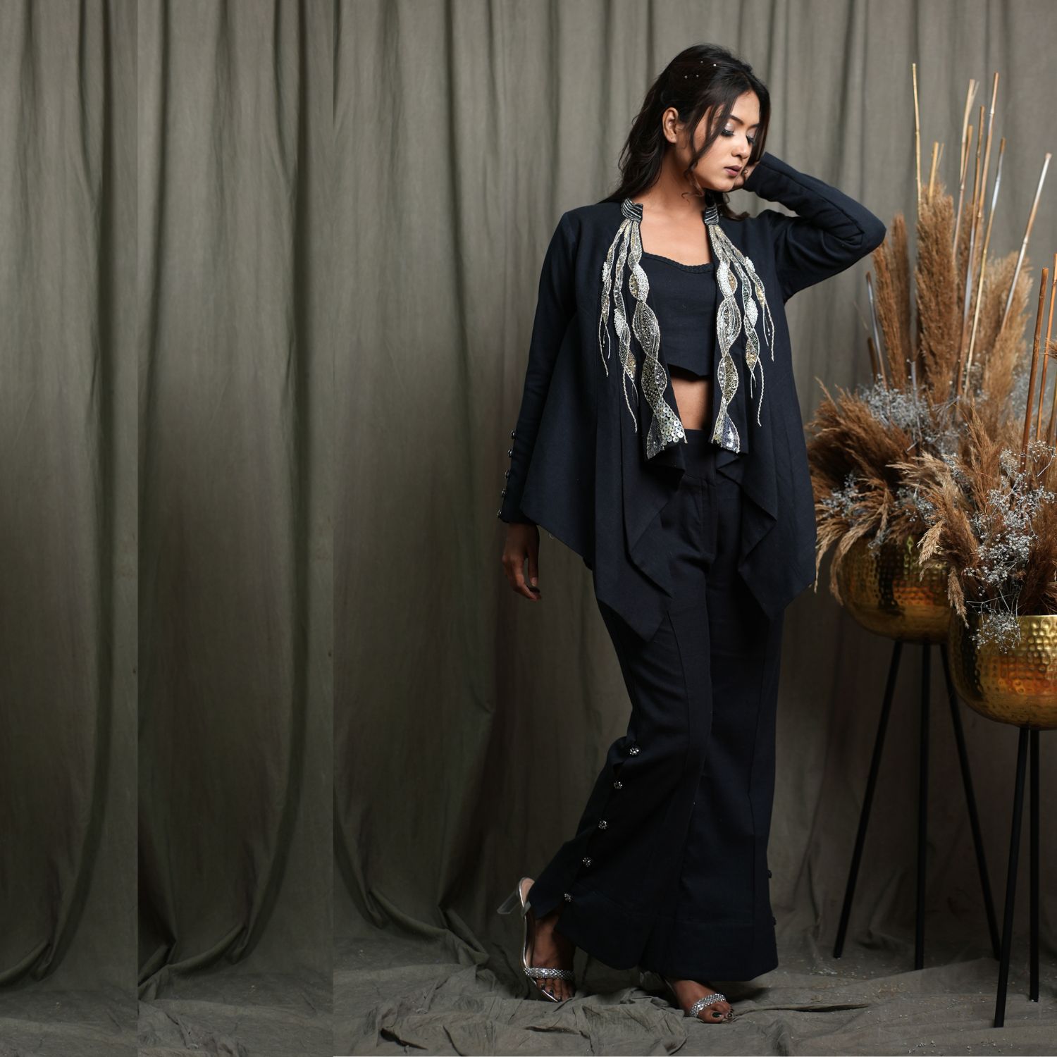 Introducing this exquisite 3-piece set, featuring a full-sleeved jacket with intricate hand embroidery and modern front pleats. Paired with a sleeveless body-fitted crop top for a chic look. Complete the ensemble with flared pants adorned with side slits and hand-embellished button details. This outfit promises a perfect fit and a touch of contemporary elegance.