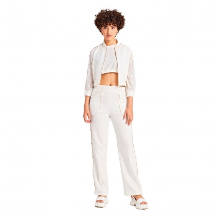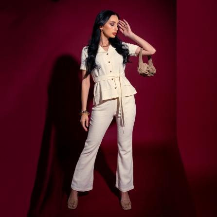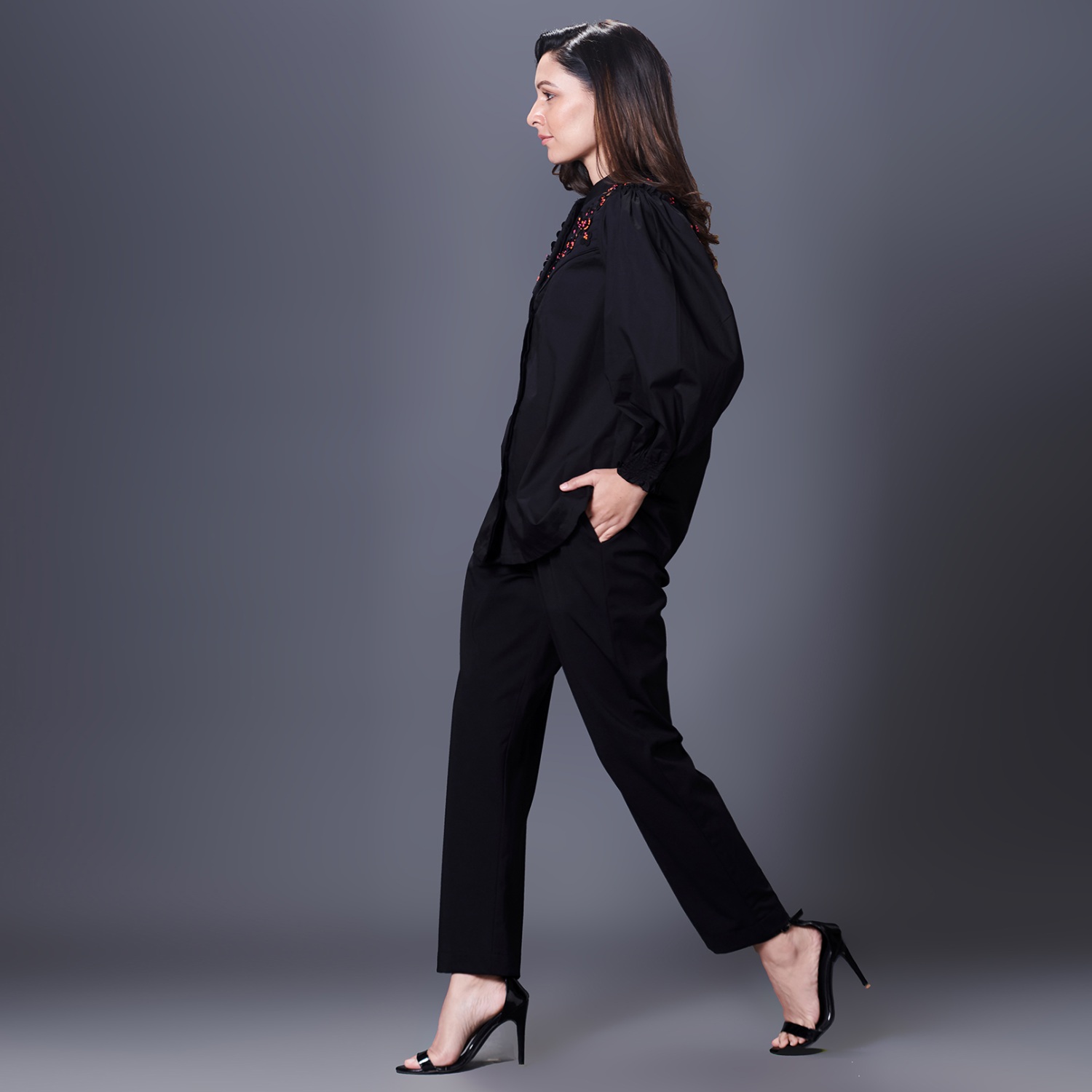 Crafted from soft cotton fabric, this set includes a black shirt and matching pants. jacket-style shirt features a hand-embroidered quilted yoke for added elegance. It has balloon sleeves with elasticated cuffs for a stylish and comfortable fit. The straight-fit pants are high-waisted, providing a flattering silhouette. Style it with minimal jewellery and a clutch for a dressy evening soiree.