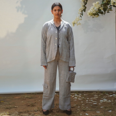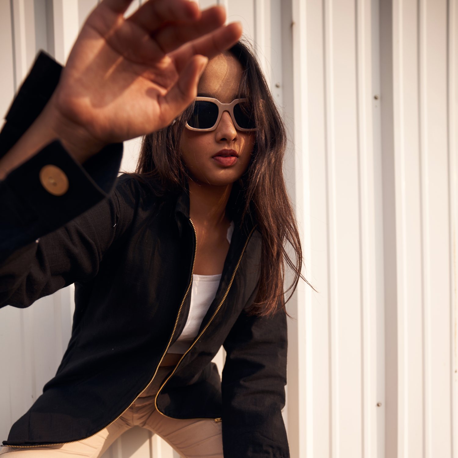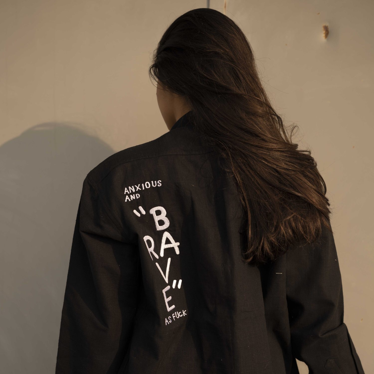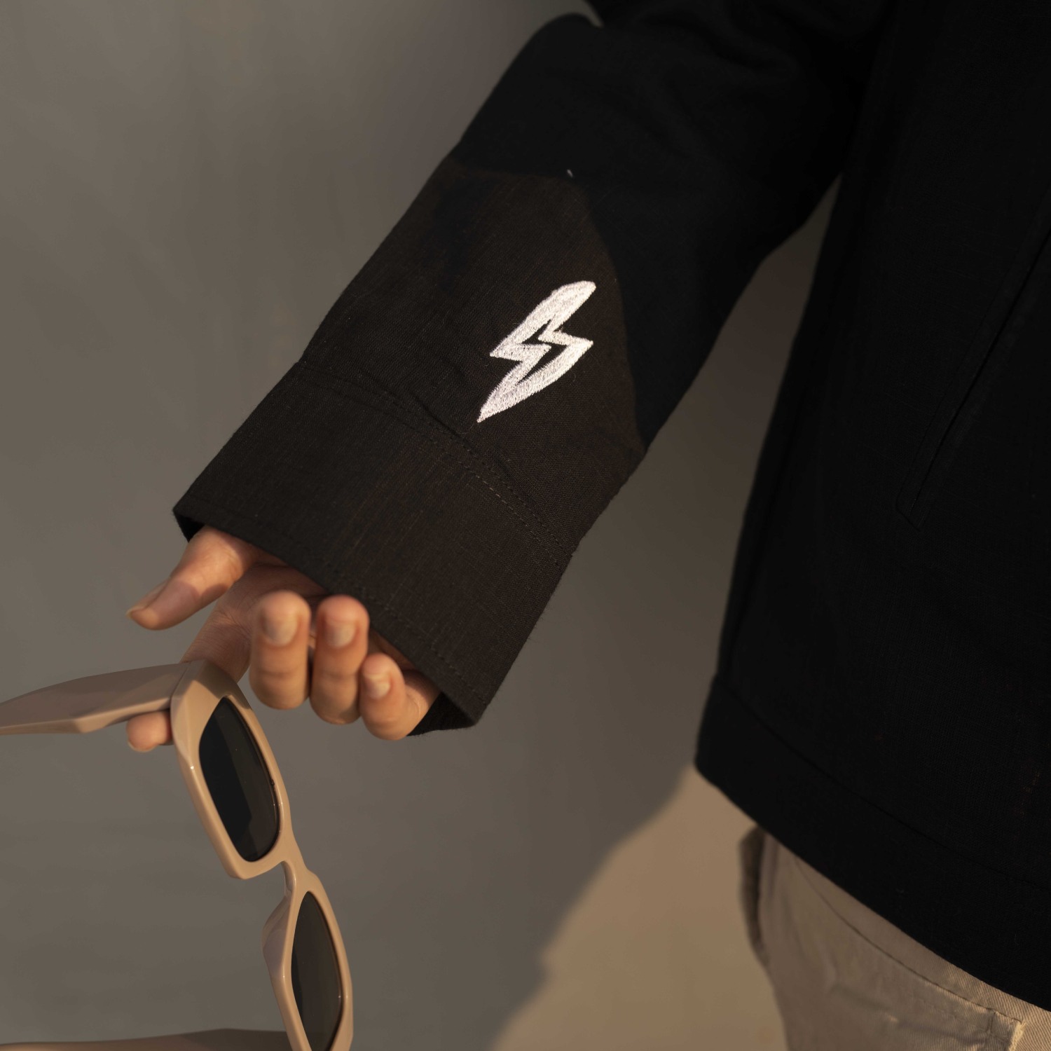 Crafted from organic cotton, it offers an oversized fit for a relaxed vibe. This shacket features brown wooden cuff buttons for contrast, a little spark embroidered on one sleeve and embroidered typography on the back. Style it with a white tank top and oversized sunglasses for a day out with friends.