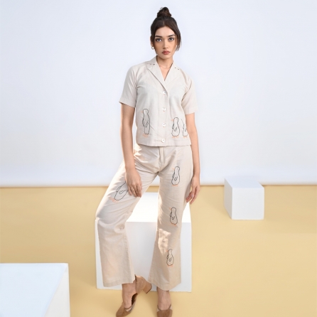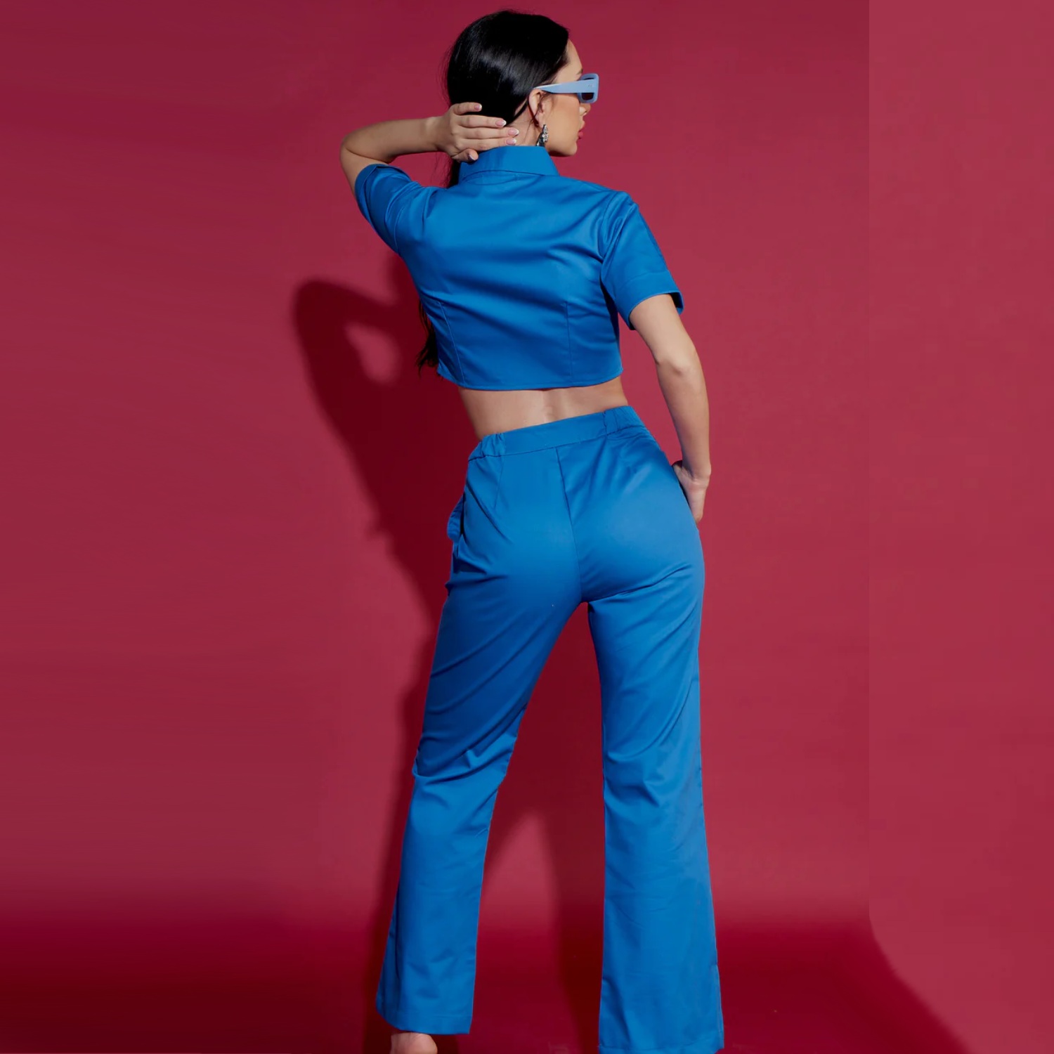 Crafted from high-quality cotton twill fabric, this co-od set features a vibrant blue crop top and matching straight-fit pants. The top has detailed stitch lines and concealed buttons, offering elegance and style. Pair it with gold earrings and heels for a dressy evening event.