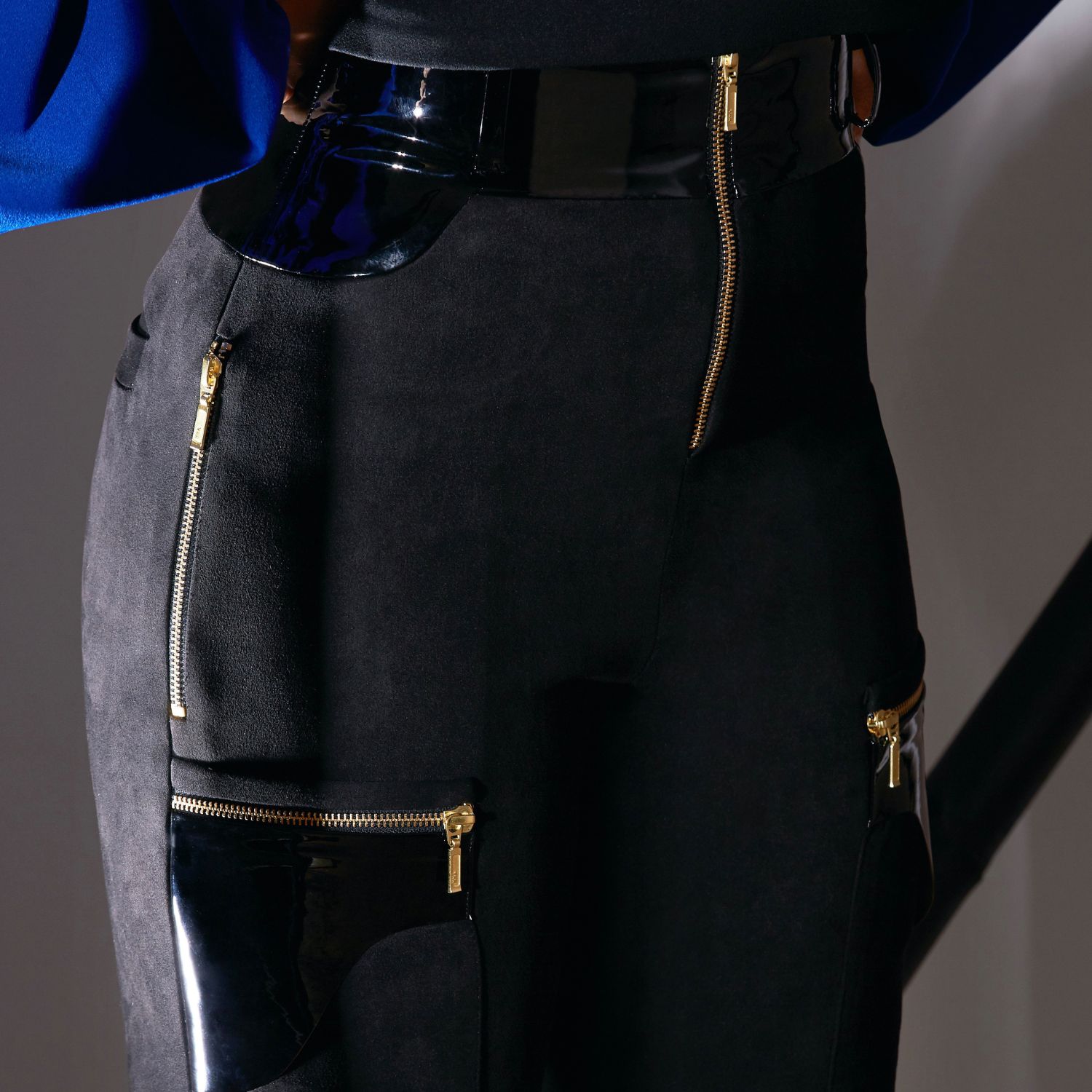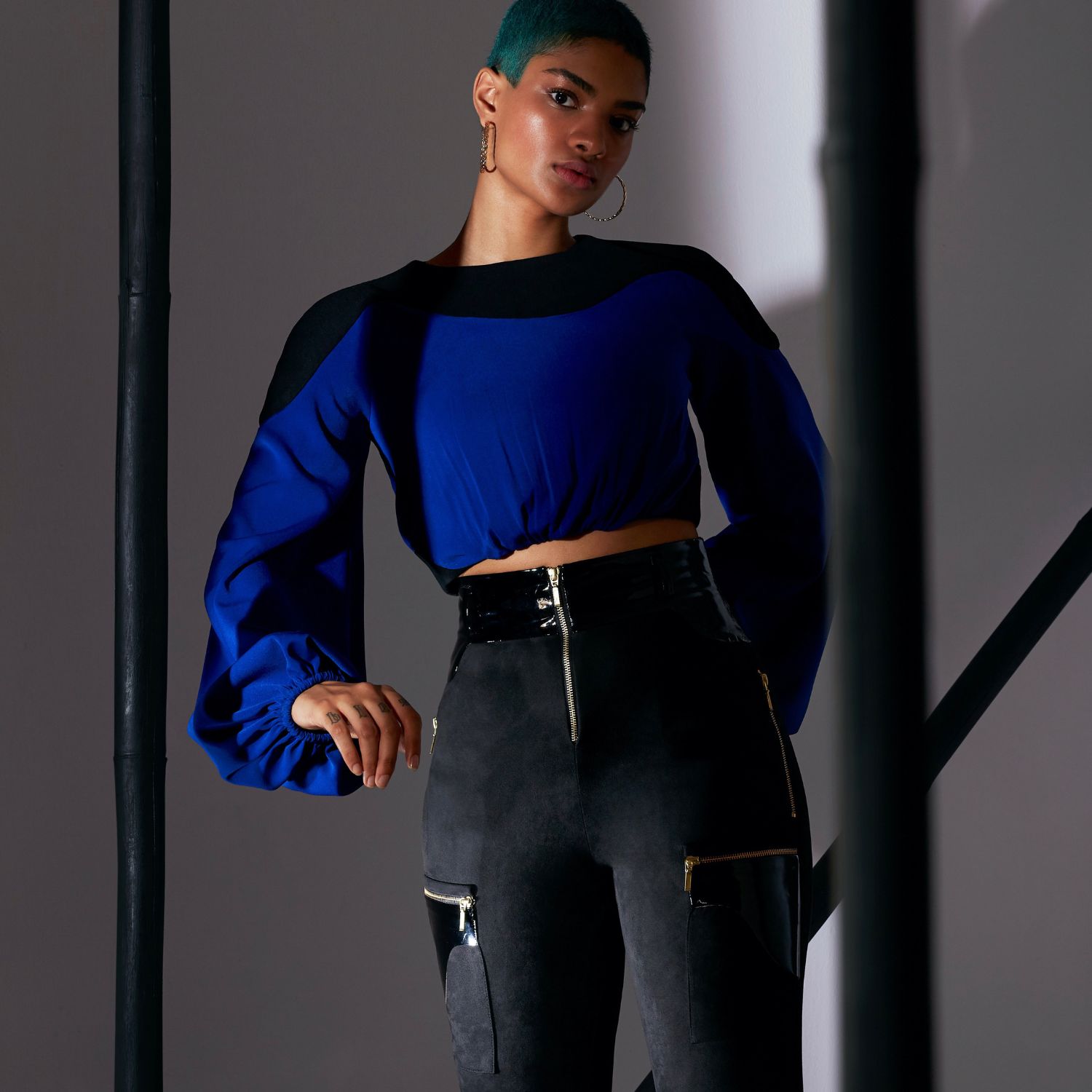 The classic color-blocked top with gathered sleeves is a chic and practical option. Color-blocking allows for the incorporation of different colours or tones while adding a lively and eye-catching accent to the top. It is paired with classic-fitting trousers that are elegant and flexible. The addition of a faux-leather waistband and pocket flaps gives the trousers a modern and edgy look.