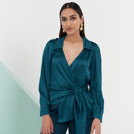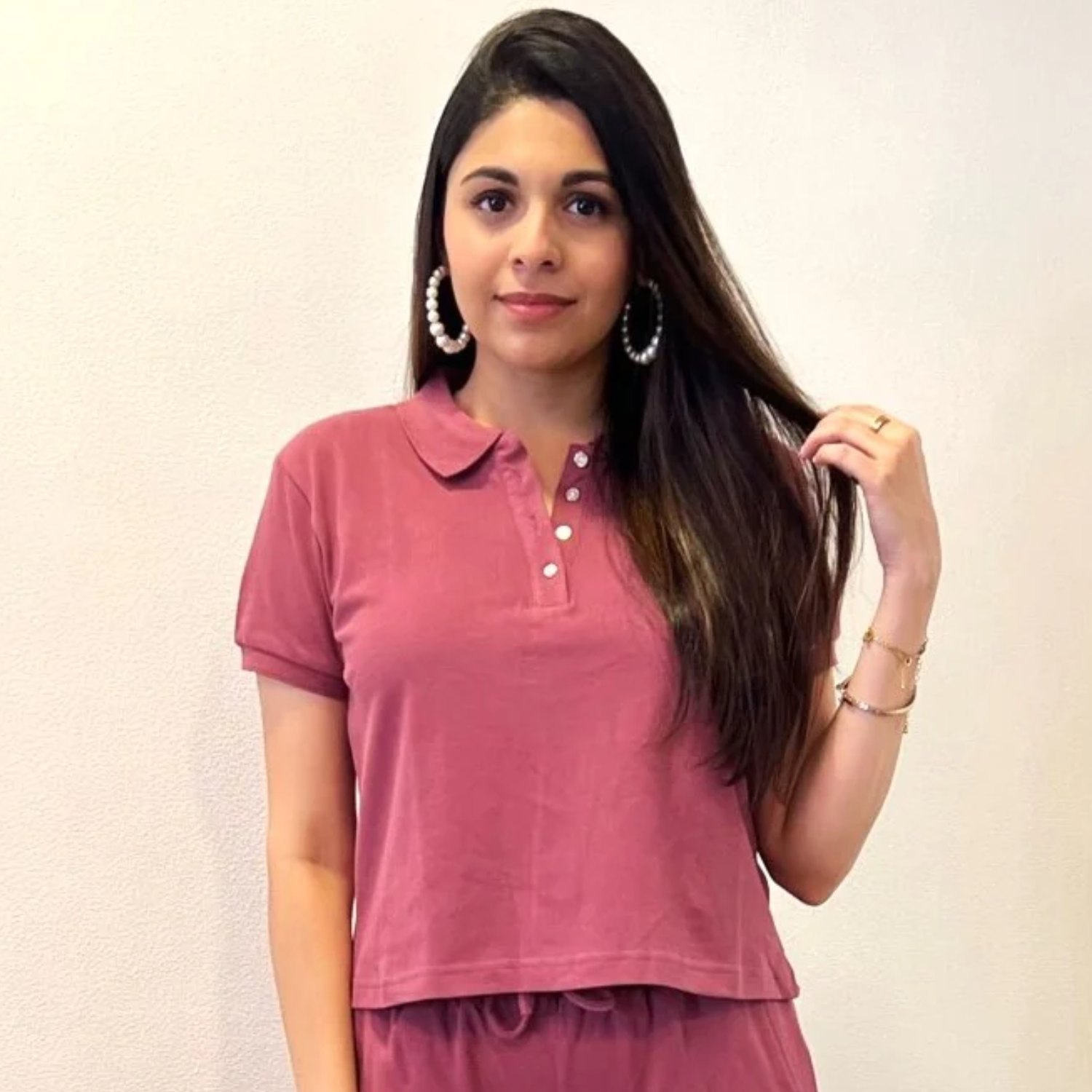 This co-ord set features a soft blush pink color. The top comes with a collared neckline and ribbed detailing on sleeves. The set is completed with high-waisted wide-legged pants, creating a flattering silhouette.