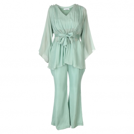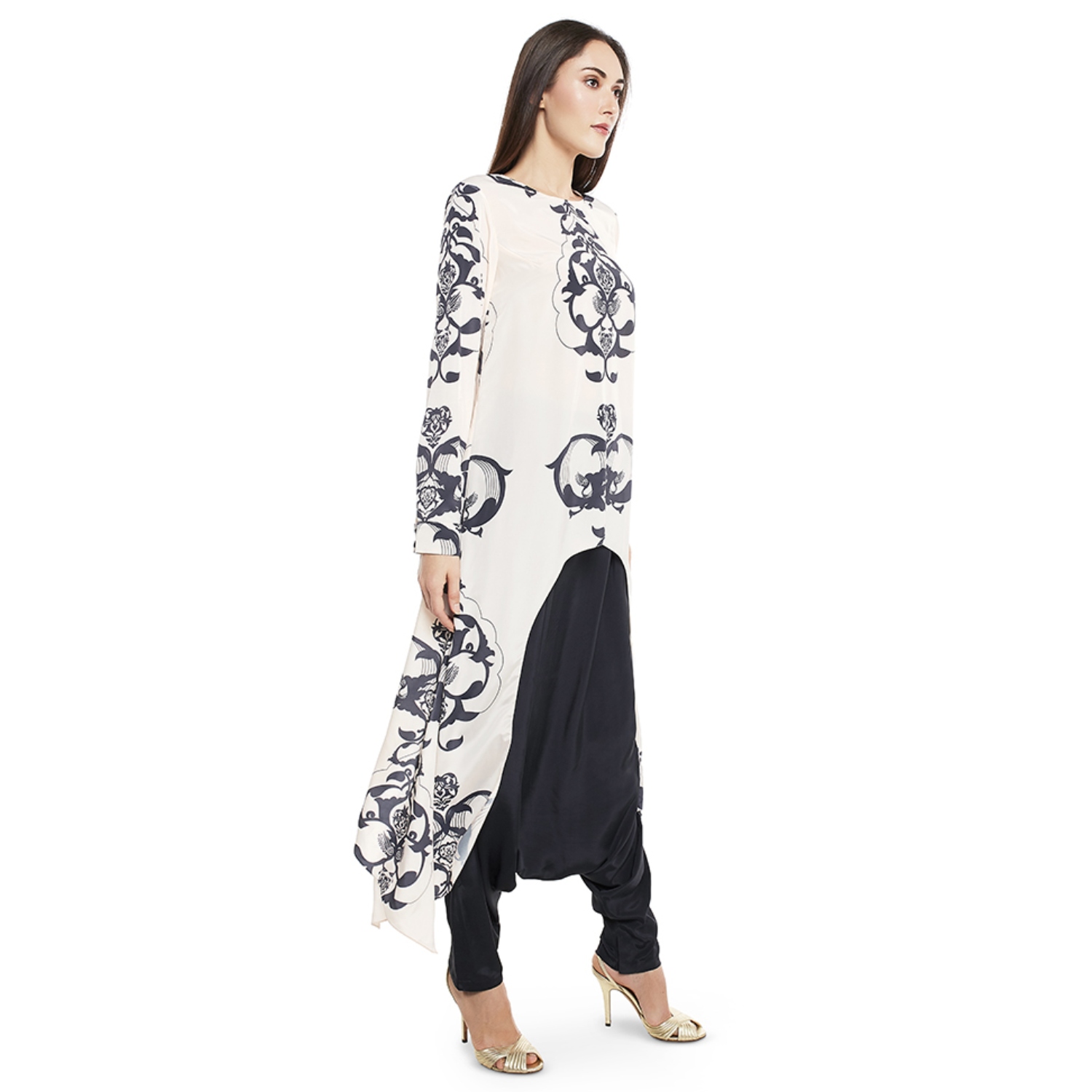 This gorgeous set is crafted from high-quality crepe fabric. The top features a contrasting ottoman print on a blush base, full sleeves, and a relaxed fit for comfort. Complementing the top are the low-crotch pants in a solid black shade, offering a beautiful contrast to the outfit. Pair it with delicate earrings and solid heels for a dressy day soiree.