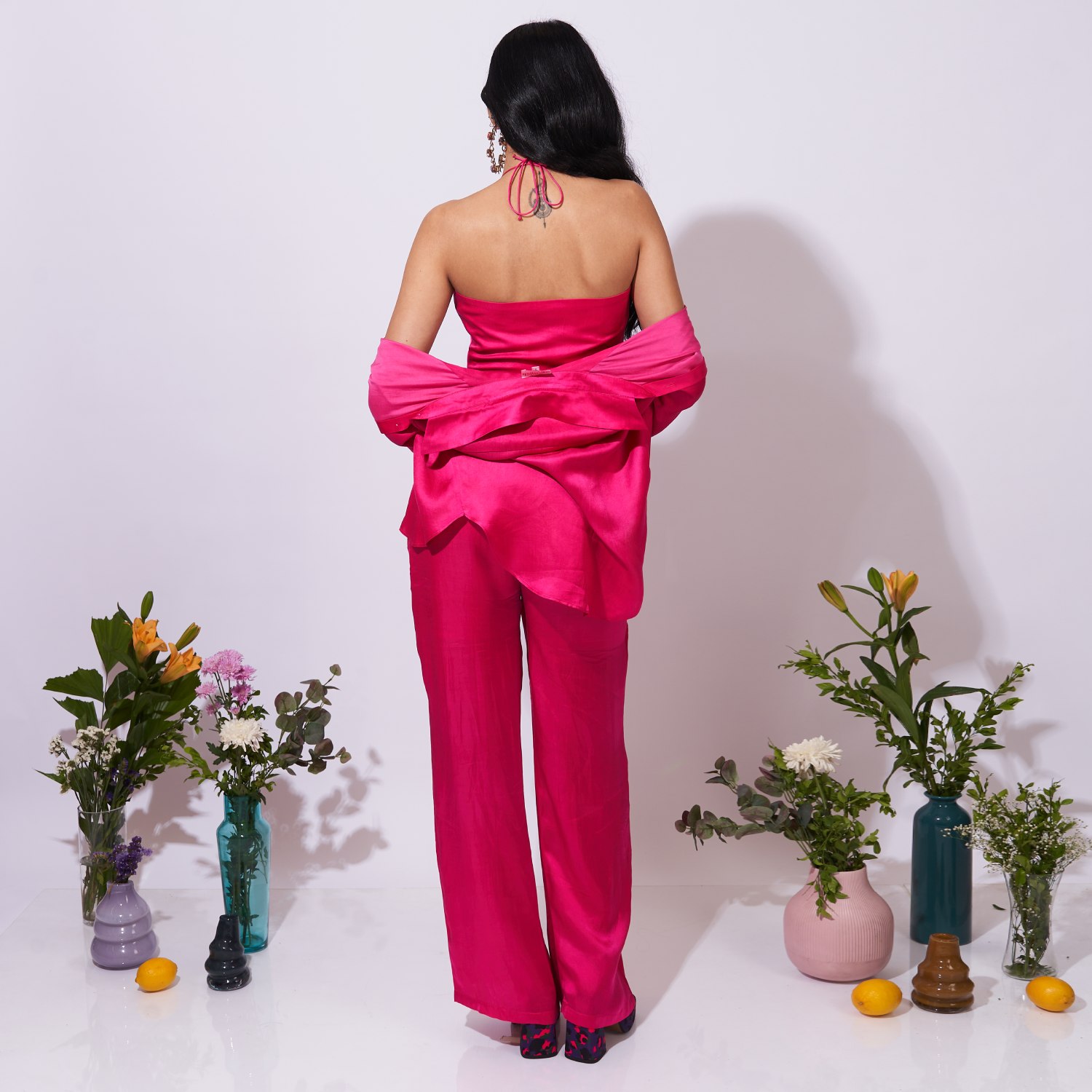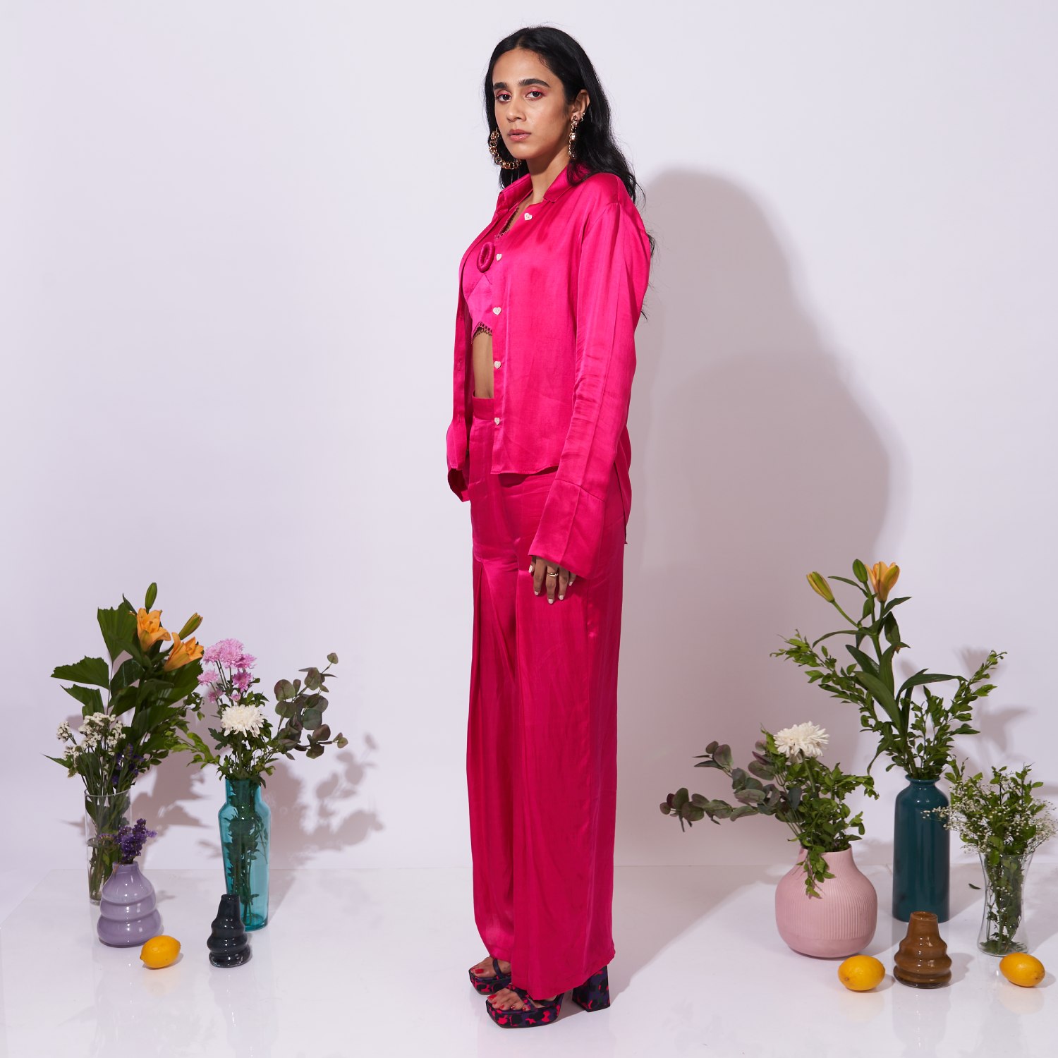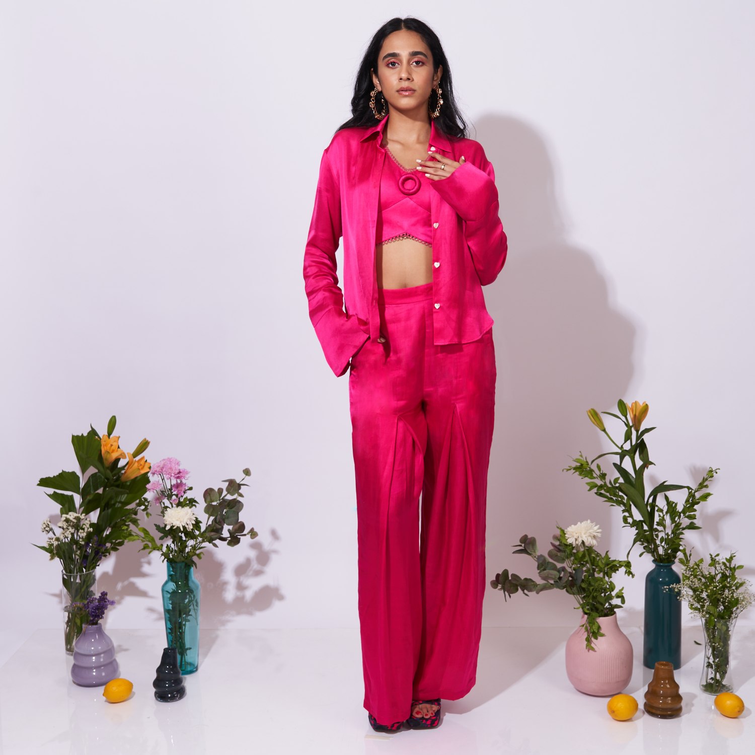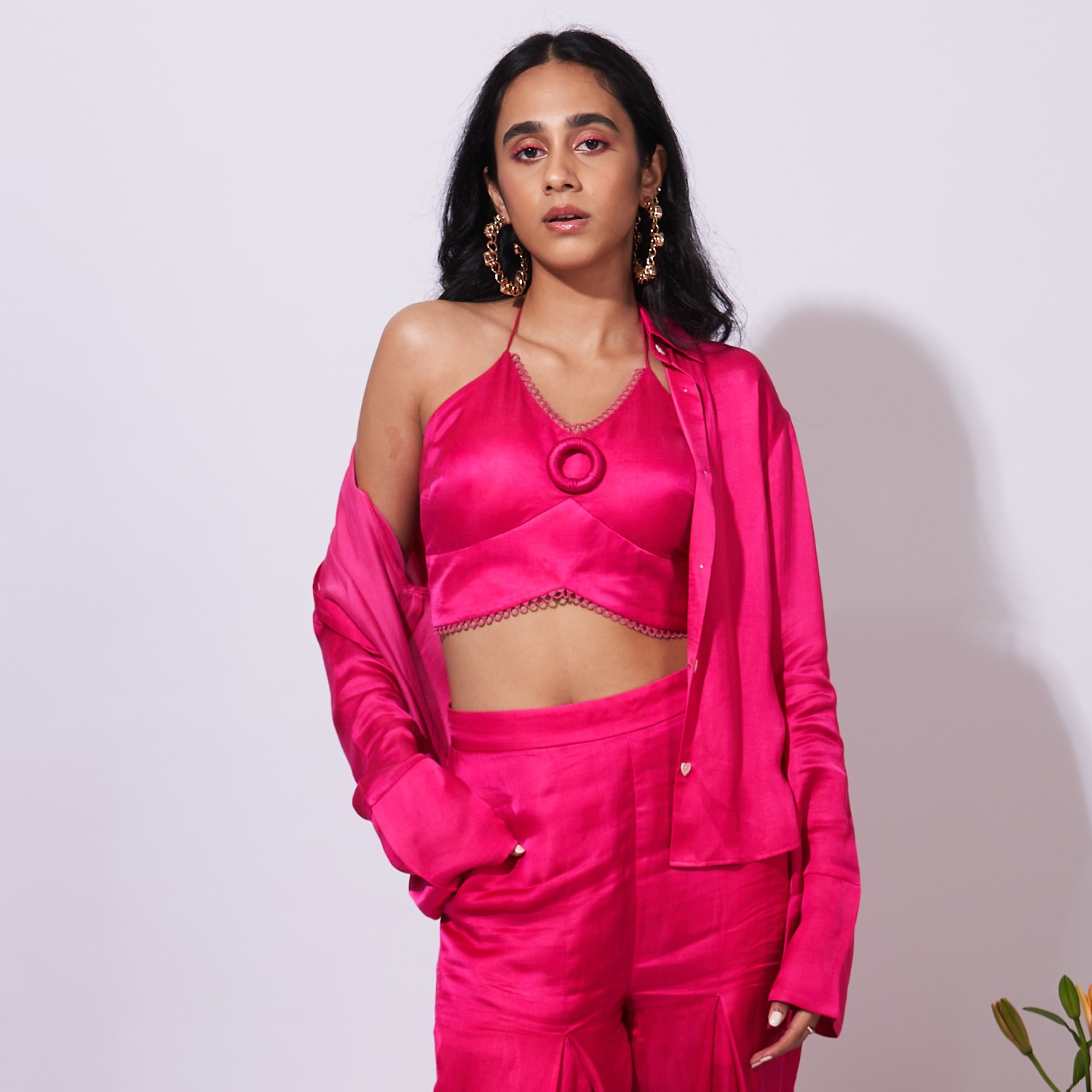 Unveil a captivating style with this three-piece coordinated set, which comprises a full-sleeve shirt with bell sleeves, high-waisted box-pleated trousers, and a tie-up top with cups. A digitally printed design, which combines contemporary aesthetics with classic elegance to create a sleek and adaptable fashion statement, adds to the ensemble's appeal.