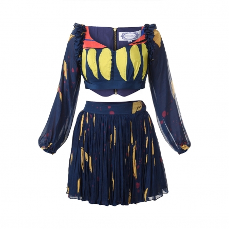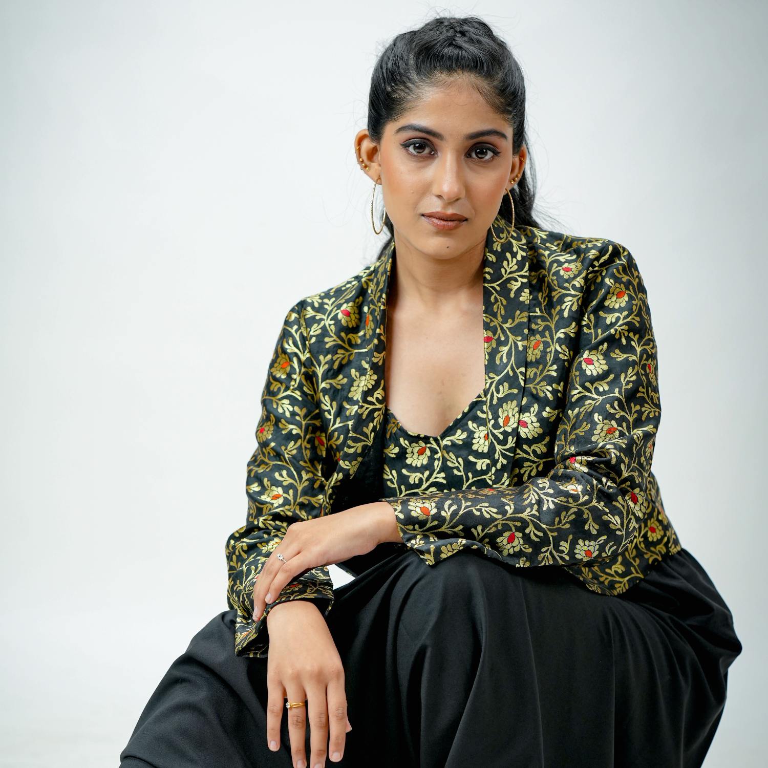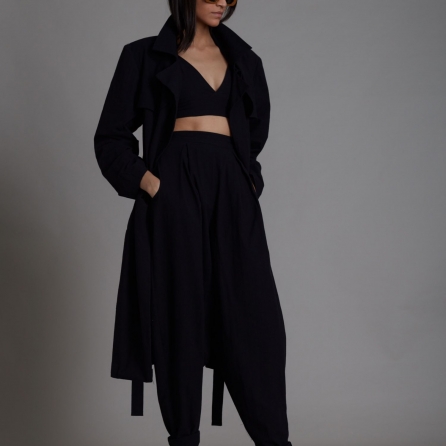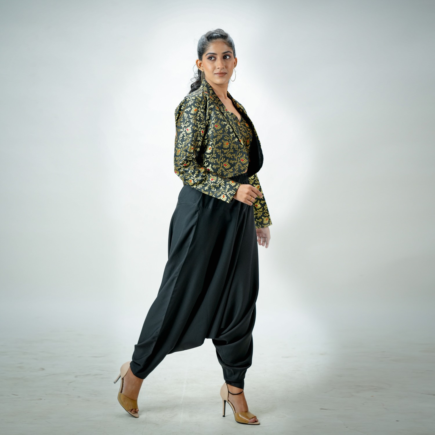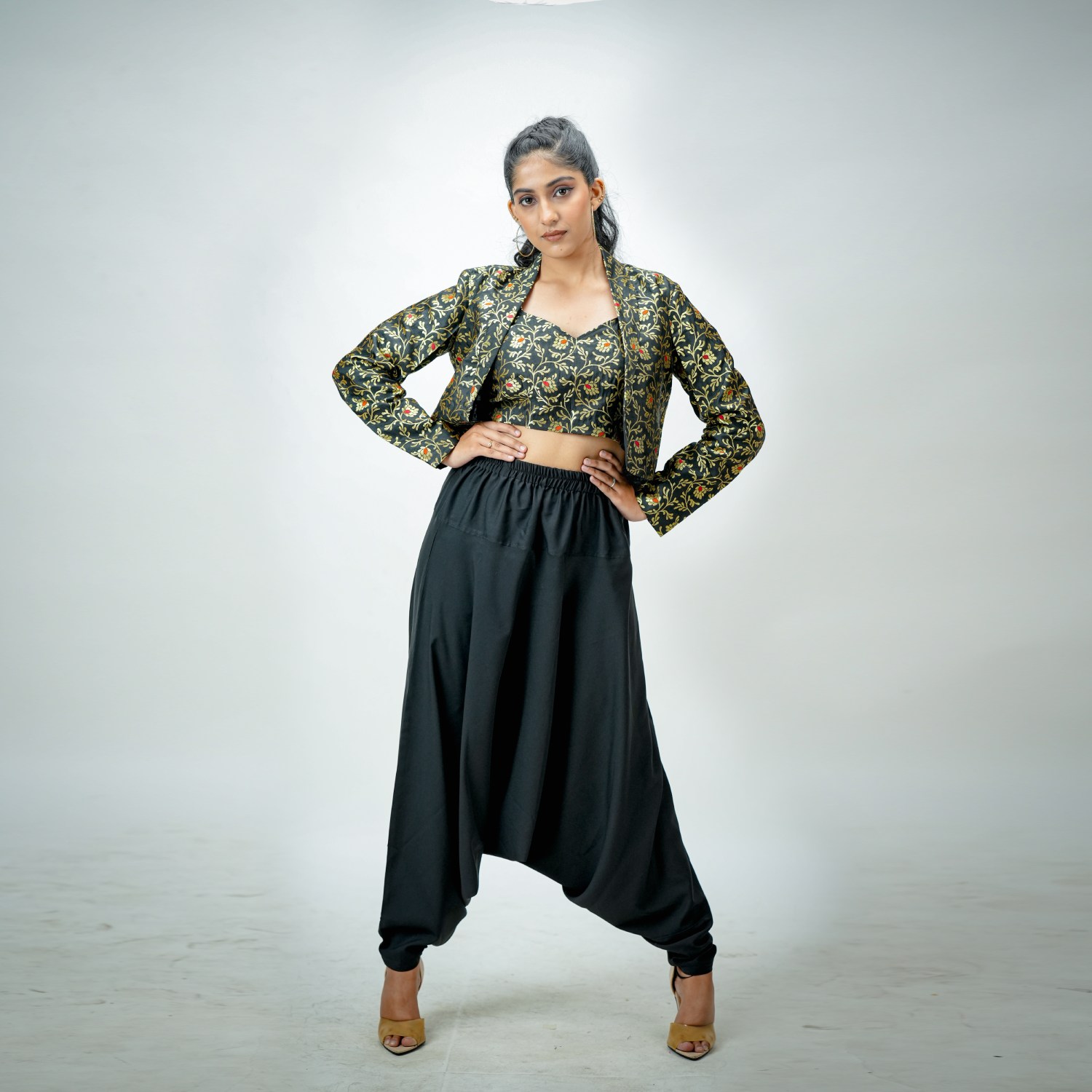 Indulge in style with a black brocade bustier and blazer ensemble seamlessly paired with crepe harem pants. This chic combination exudes sophistication, offering a modern twist on traditional elements. The brocade bustier and blazer effortlessly complement the crepe harem pants, creating a fashionable and versatile look suitable for various occasions.