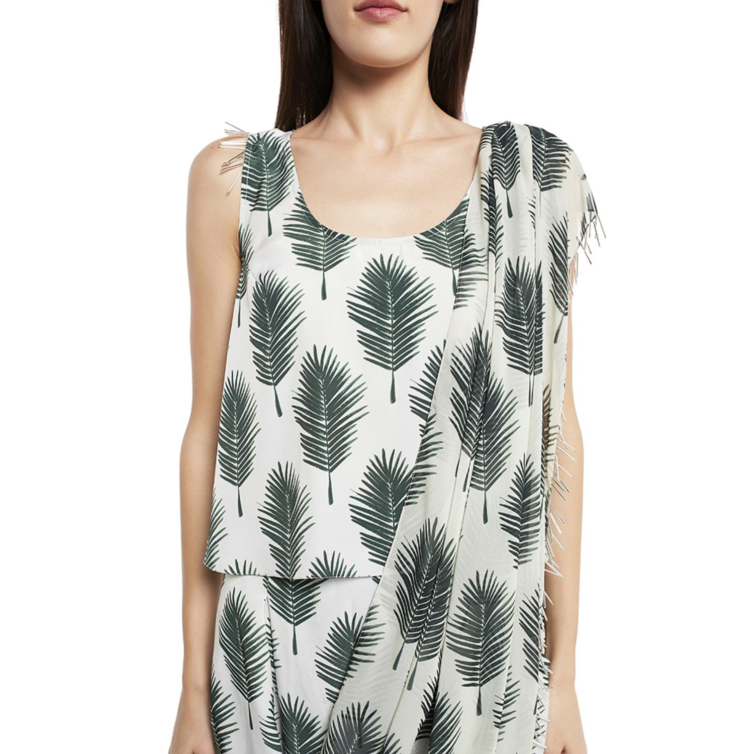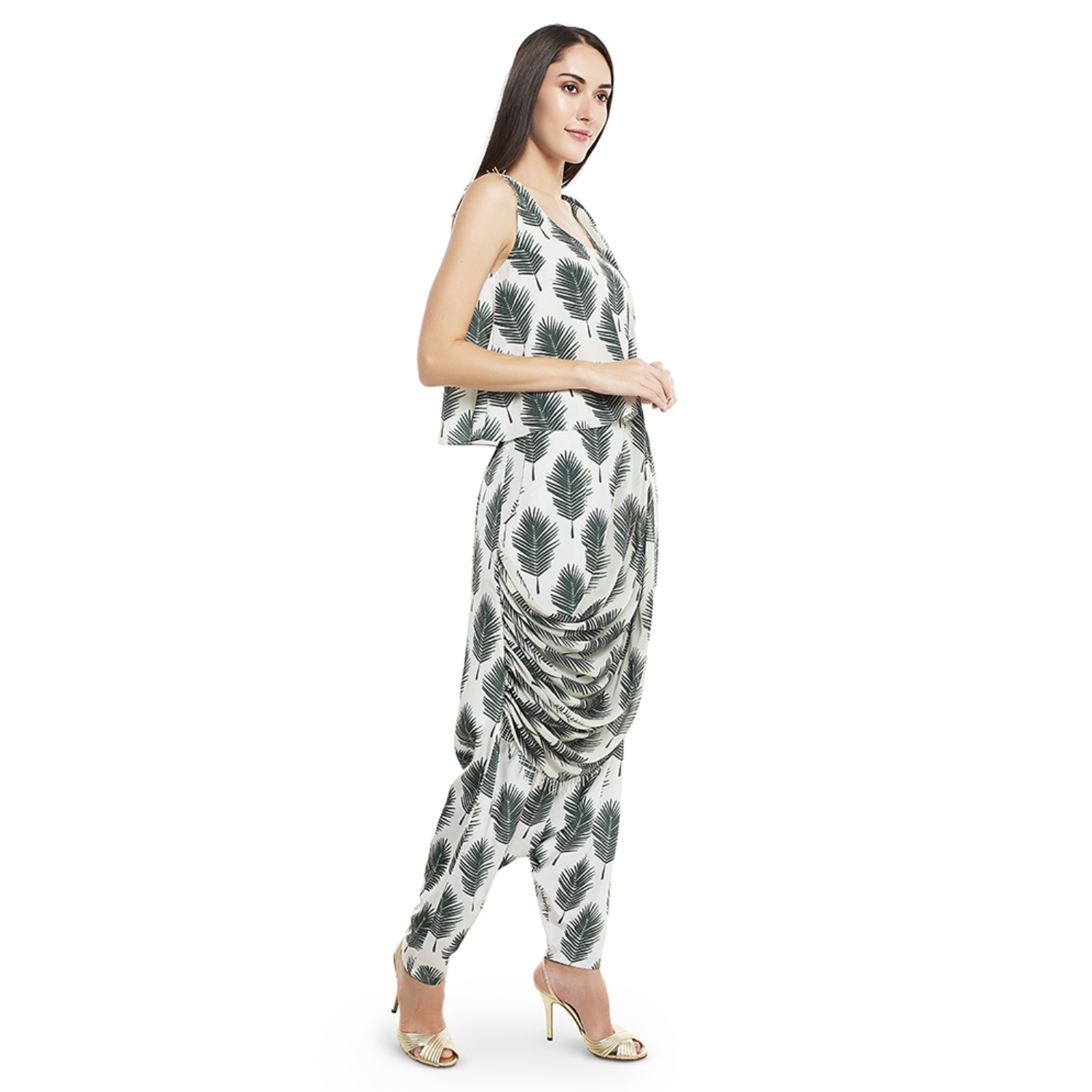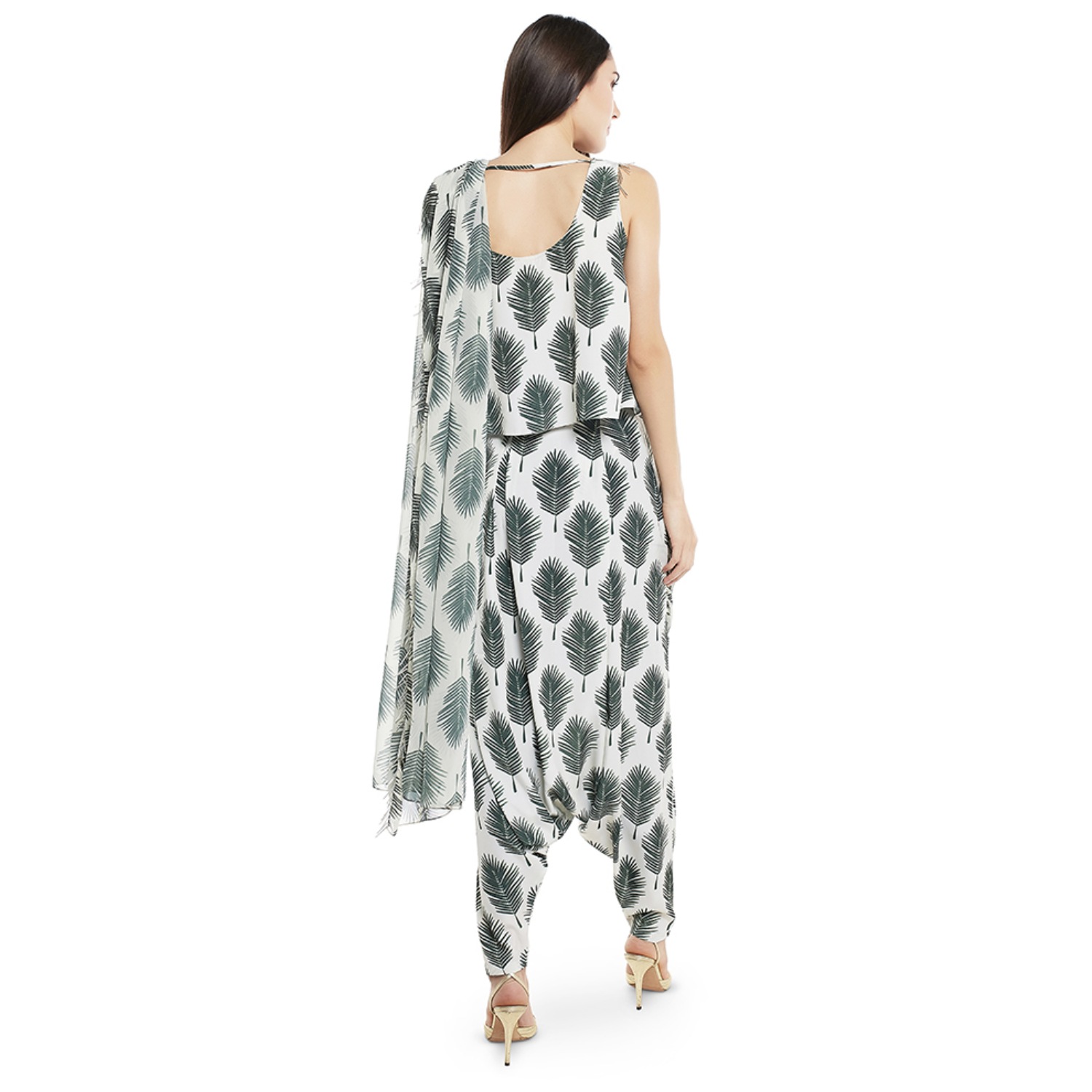 The cream art crepe top with low crotch pant and attached art georgette drape dupatta makes for a sophisticated ensemble. The top paired with low crotch pants, offers contemporary style. The attached georgette drape dupatta adds an elegant touch creating a versatile and fashionable outfit for various occasions.