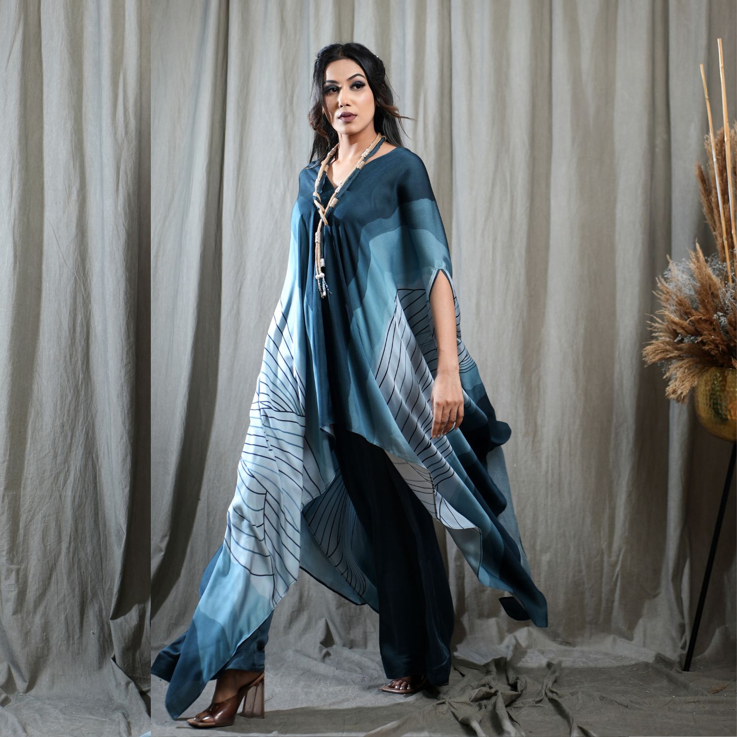 Discover the allure of this dark blue v neck printed long and short cape. With stylish slit sleeves, this cape exudes modern elegance. Complete the look with a complimentary handcrafted necklace, adding a touch of uniqueness to your style. Paired with flared-fit solid color pants, this ensemble promises a chic and graceful appearance. Embrace the charm and versatility of this fashionable outfit, perfect for making a statement on any occasion.