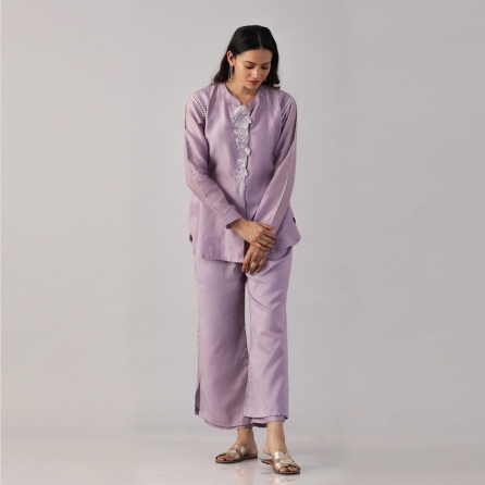 Adorn a chic ensemble with the ivory and pink floral digitally printed soft modal base fabric co-ord set. This stylish outfit is paired with matching printed pants, showcasing a perfect blend of comfort and trendiness. Ideal for those desiring a contemporary look that effortlessly combines elegance with vibrant floral aesthetics.