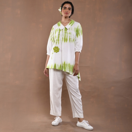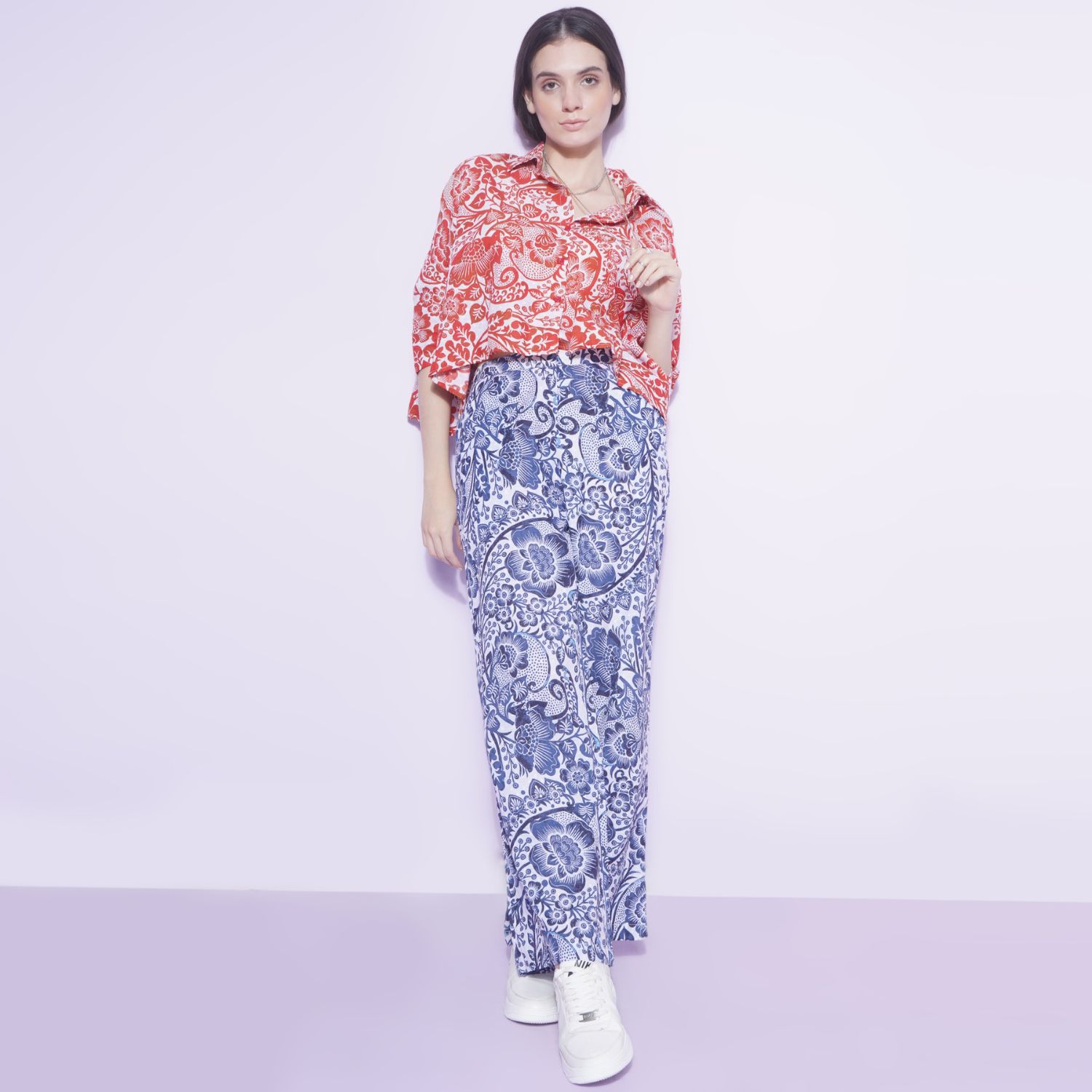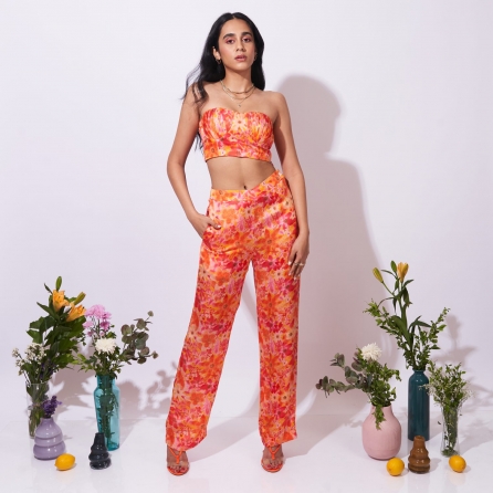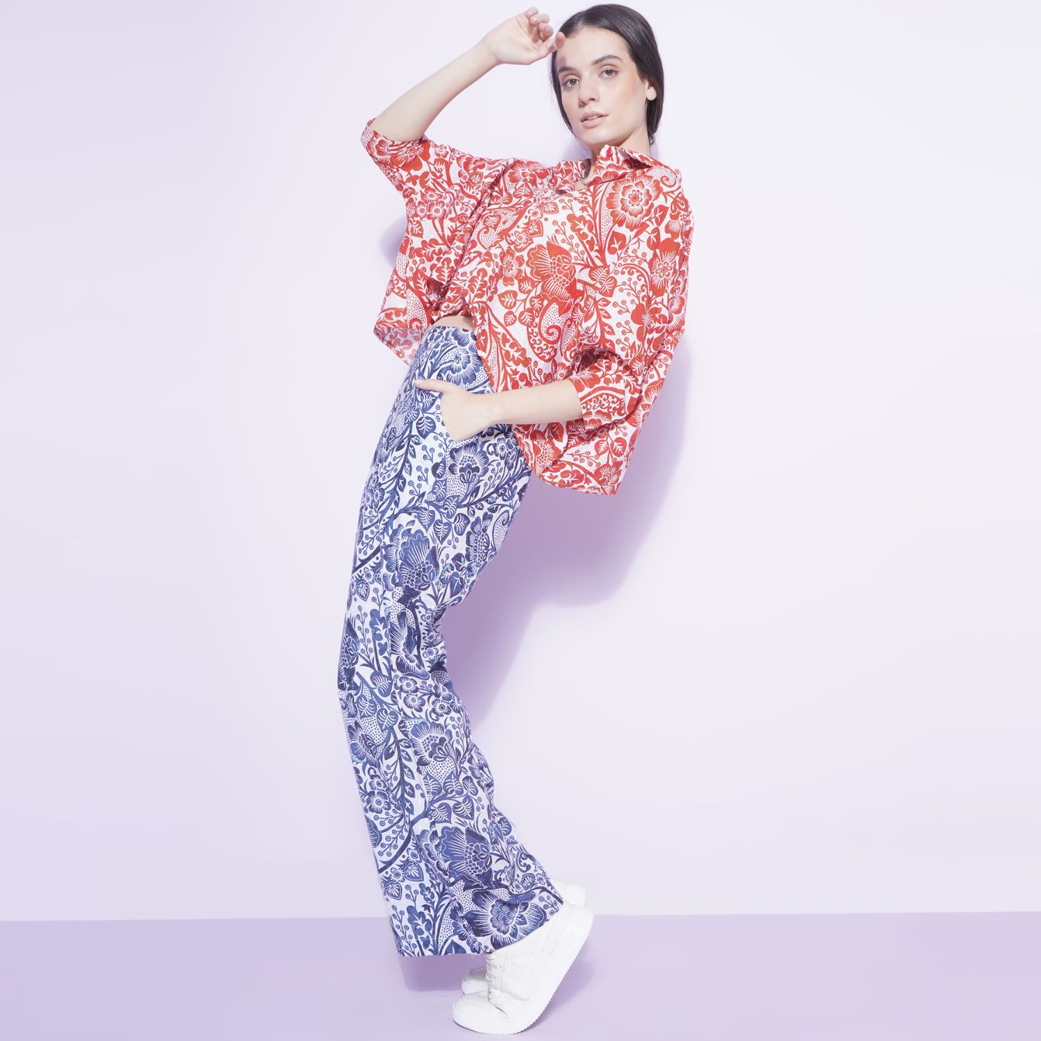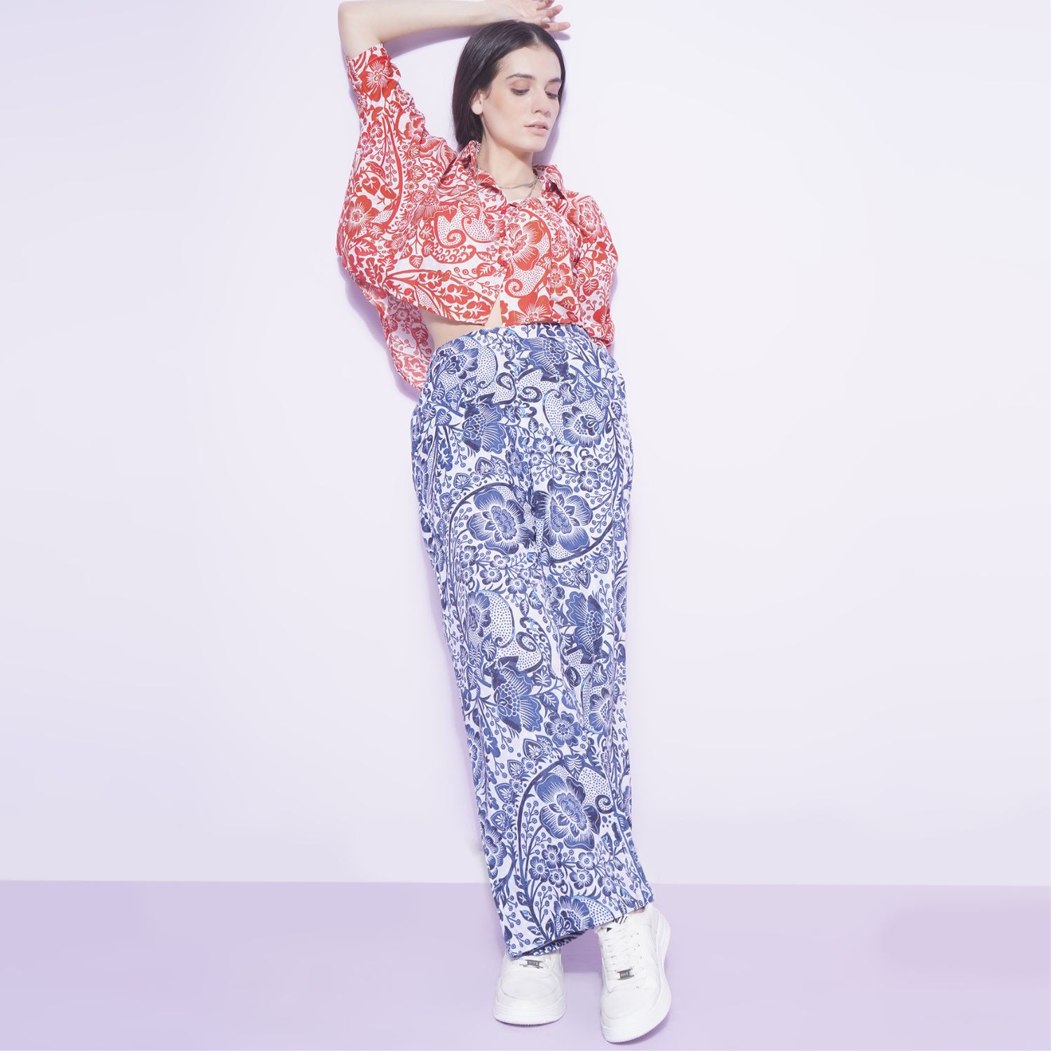 ₹ 4,200 (20% off)Crafted from soft cotton fabric, this stylish co-ord set includes a trendy crop shirt and wide-leg pants. The shirt has a beautiful orange floral print, and the pants have a blue floral design. Pair this set with statement earrings and a sling bag for a fun day with friends.