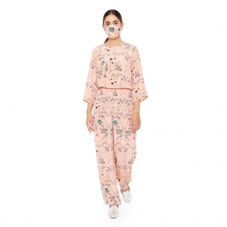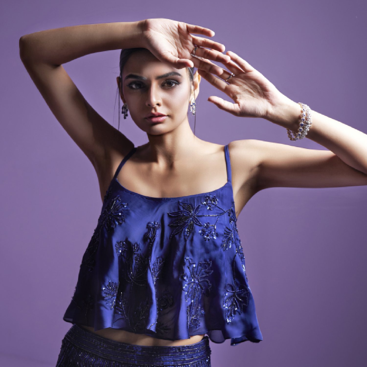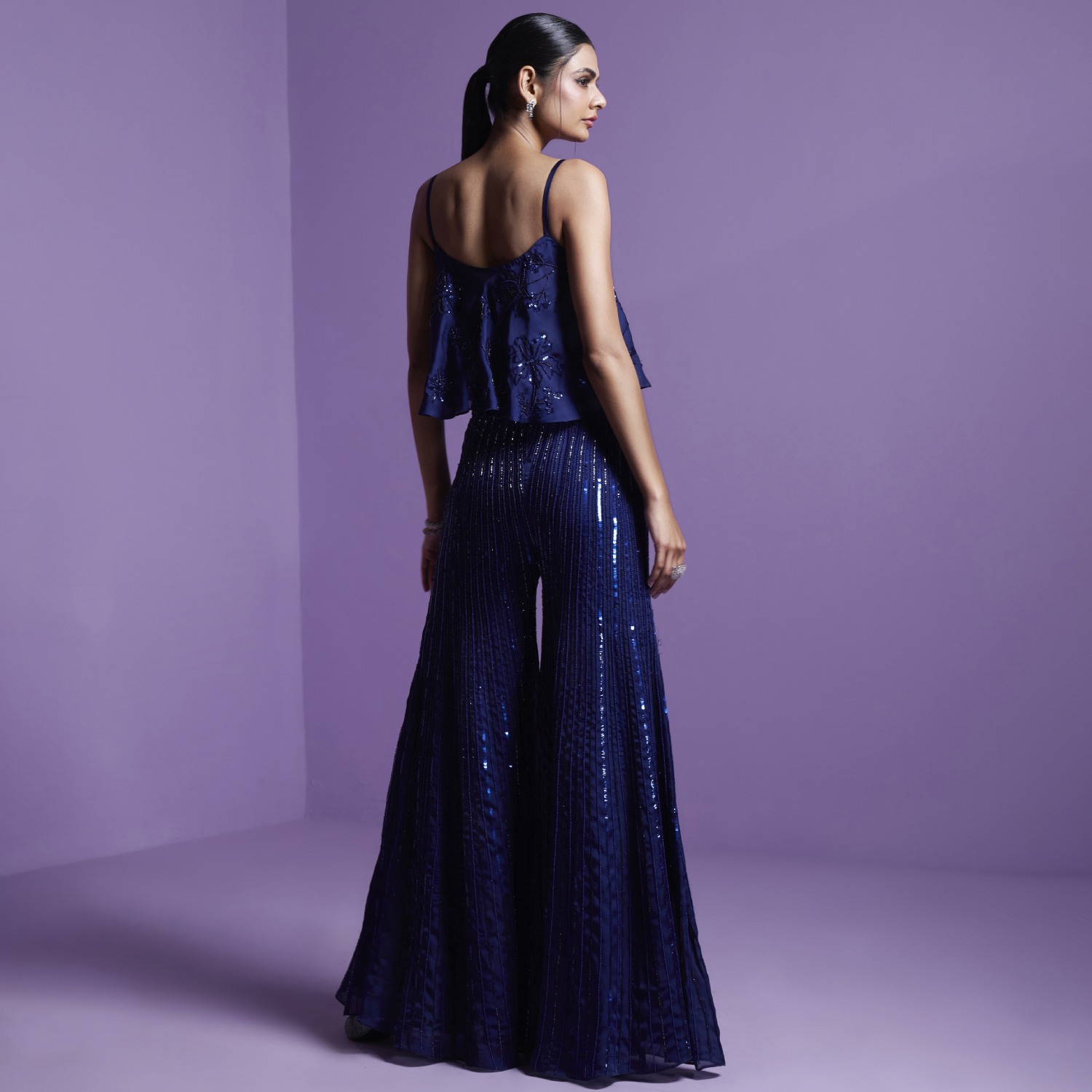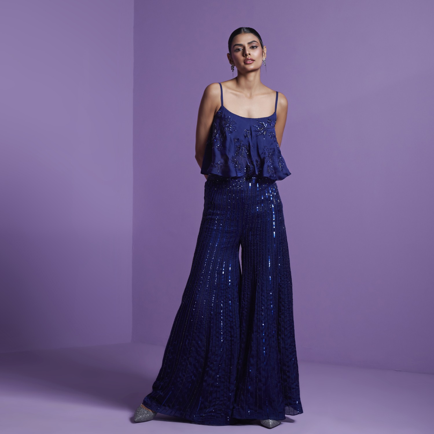 ₹ 42,000 (5% off)Crafted from luxurious satin fabric, this set comes in a rich blue shade. This set has a strappy short top with intricate embroidery and a flowy fit. The top is paired with matching palazzo that are embellished with tonal sequins, moti and cutdana work. Style it with dangling earrings and a sling bag for cocktail parties or receptions.