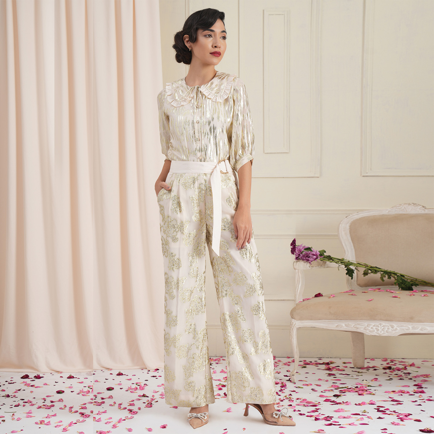 ₹ 12,150 (10% off)This co-ord set is crafted from georgette lurex foil, giving it a subtle shimmer. It features a semi-crepe lining, a relaxed fit and a jacquard pattern. Style it with dangling earrings and contrasting heels for a dressy evening event.
