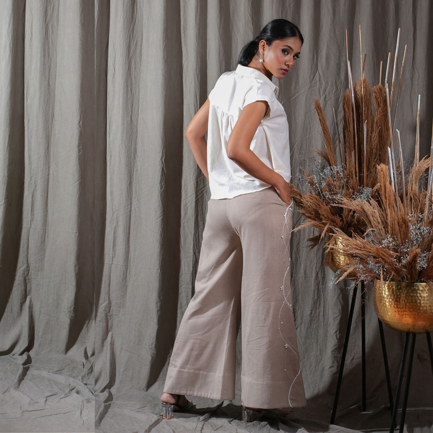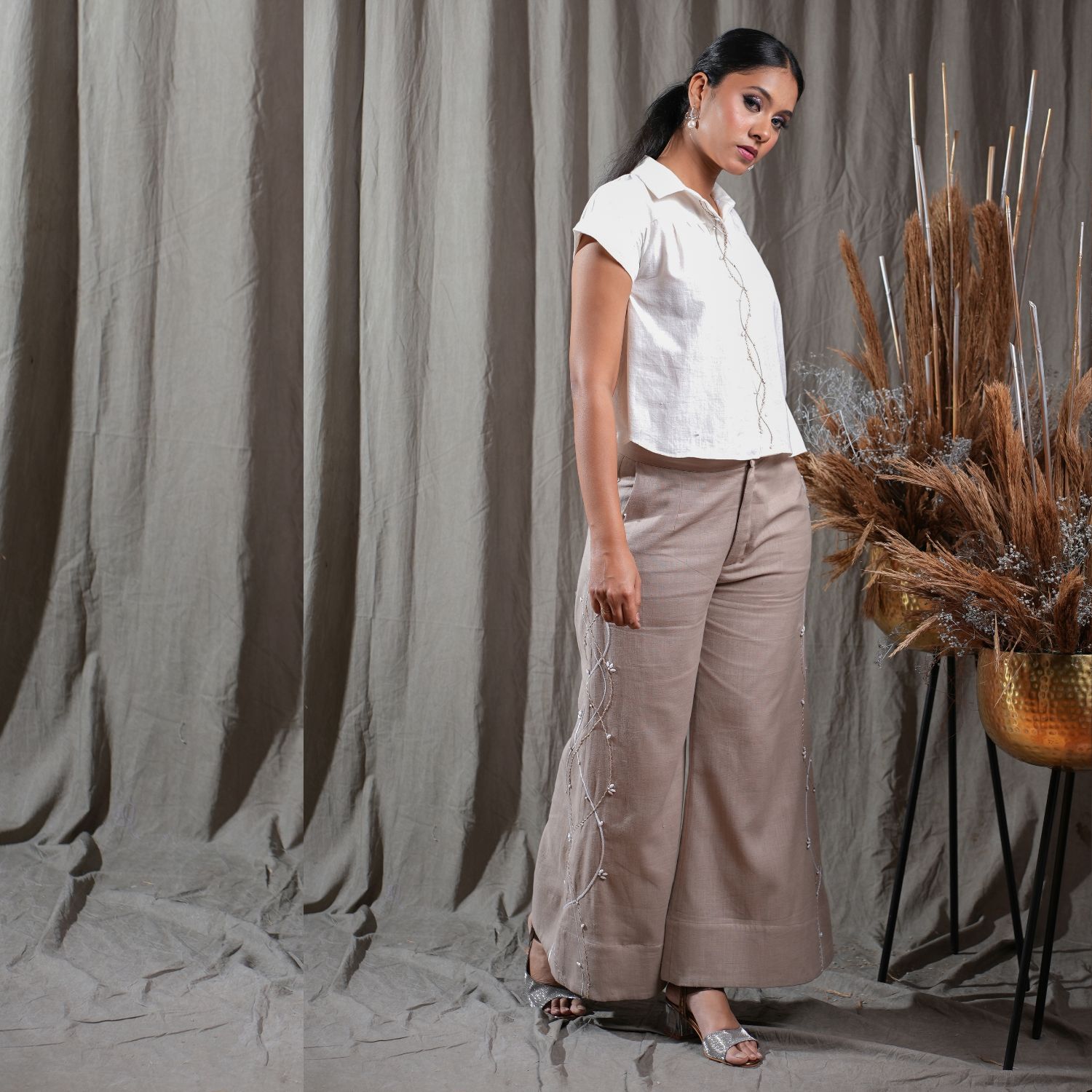 Introducing this beige exquisite extended sleeve placket embroidered shirt. Adorned with intricate embroidery and featuring extended sleeves, this shirt exudes elegance. Paired with full-length side-embellished flared pants, this ensemble adds a touch of sophistication to your style. Embrace the charm and grace of this fashionable outfit, perfect for making a statement on any occasion.