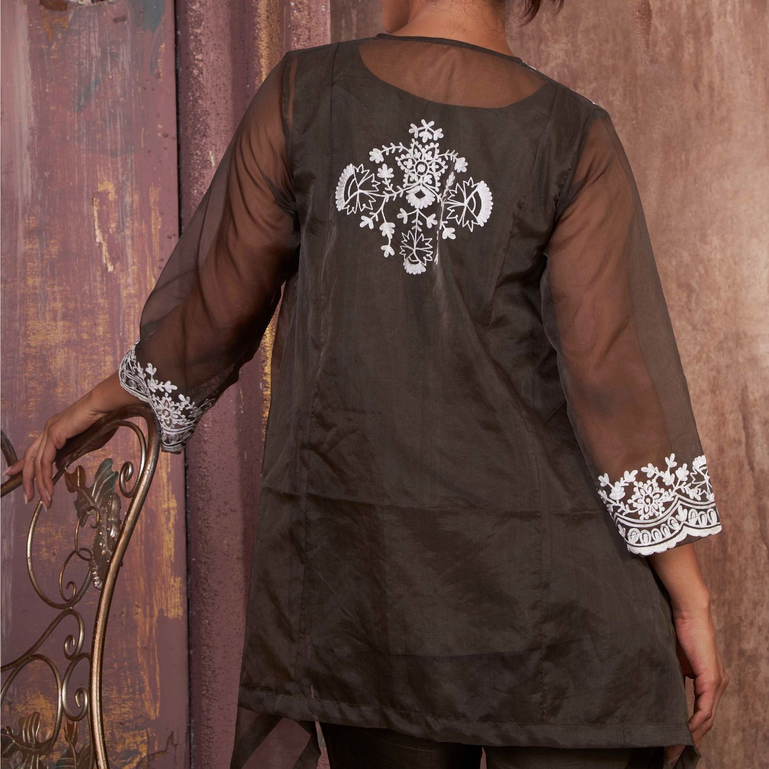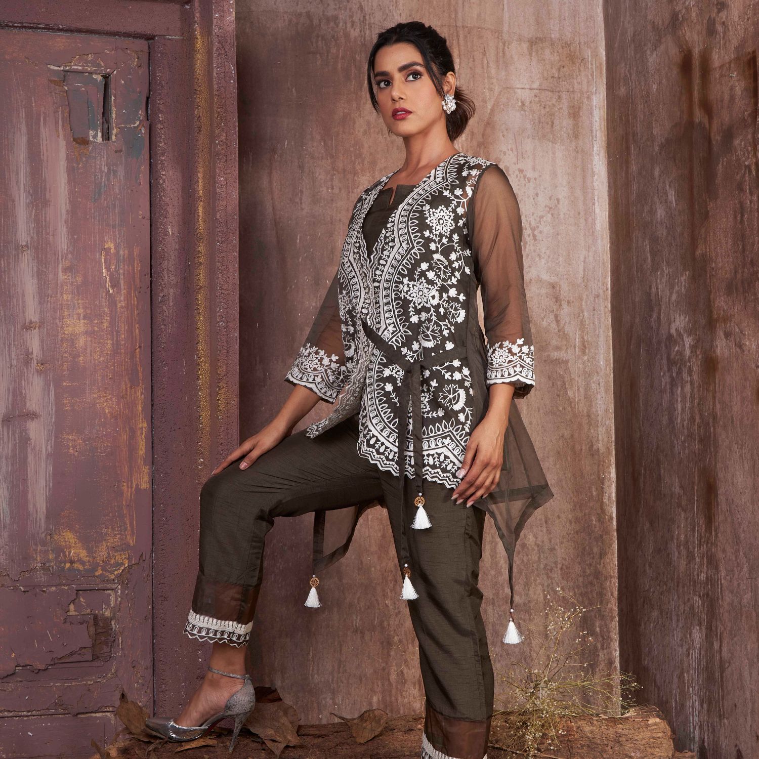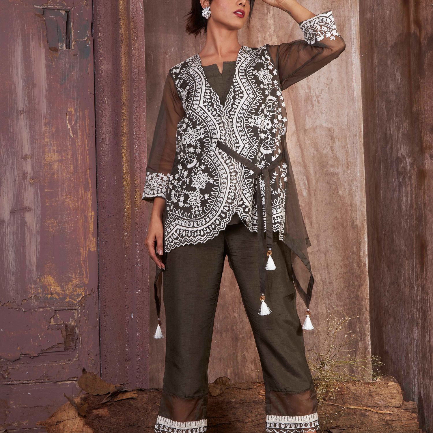This elegant & timeless military green co ord set features ivory cross stich embroidery and delicate tie up details. Style this set with pearl studs to complete the look.