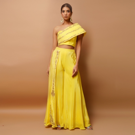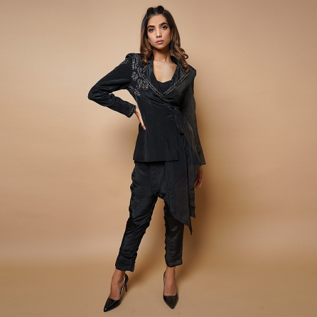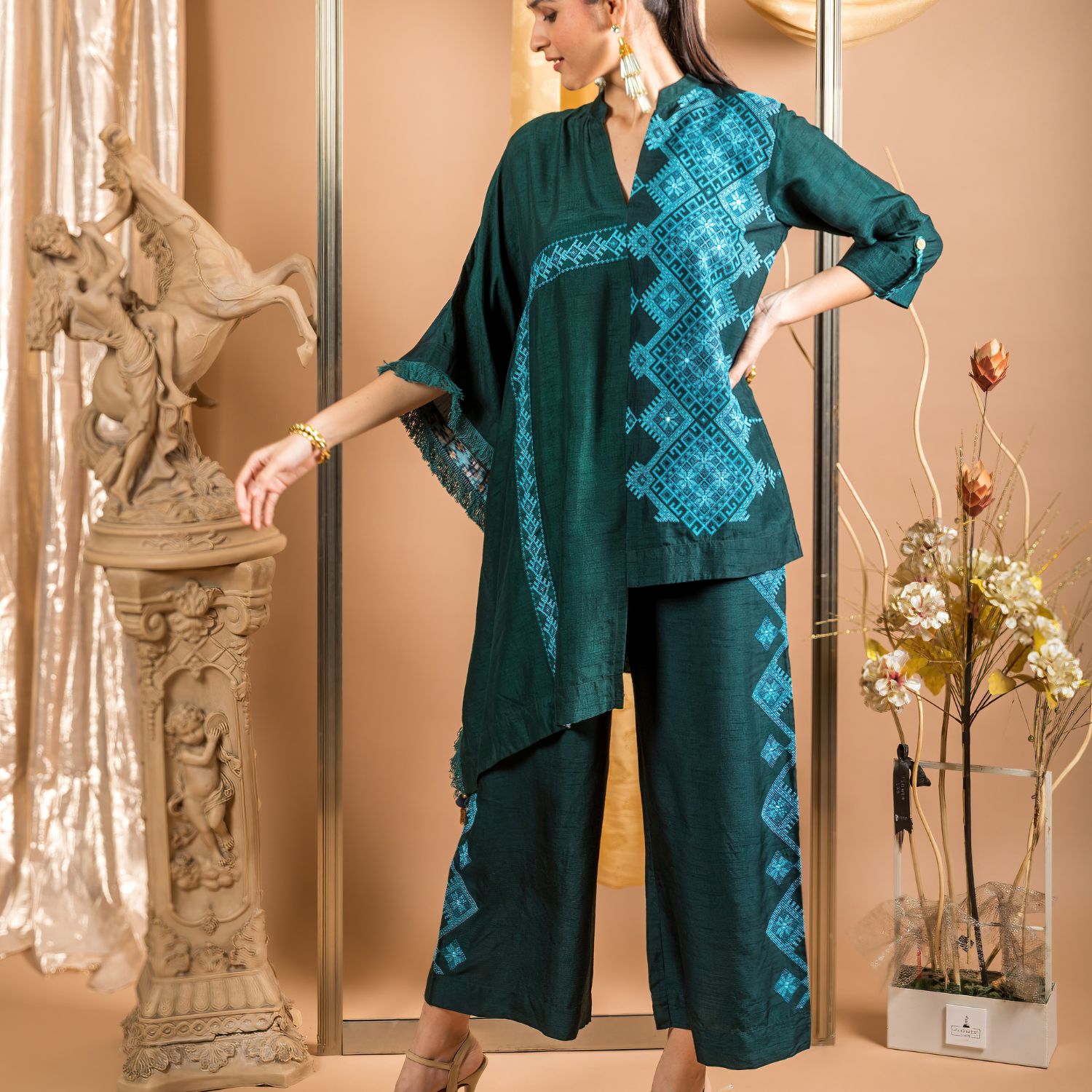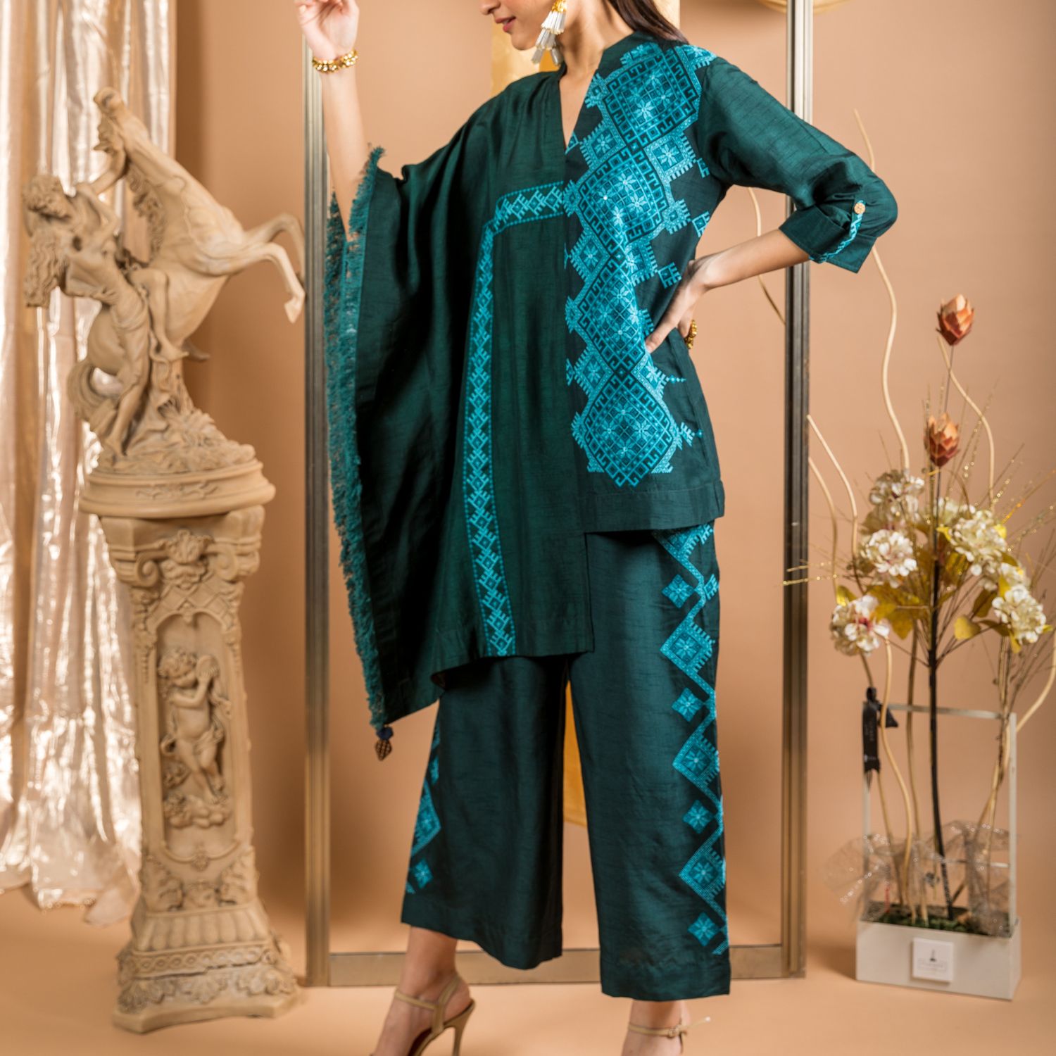 This statement emerald green co ord set is perfect for the festive season. The intricate blue cross stitch embroidery adds a pop of colour to this monochrome look. Style this set with statement studs to complete the look.
