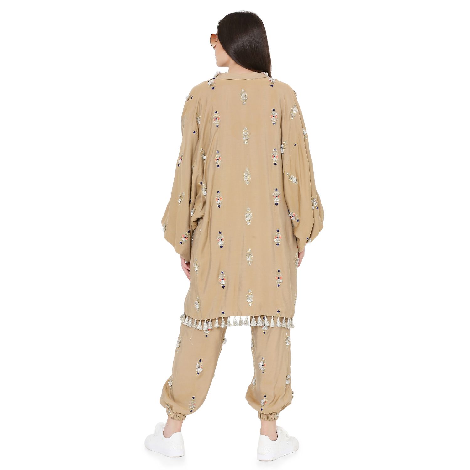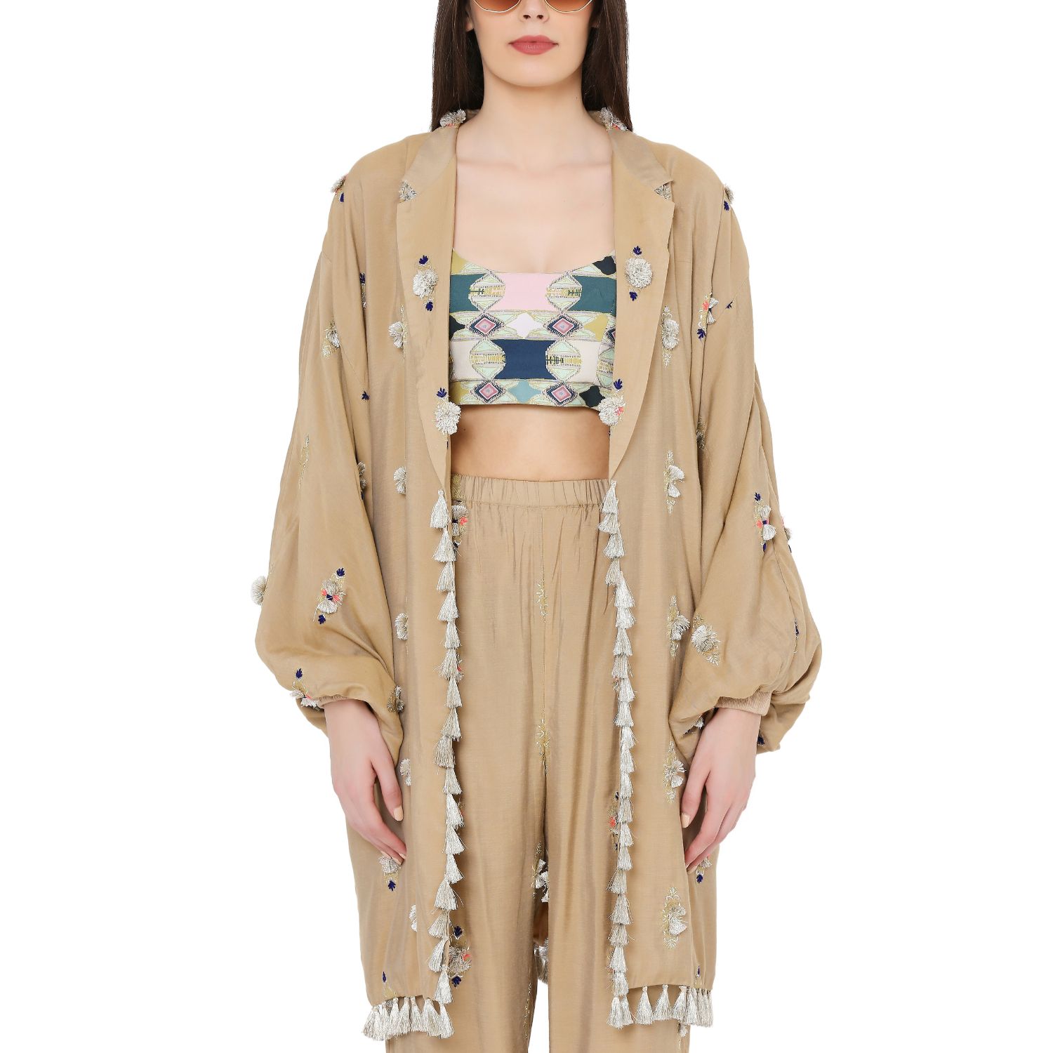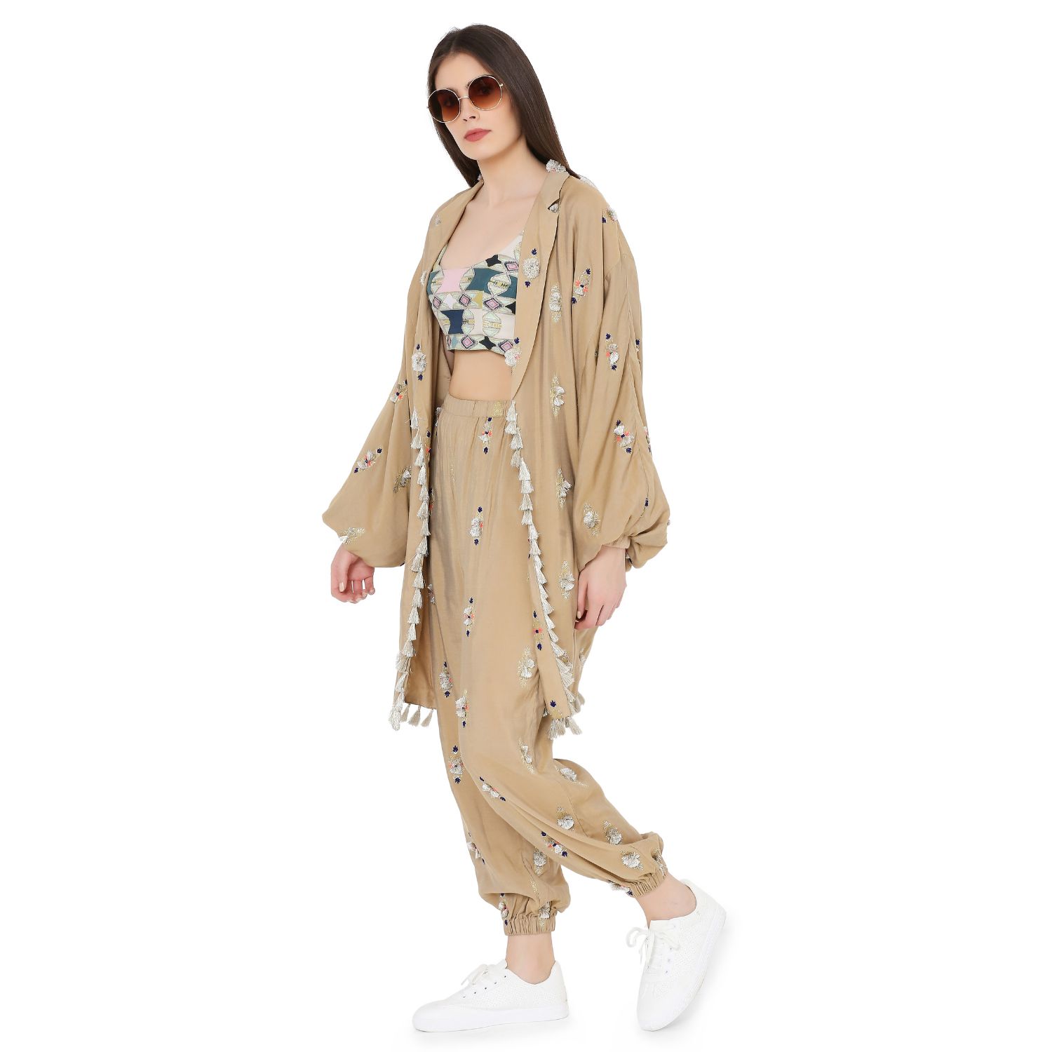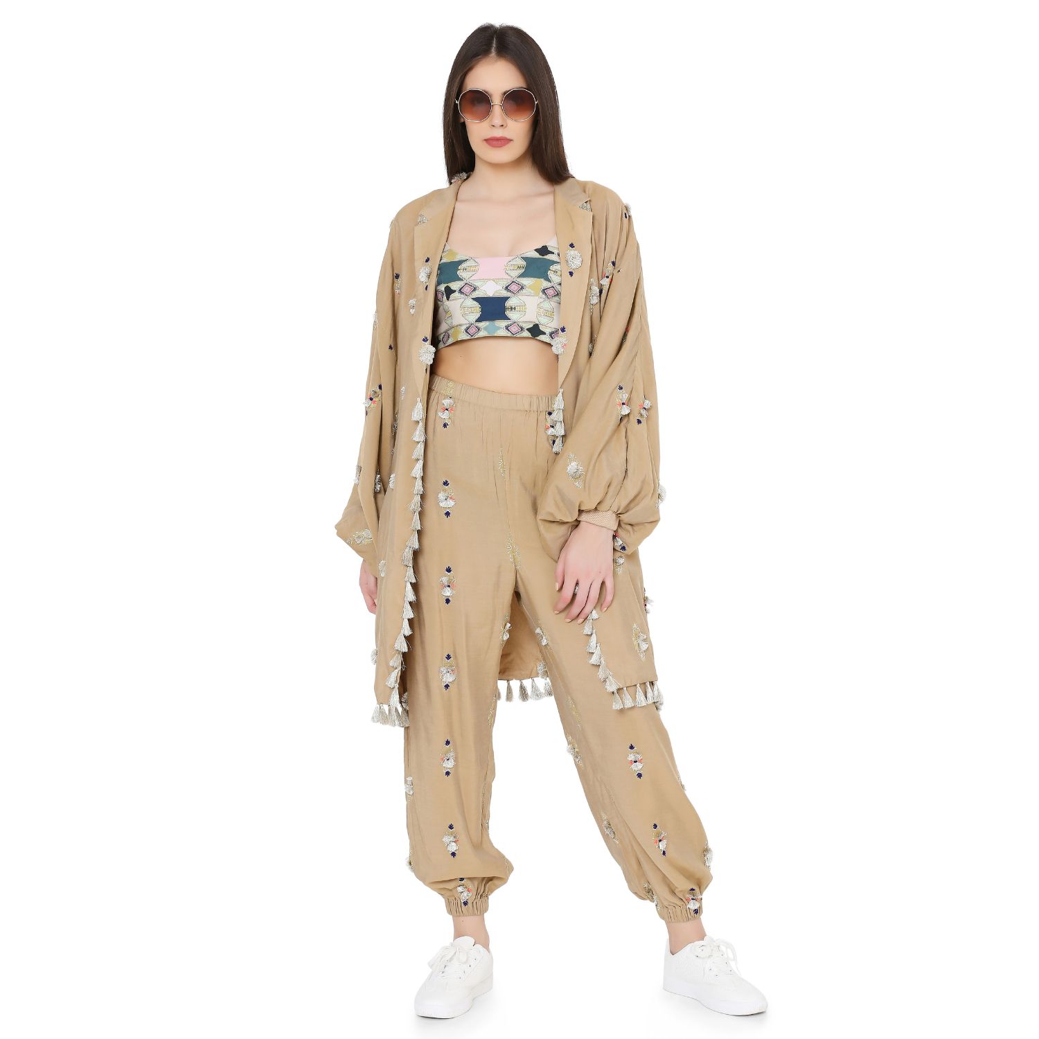 This exquisite embroidered brocade oversized jacket is beautifully accented with tassel detailing and is paired with comfortable joggers featuring a vibrant green aztec print. This set comes with a cotton rayon bustier. Elevate your style by pairing this outfit with statement earrings.
