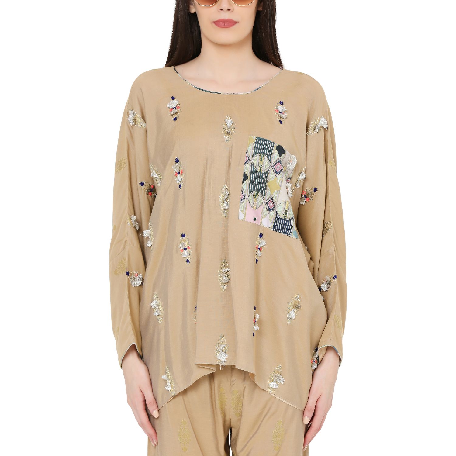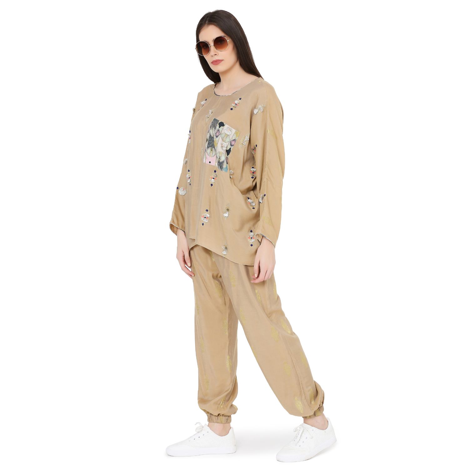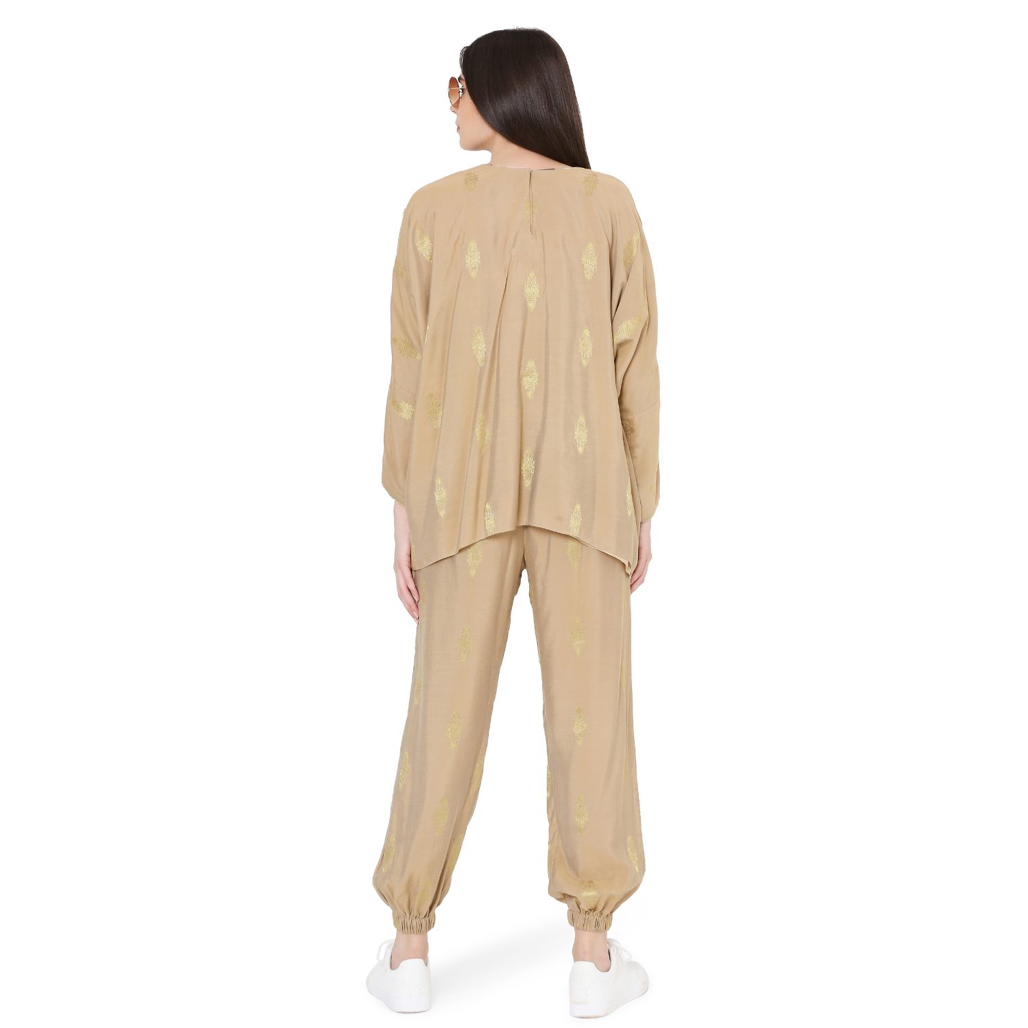 This gold brocade top & jogger set is both fashionable and functional. The oversized top features a green aztec print patch pocket and delicate embroidery details. The relaxed joggers perfectly pull the look together.
