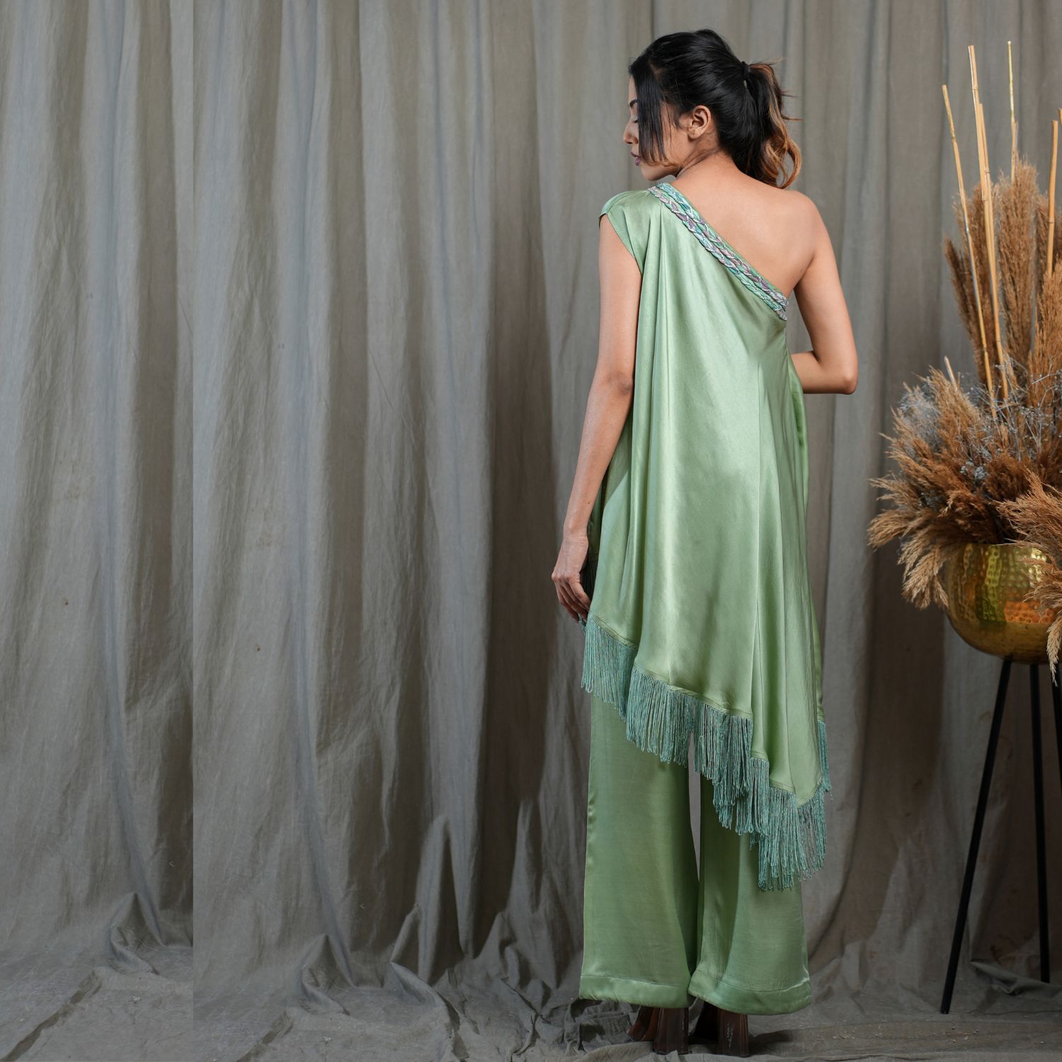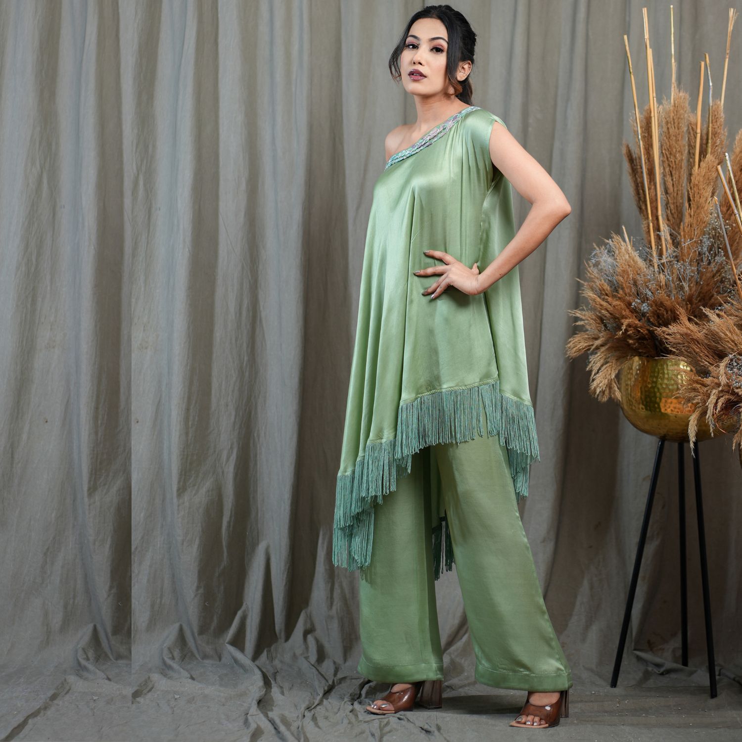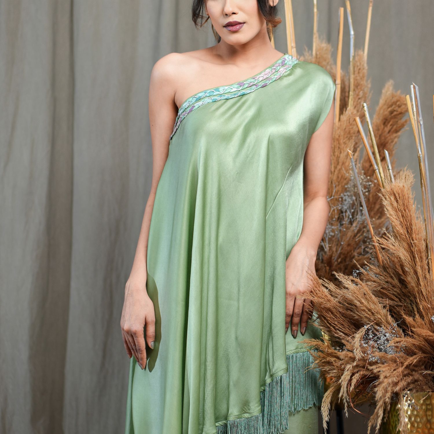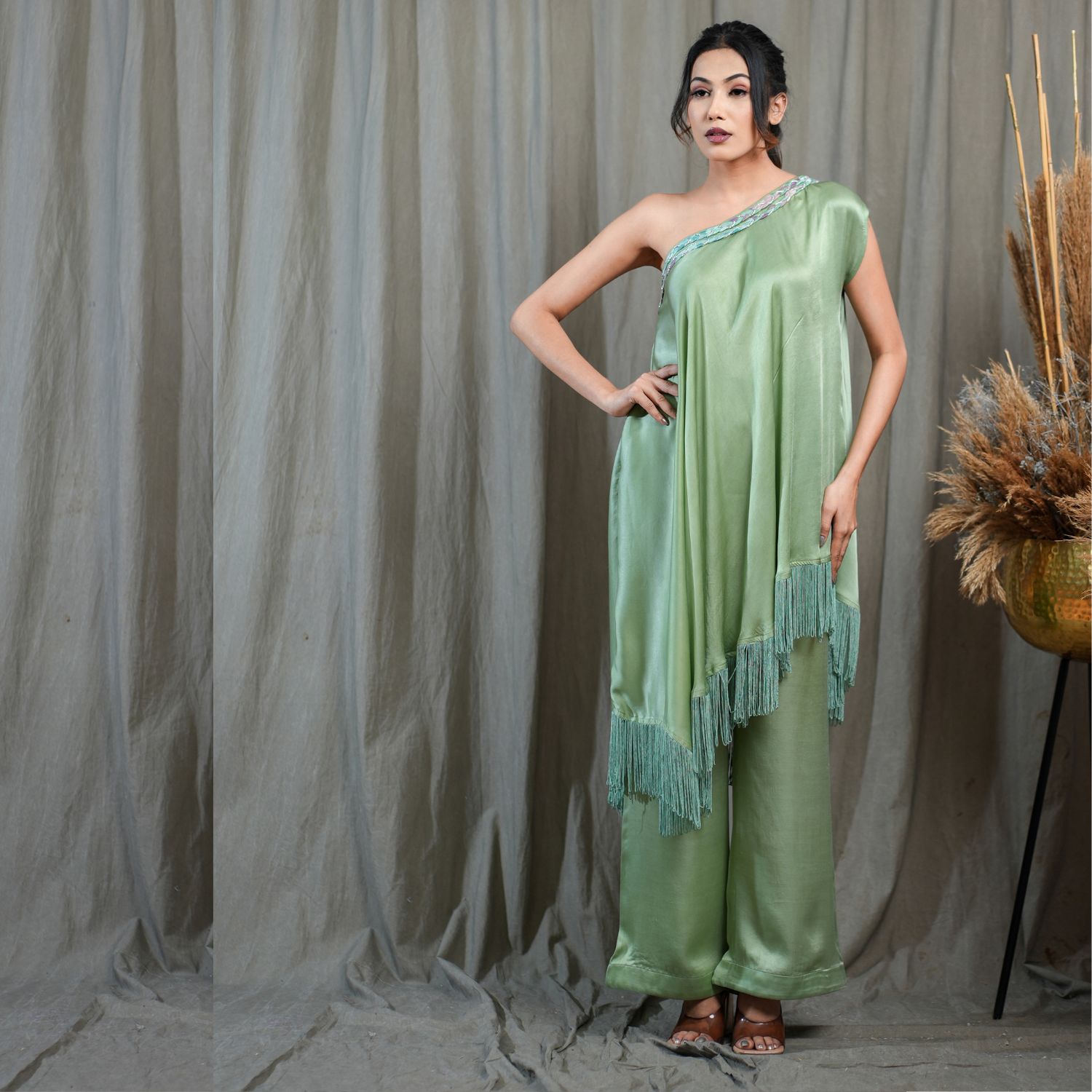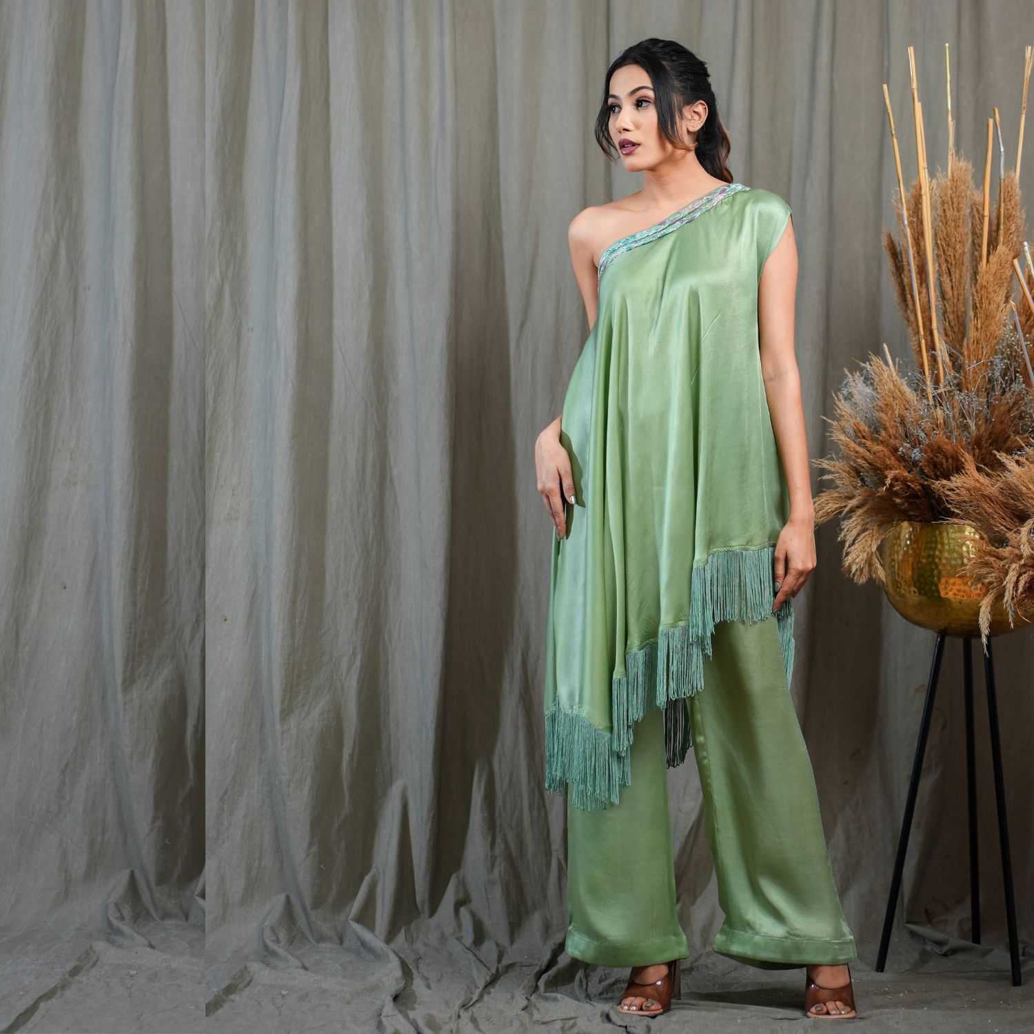 Introducing this captivating green one-off shoulder flared asymmetric tunic. Adorned with a braid detail neckline and fringed hem, this tunic exudes elegance. Paired with full-length pleated pants for a stylish look, this ensemble is perfect for making a fashion statement. Embrace the charm and grace of this outfit, ideal for any special occasion.