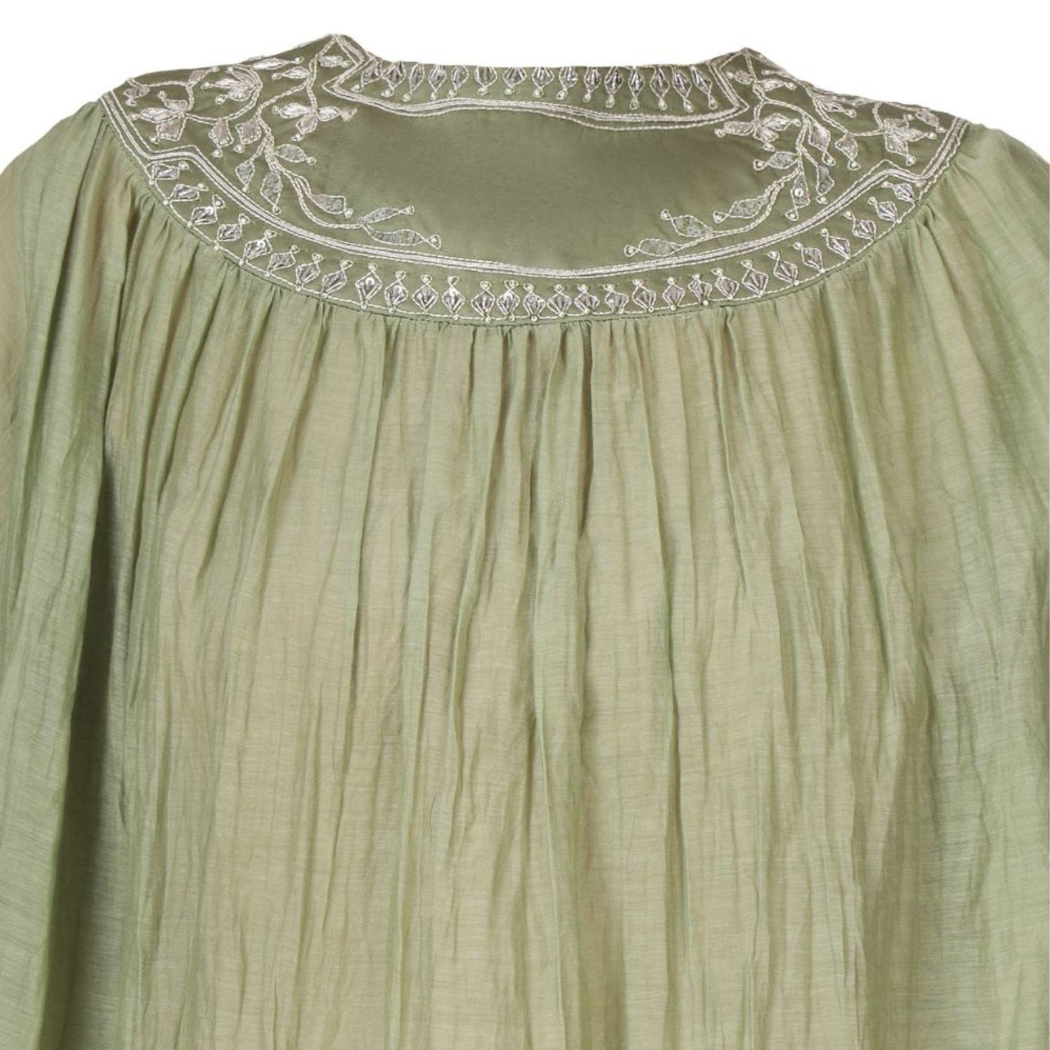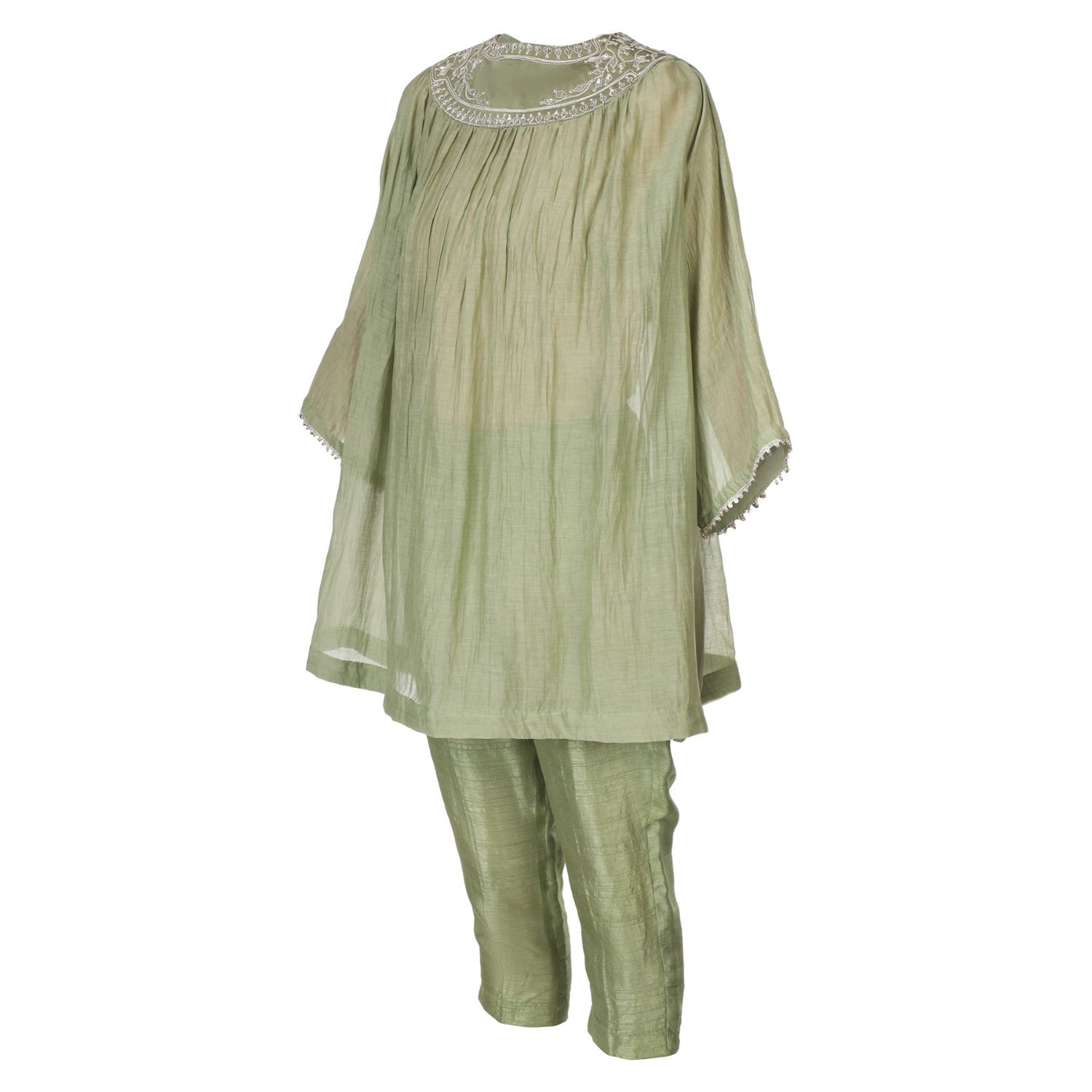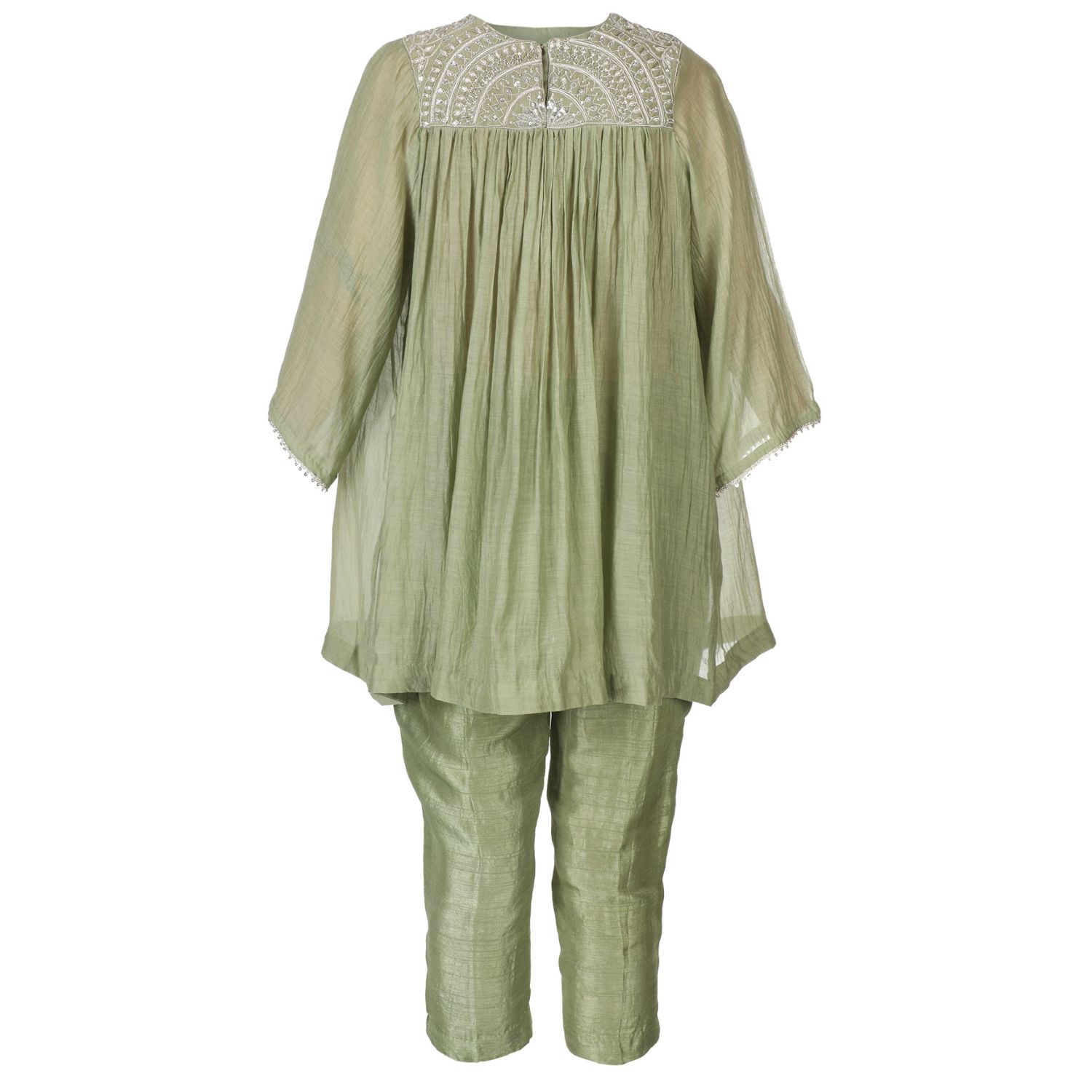 ₹ 10,584 (15% off)Make a statement of magnificence with our ensemble,featuring a heavily embroidered yoke and an effortless flowy silhouette. The tunic boasts intricate ektari embellishments on its sleeves for a touch of refined taste. Matched with raw silk tapered-fit pants, comfort and sophistication go hand in hand.