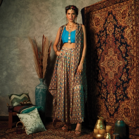 Handloom Brocade: 45% Art Silk, 30% Viscose, 25% Zari. Lining: 100% Polyester. Exposed button closure at center front.