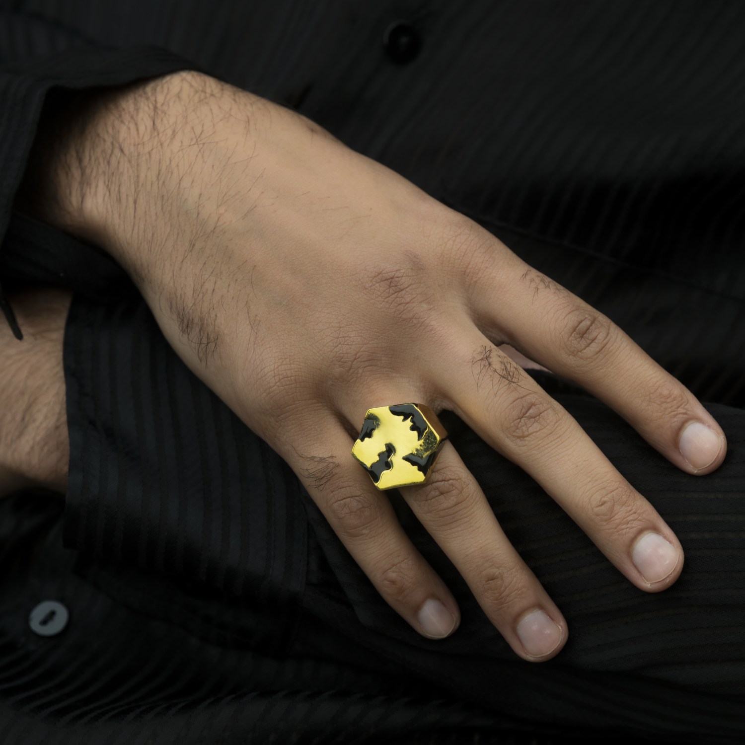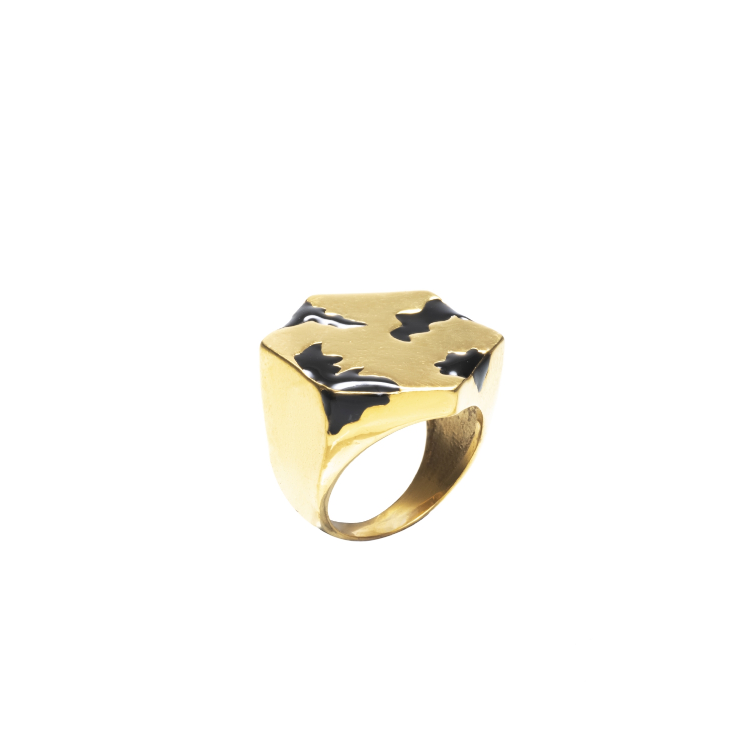 This ring is a stylish piece with a black design set on a gold-colored brass ring. It's a fashionable accessory that can add elegance to your outfit.