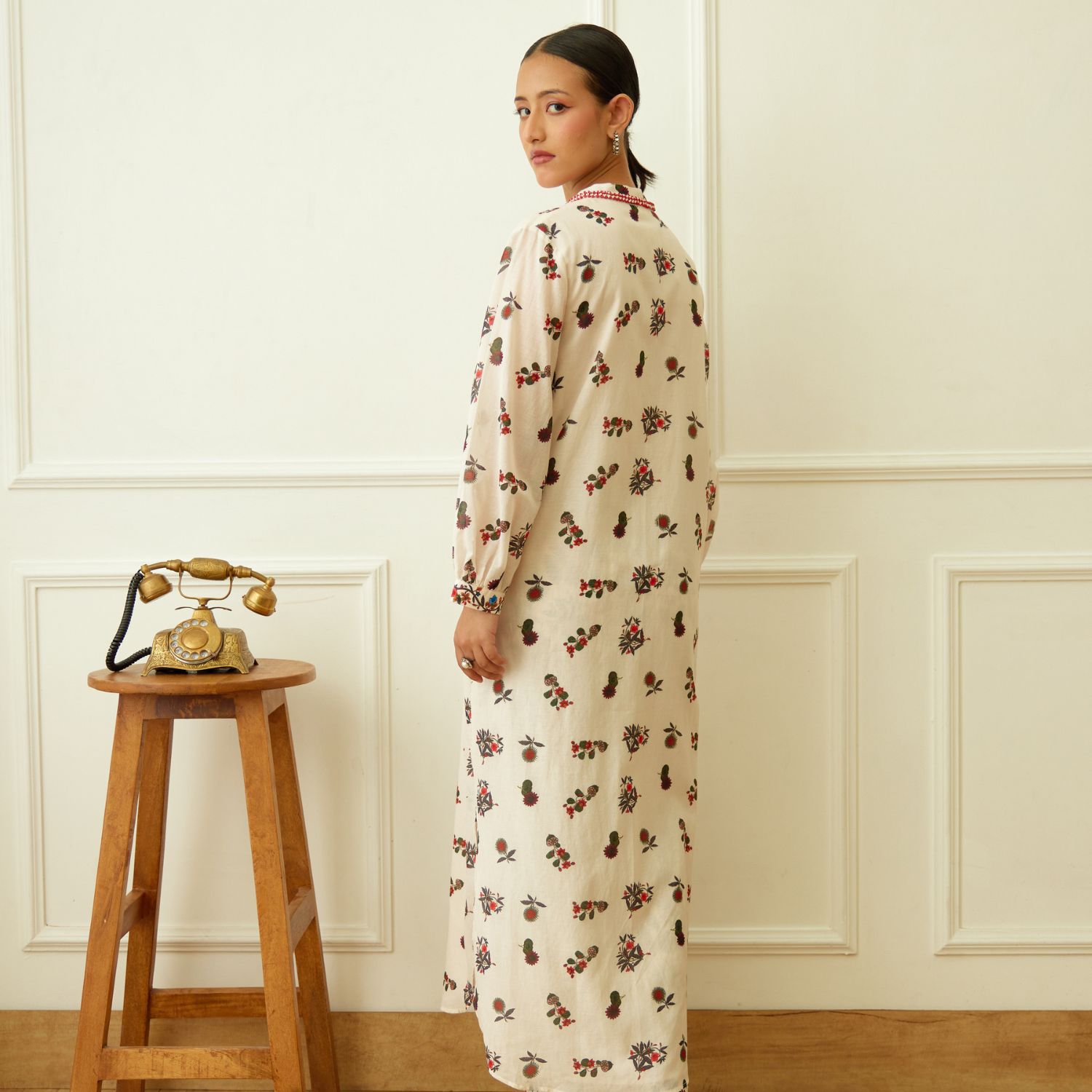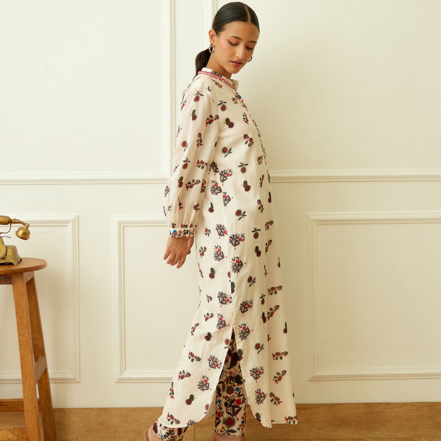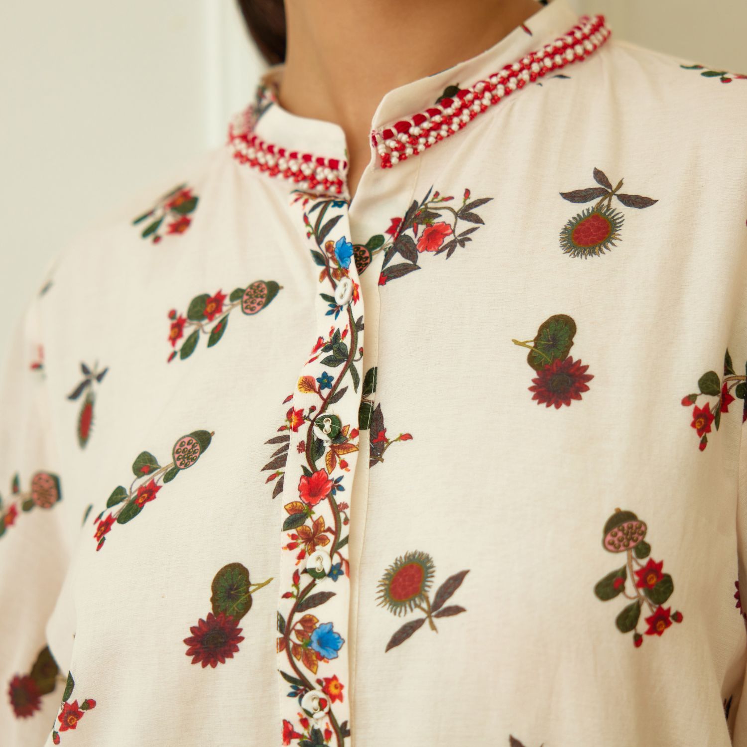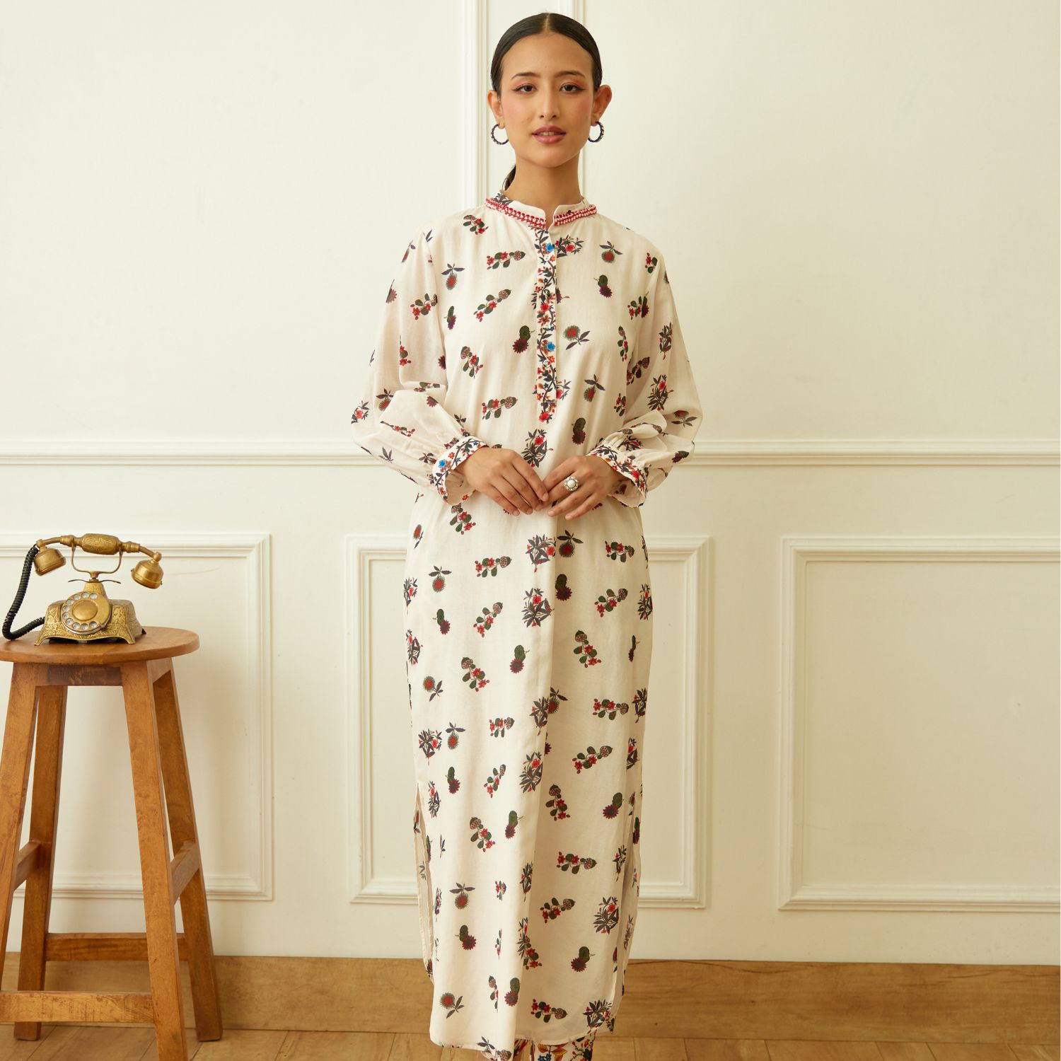 Embrace elegance in this ivory kohinoor buta print cotton silk kurta, adorned with crouching and bead embroidery around the neckline. Paired gracefully with matching pants, this ensemble epitomizes modern sophistication. Make a striking statement at any occasion with this captivating fusion of style and tradition.
