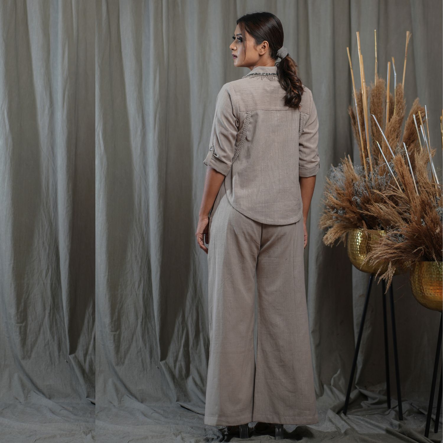 Elevate your style with this khaki overlap style shirt, featuring an embellished collar and exquisite braid detailing. The chic design exudes sophistication. Paired with side-slit flare pants adorned with braid detailing, this ensemble promises a fashionable and graceful look. Embrace the charm and uniqueness of this outfit, perfect for making a statement on any occasion.