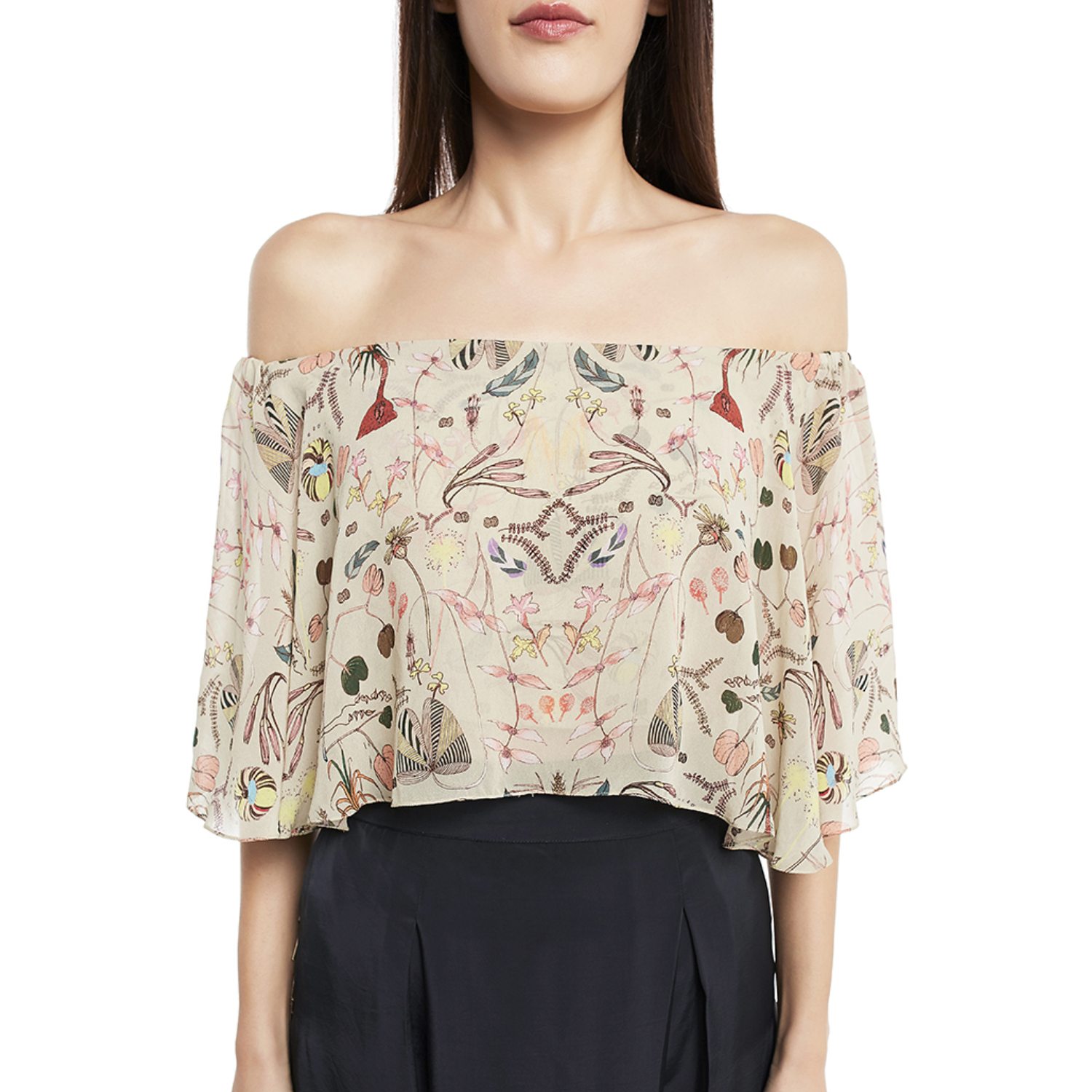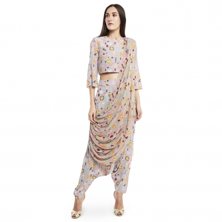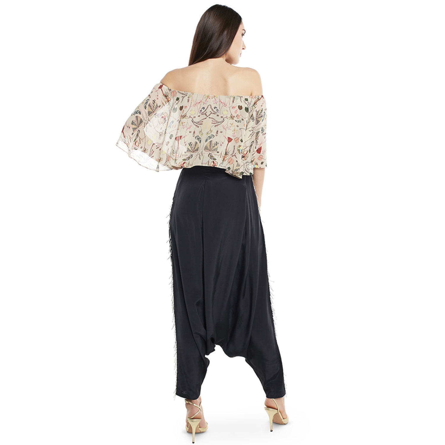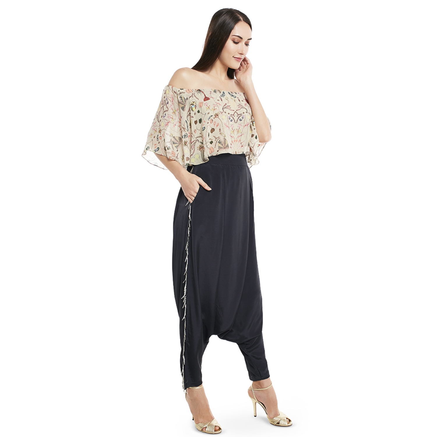 This gorgeous set features a contrasting forest print on a khaki art crepe fabric. The set includes a ruffle off-shoulder top and black low-crotch pants with tassels on the side seam for a stylish and comfortable look. Style it with statement earrings and heels for an evening event.