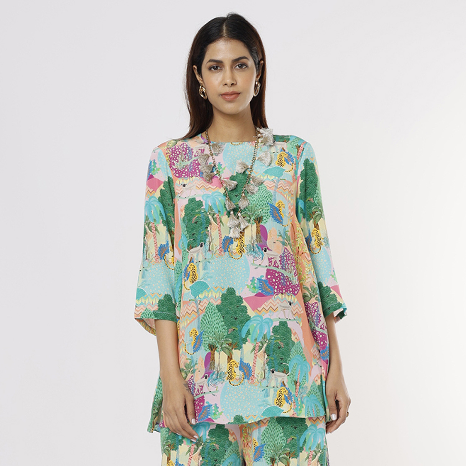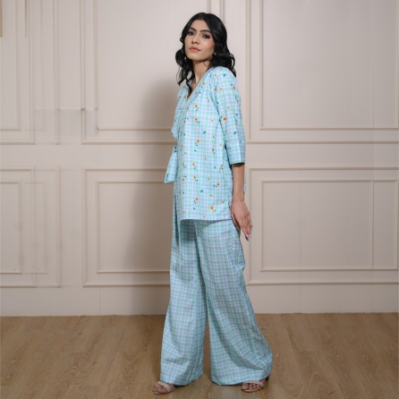 The top features a kuno print in green, yellow, and purple shades on a crepe fabric, adding uniqueness to the outfit. The top is paired with palazzo pants, which offer a relaxed fit for ease of movement. Style it with statement gold earrings and heels for a dressy day soiree.