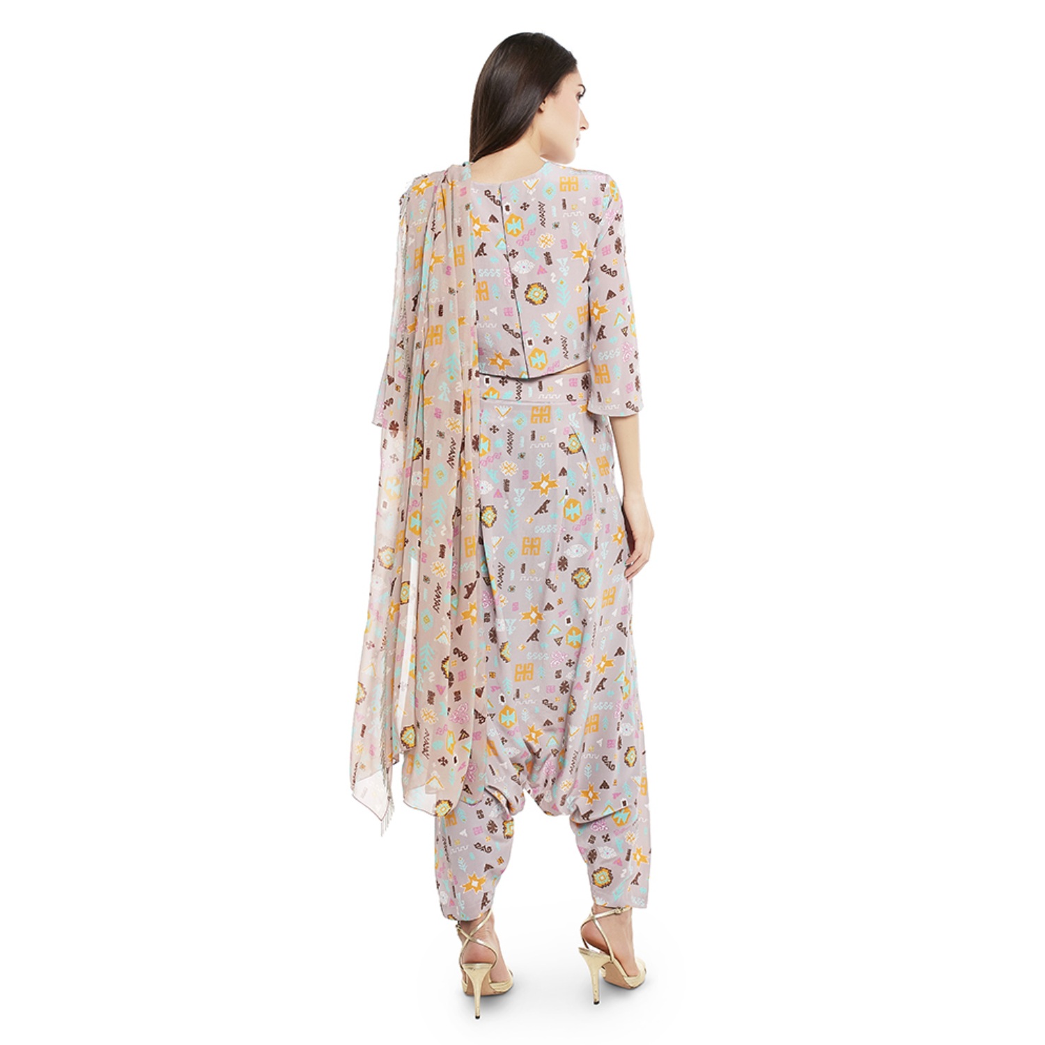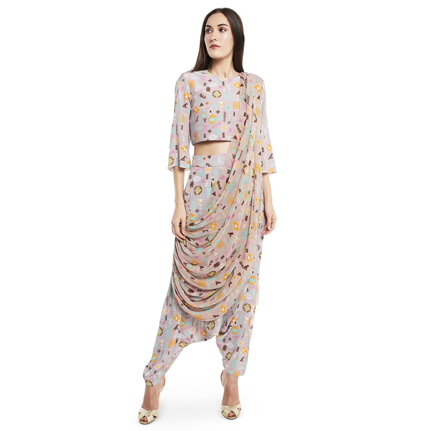 This stunning set features a lavender orange bandhani kilim print crepe top, which offers a modern and eye-catching design. The set comes with low-crotch pants with an attached drape dupatta in georgette, adding elegance to the look. Pair it with dangling earrings and a sling bag for a dressy event.