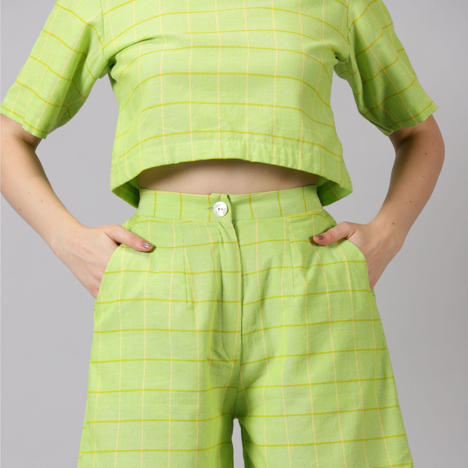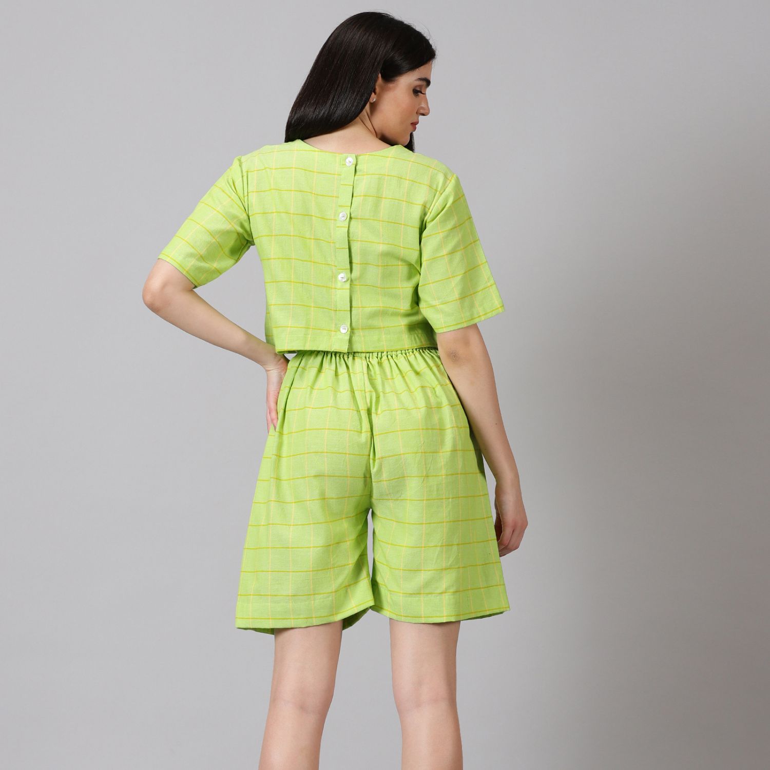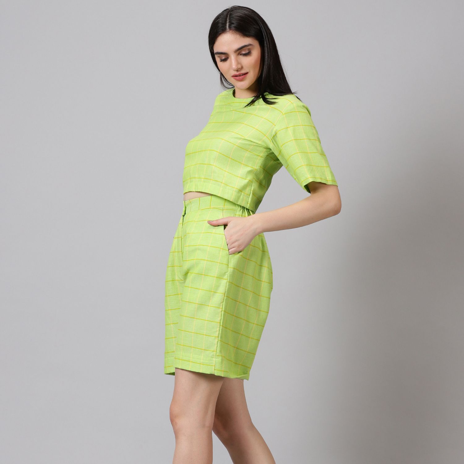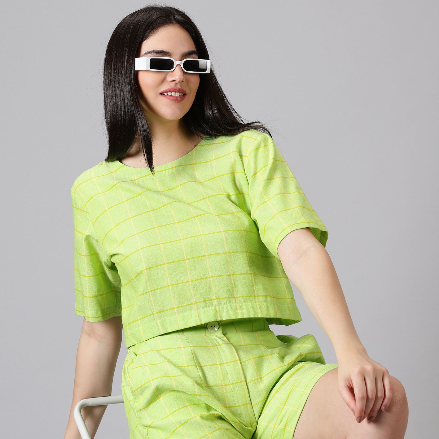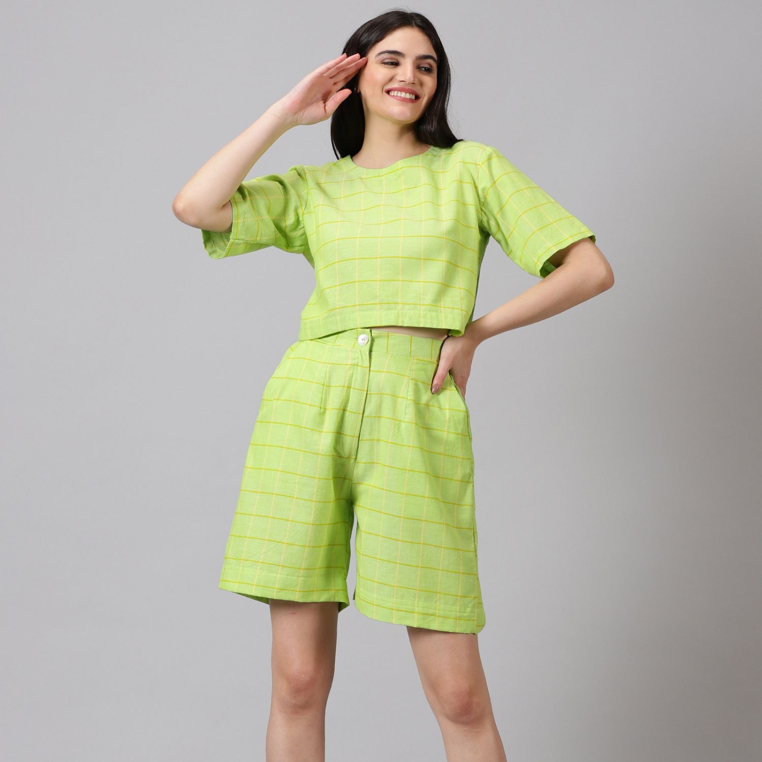 ₹ 3,750 (15% off)This summery checkered co-ord set is perfect for daytime activities. The cropped top and high-waisted shorts create a flattering silhouette. The monochrome color palette makes this set easy to style. Style this set with sneakers for an effortless look.