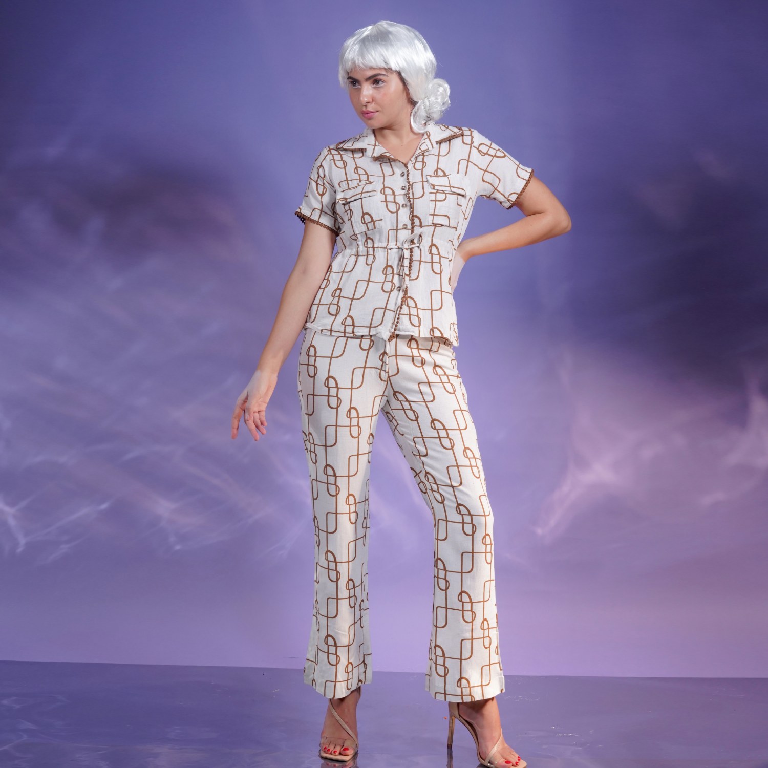 Elevate your style with our linen bronzer co-ord set. This elegant ensemble includes a collared neckshirt adorned with intricate lace detailing. The non-sheer top features drawstring at waist, allowing for a customisable fit. Paired with semi-loose elasticated pants, this co-ord set effortlessly combines comfort and sophistication.