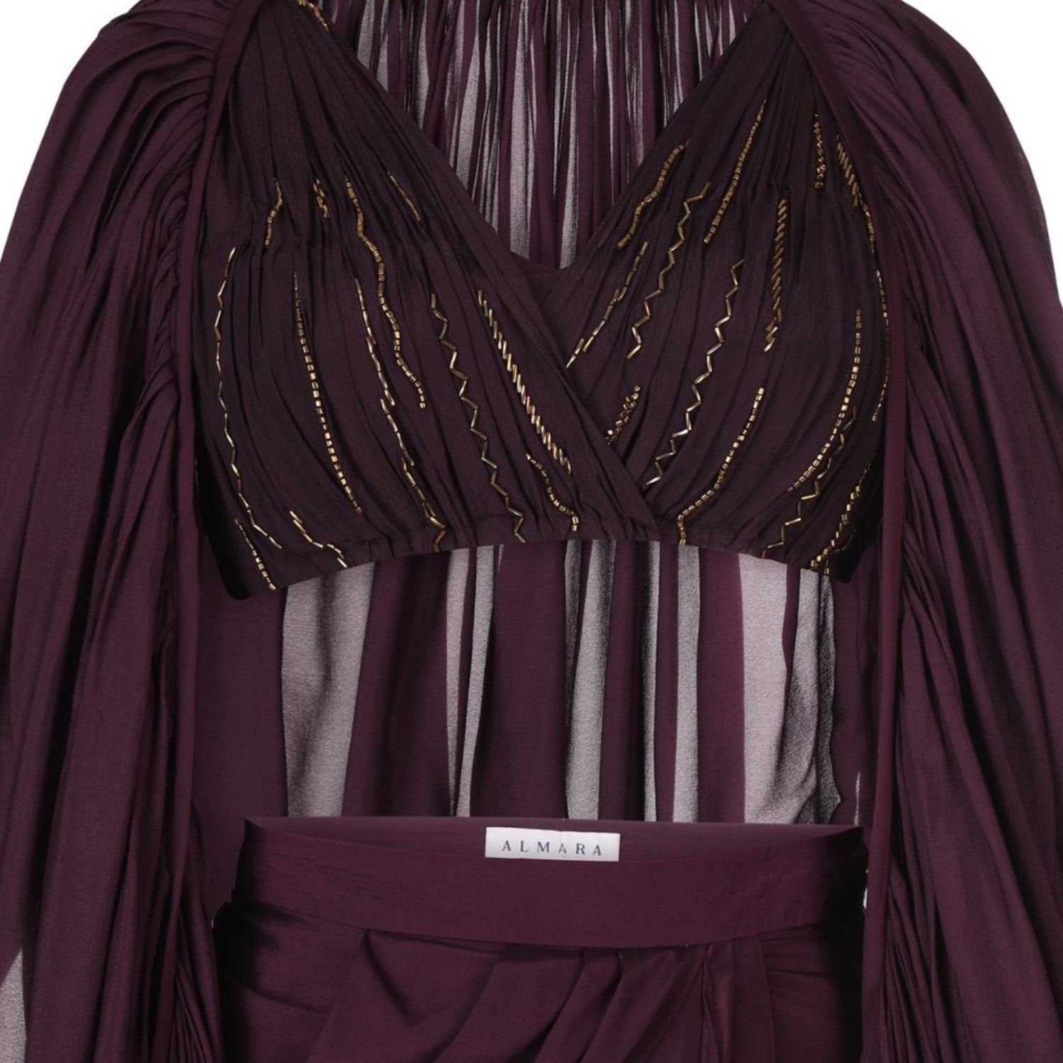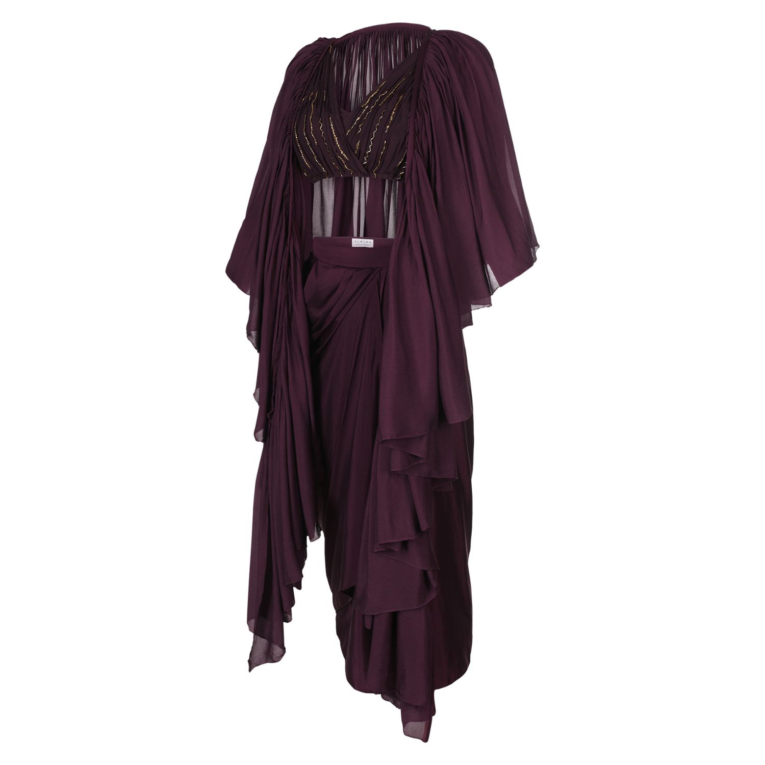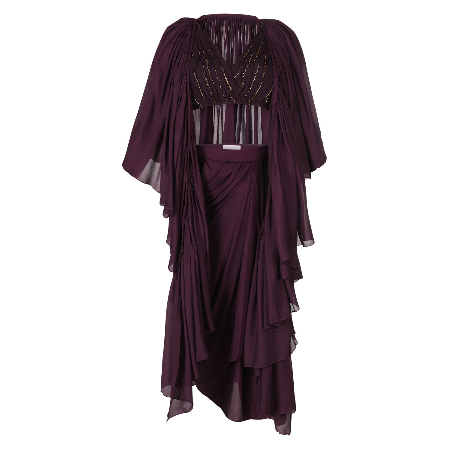 ₹ 28,000 (7% off)Step out in style with gorgeous mahogany chic co-ord set. This delicately draped mahogany skirt, ruffled cape thrown on a pleated blouse features copper beaded embroidery on the pleats and a very unique modern silhouette and making it the perfect addition to your wardrobe.