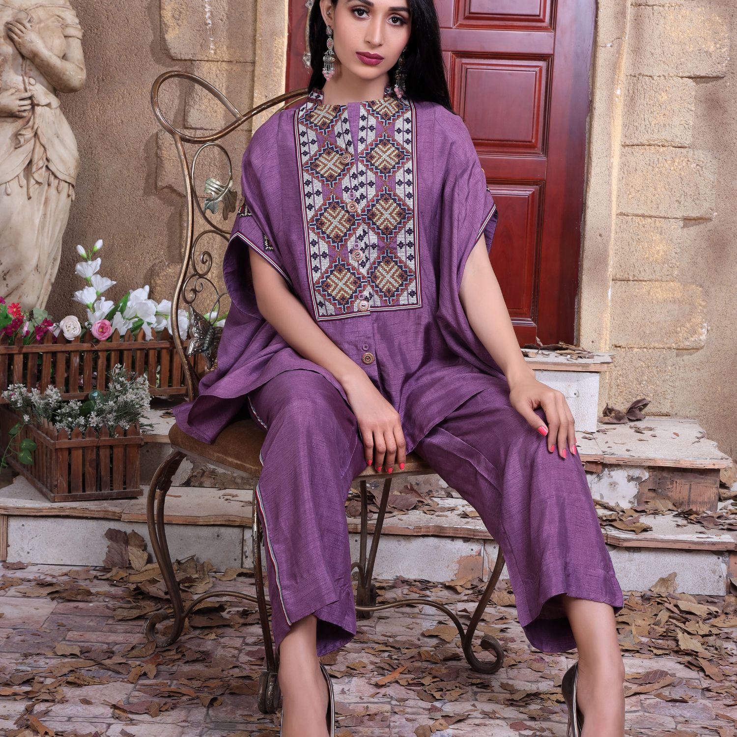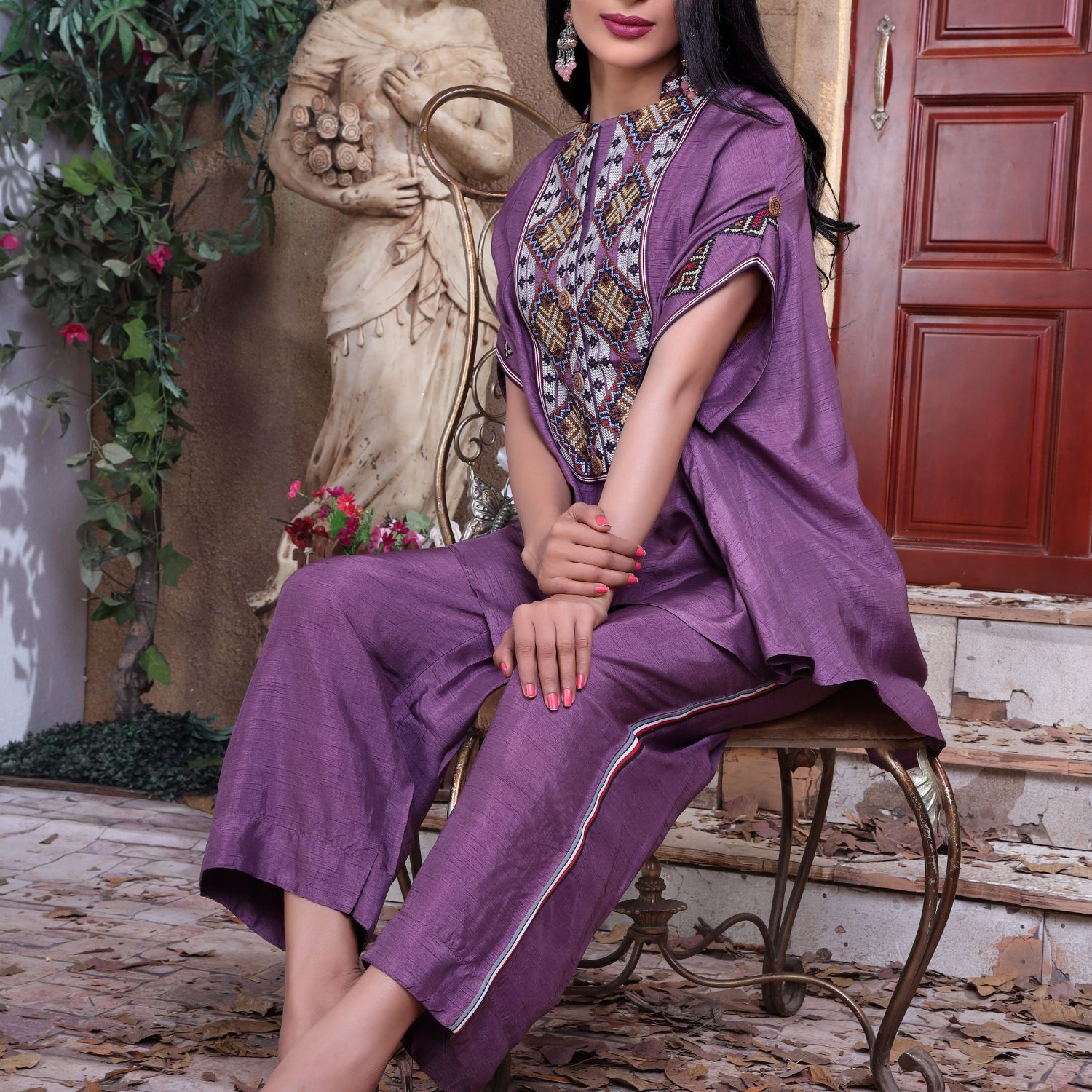 This stunning nauve co ord set is perfect for the festive season. The top features delicate colourful threadwork that adds colour to theis monochrome set. Style this co-ord set with statement earrings and a clutch to complete the look.