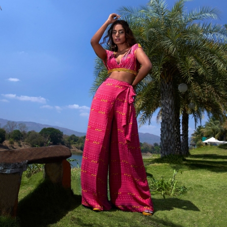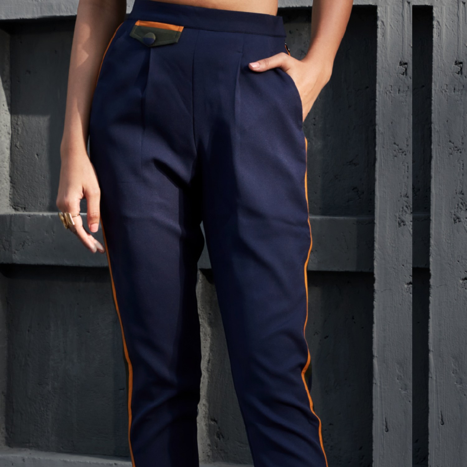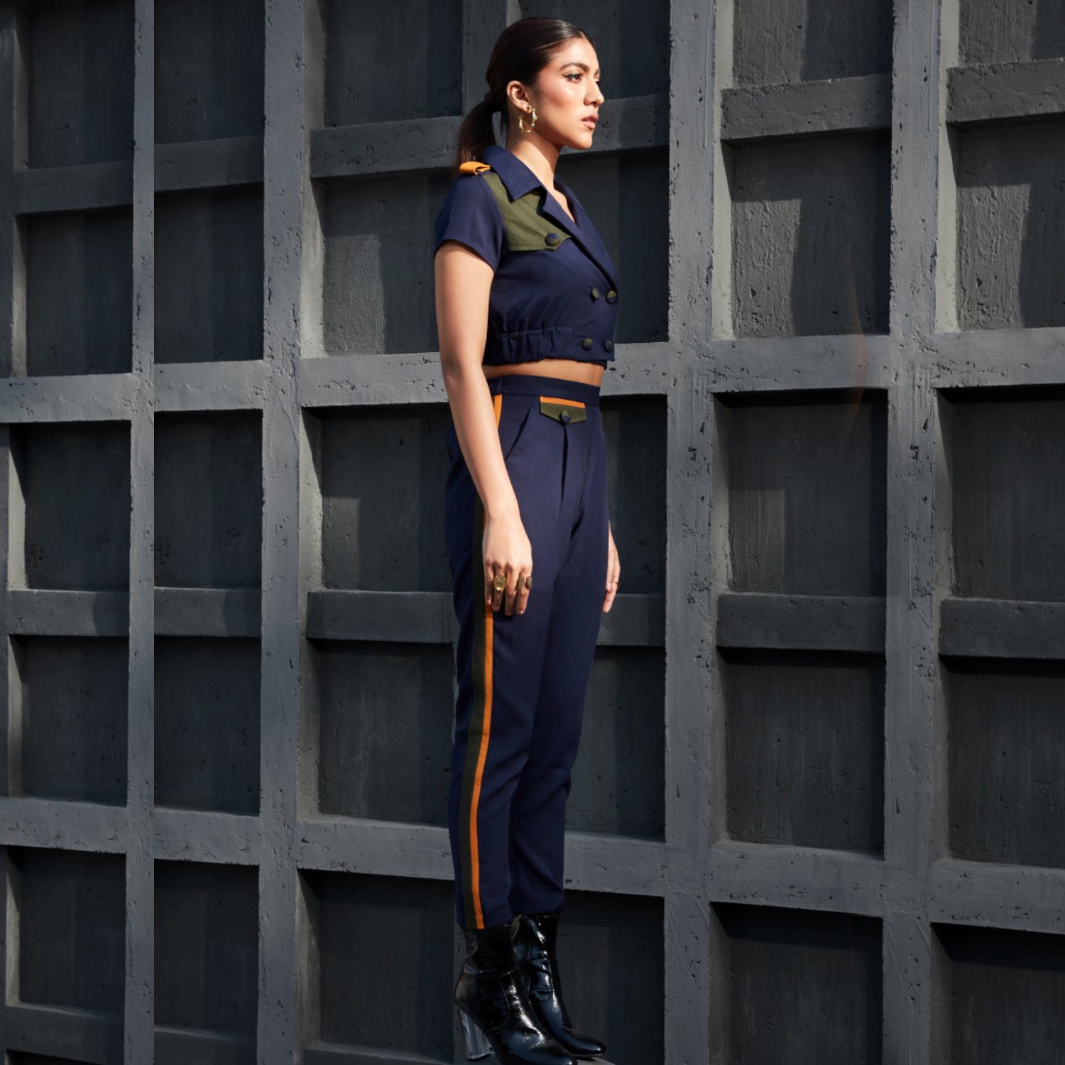 This co-ord set comes with a double-breasted navy blue crop top and high-waisted trousers. The top features an open collar, cap sleeves, a broad elasticated waistband and shoulder tabs, creating a structured fit. The trousers come with faux pocket flaps with dual-colored buttons at the waist, offering a trendy look.