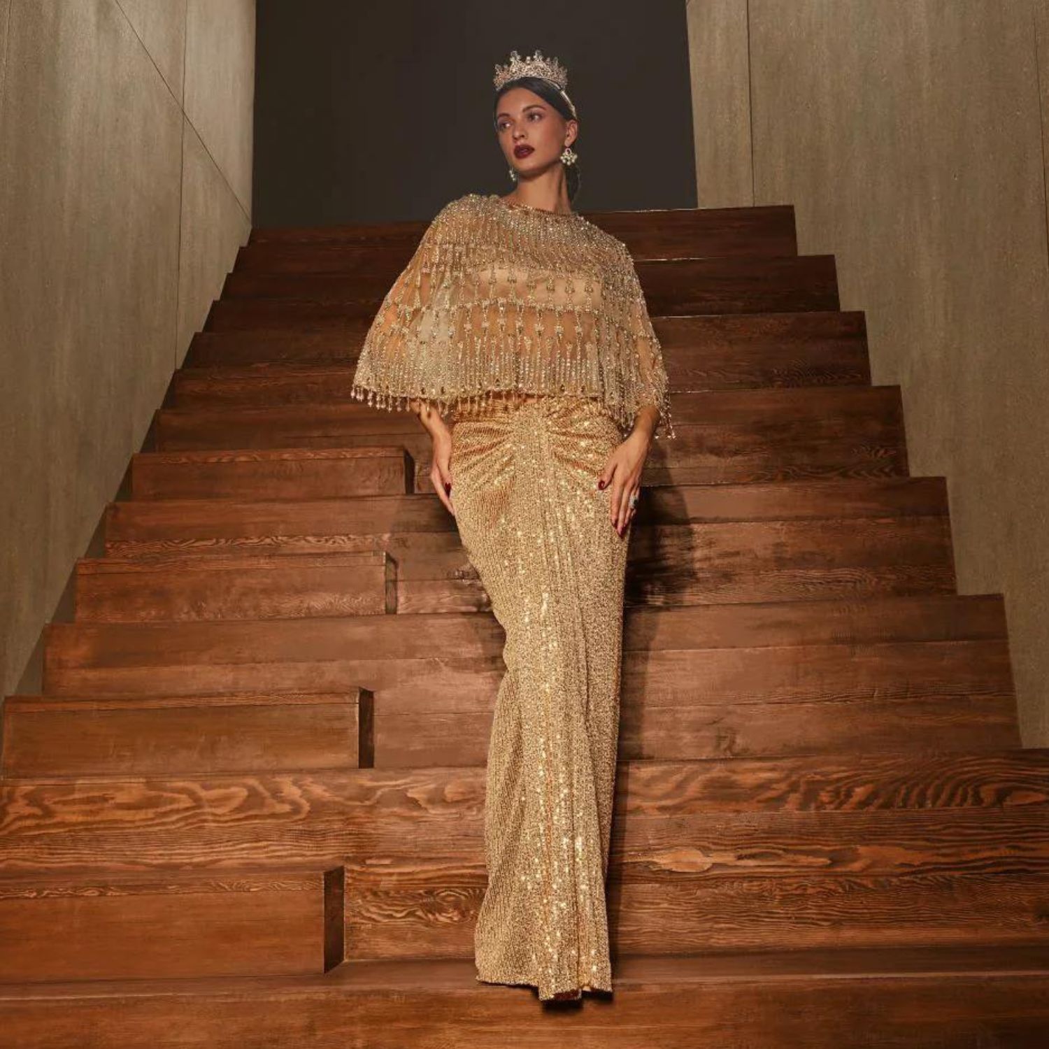 Make a glamorous statement with this stunning ensemble featuring a draped sequin skirt and bustier, elegantly paired with our new crystal cape in royal gold. The cascading shimmer of sequins creates a captivating effect, while the regal gold hue of the cape adds an extra touch of opulence. Embrace luxury and radiate elegance with this exquisite outfit.