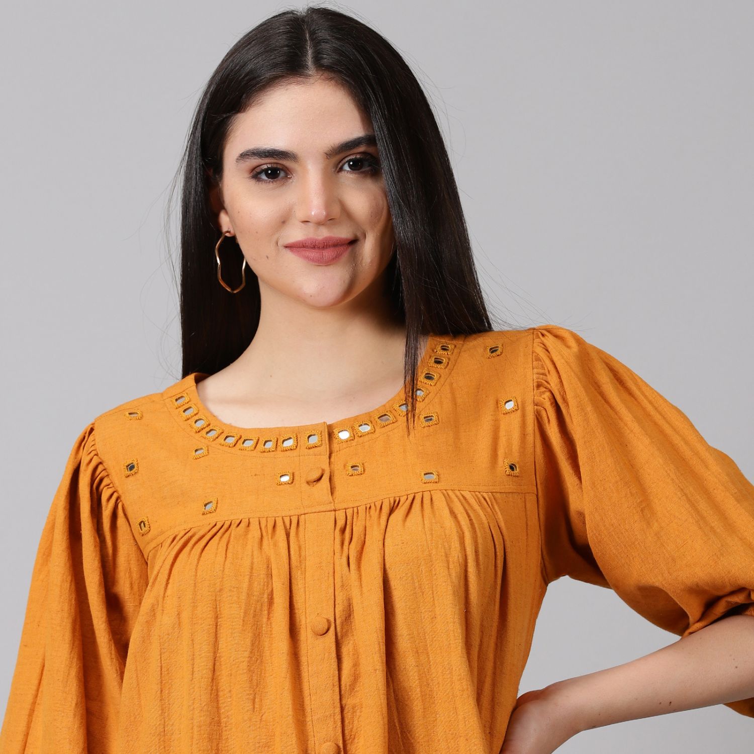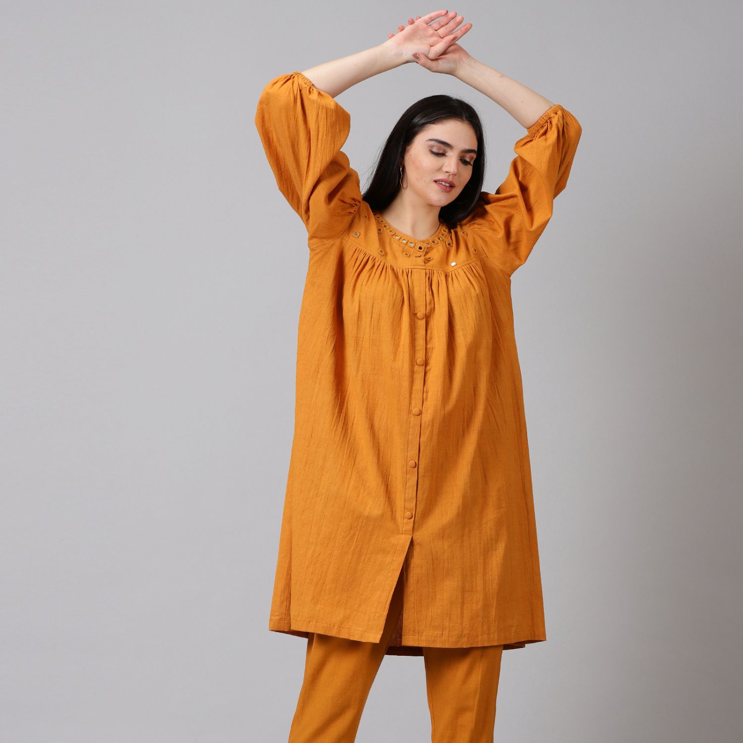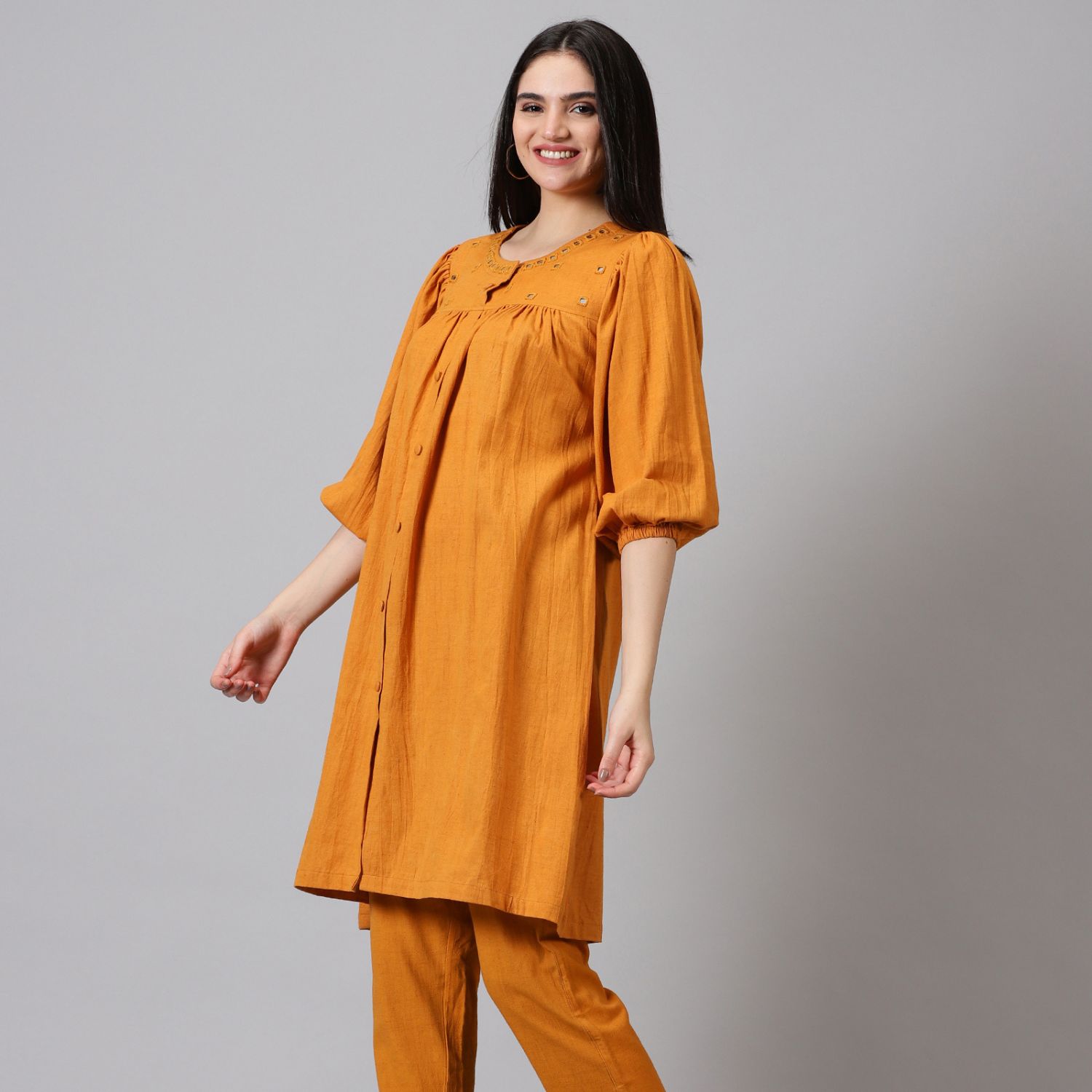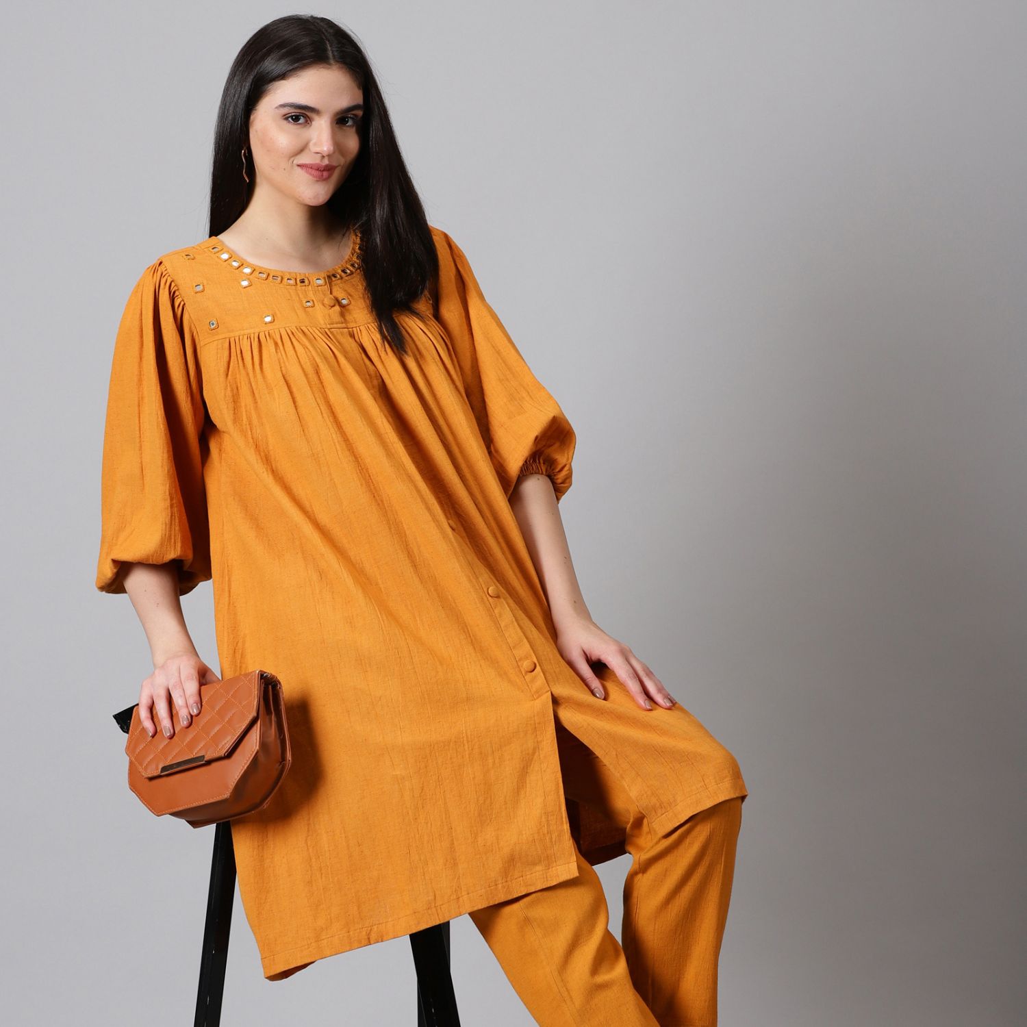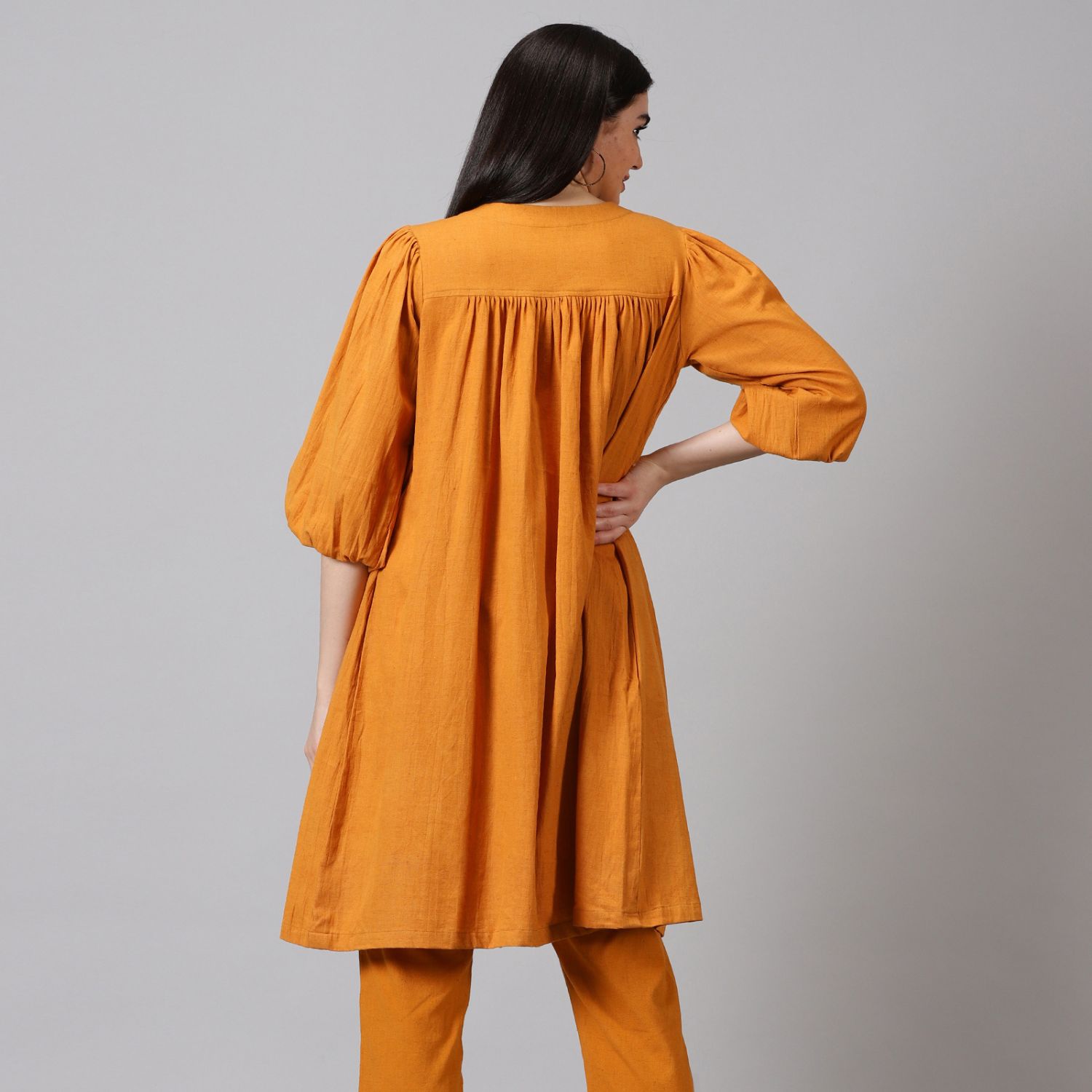 ₹ 5,600 (15% off)Introducing the handloom cotton co-ord set, a fashionable and versatile ensemble for your casual wardrobe. Made from high-quality handloom cotton, it offers comfort and breathability. The vibrant mustard colour adds warmth and style. With 3/4th sleeves and a round neck, it provides a flattering and trendy look.