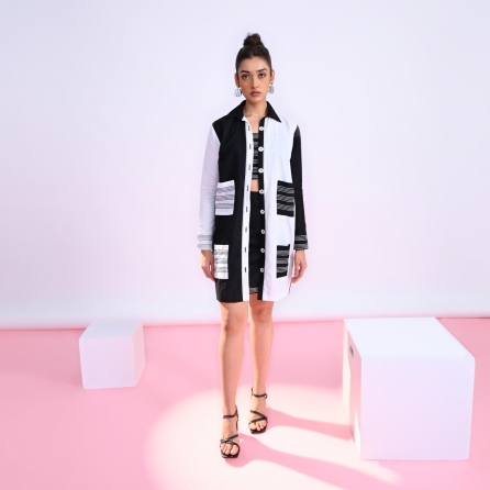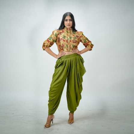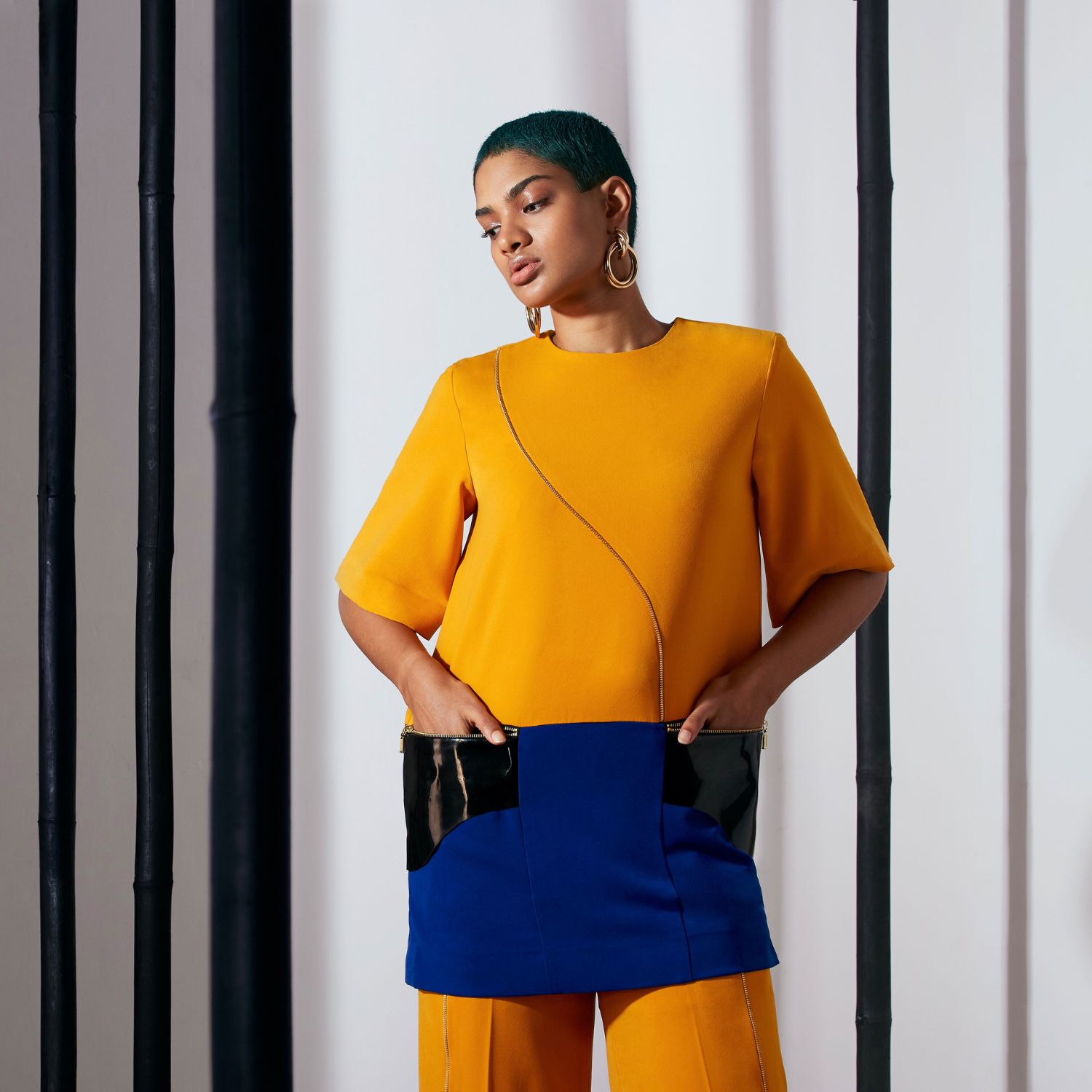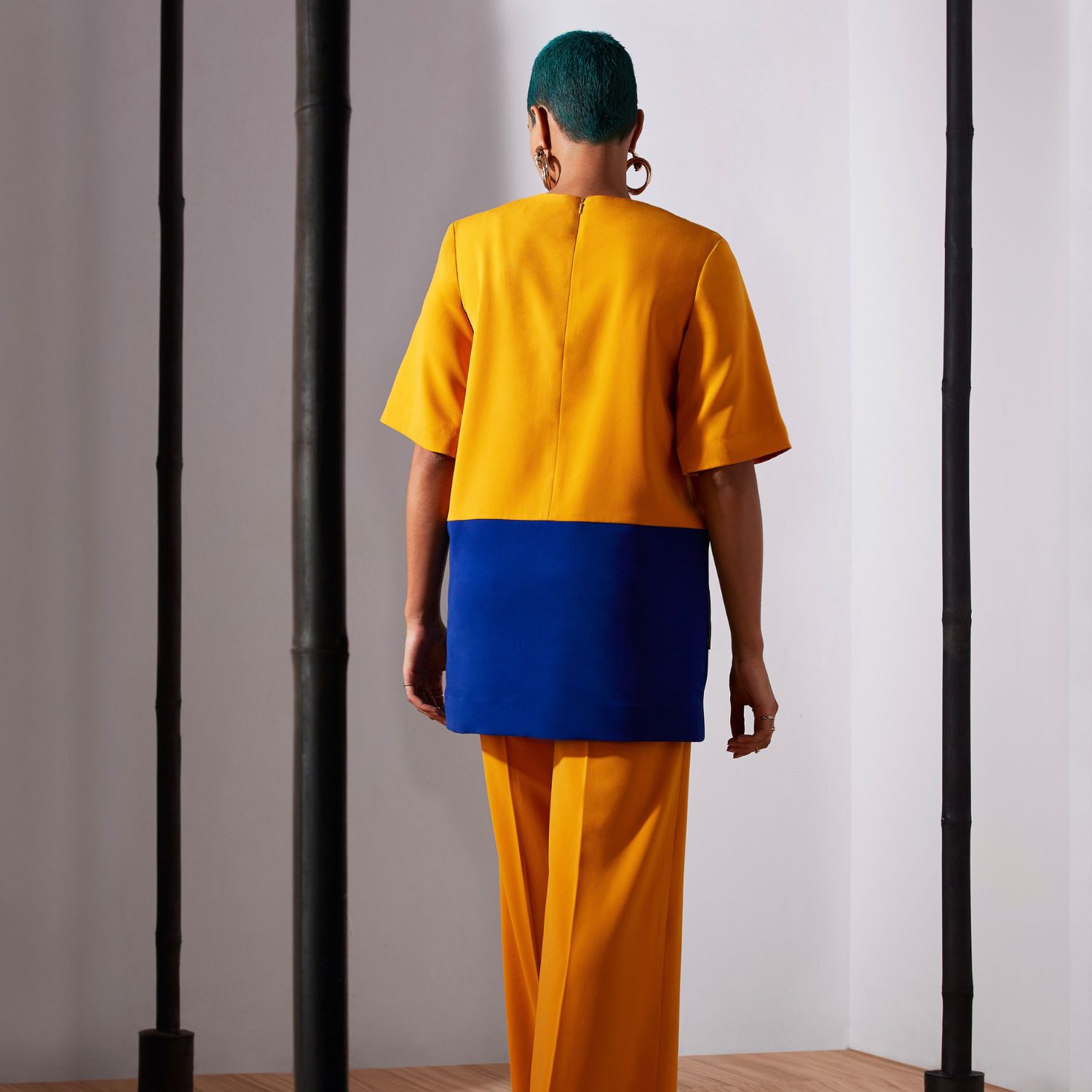 The colour-blocked small shift top with flared trousers is a fashionable and modern outfit. The top is designed in a shift style, which means it has a fluid and relaxed shape that skims the body without being form-fitting, giving it a youthful and fun appearance. The mustard-yellow flared trousers are a vibrant and chic wardrobe piece that adds a bold and lively touch to your outfit.