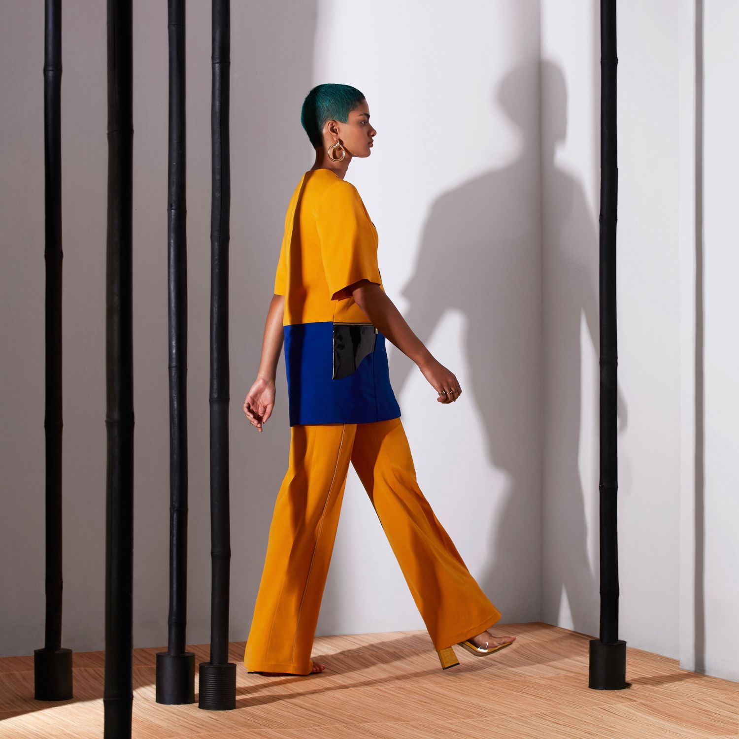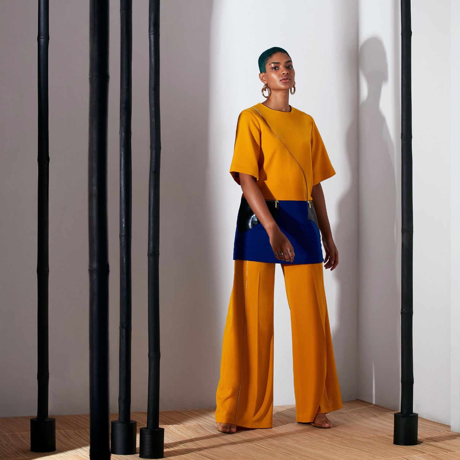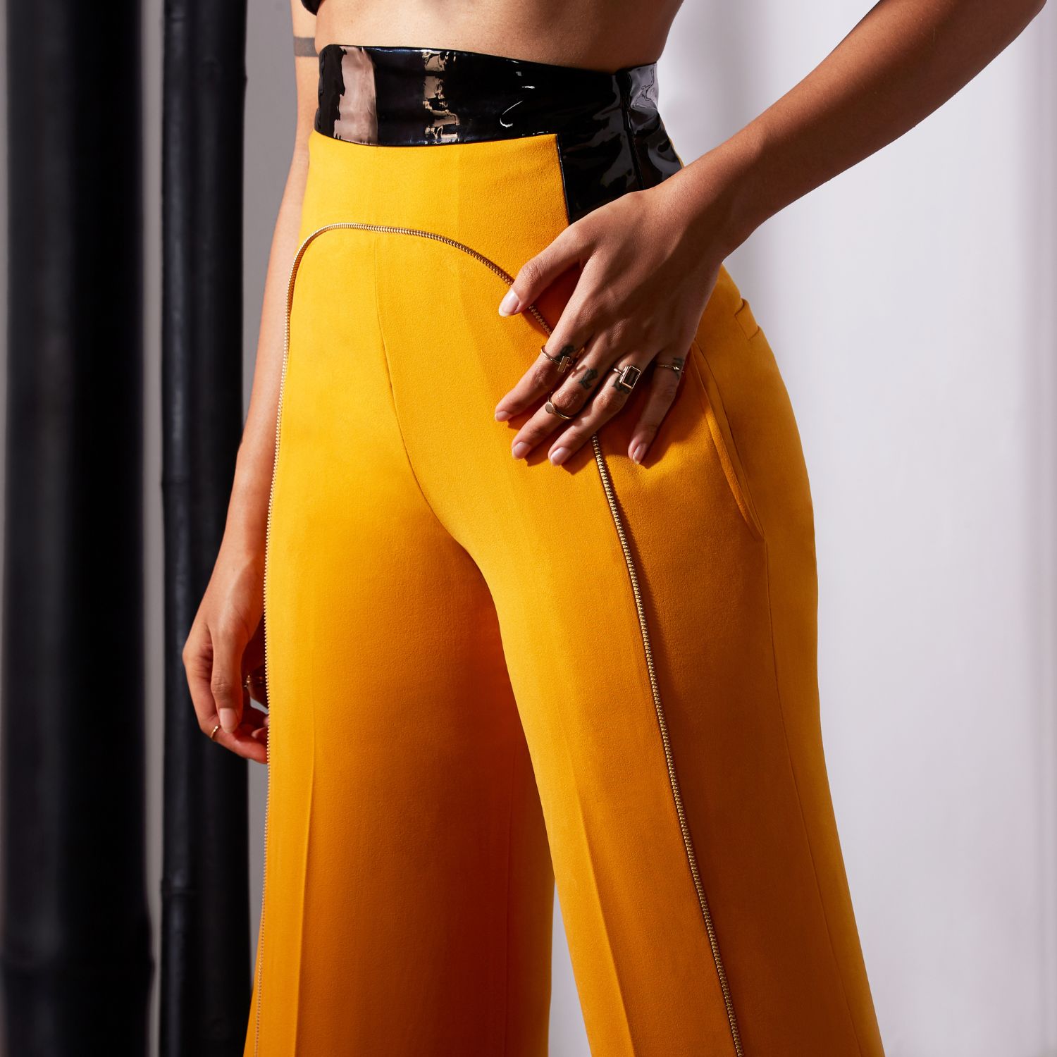 The colour-blocked small shift top with flared trousers is a fashionable and modern outfit. The top is designed in a shift style, which means it has a fluid and relaxed shape that skims the body without being form-fitting, giving it a youthful and fun appearance. The mustard-yellow flared trousers are a vibrant and chic wardrobe piece that adds a bold and lively touch to your outfit.