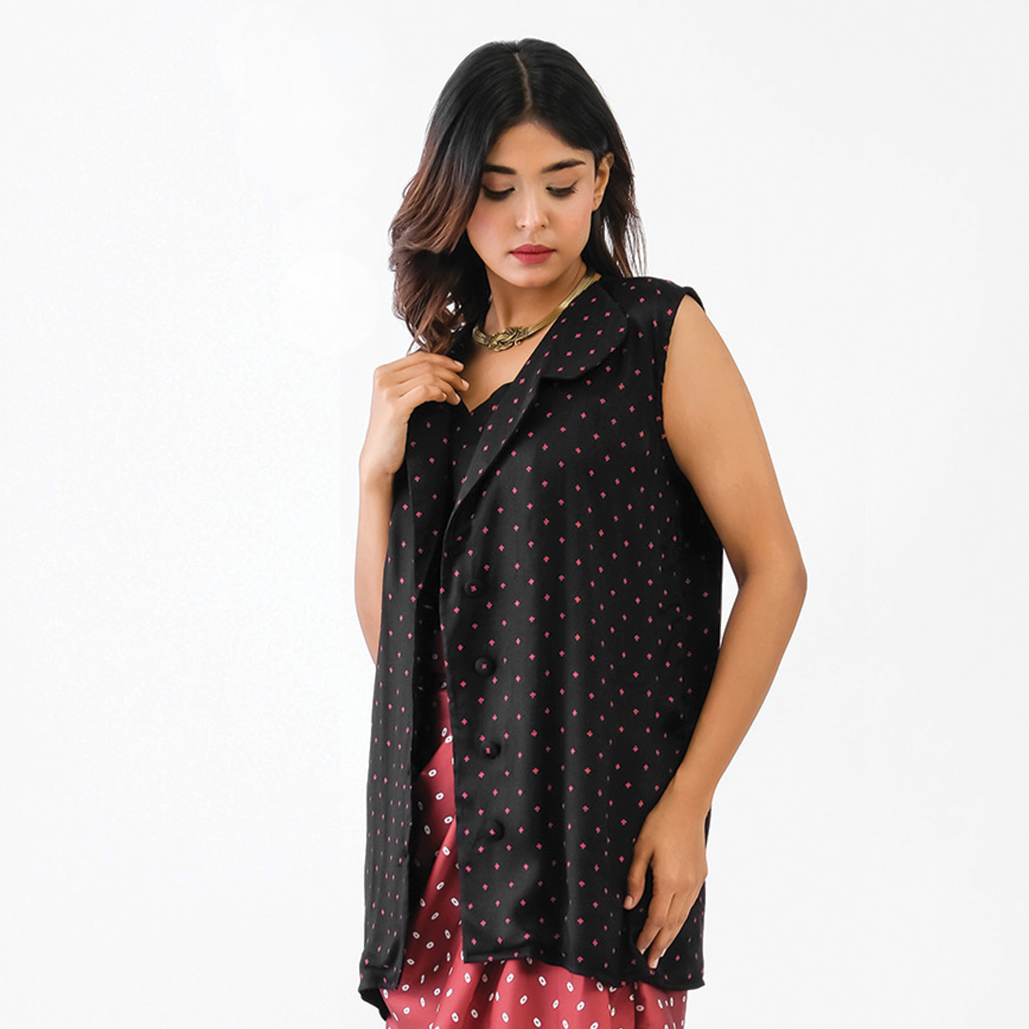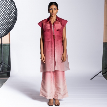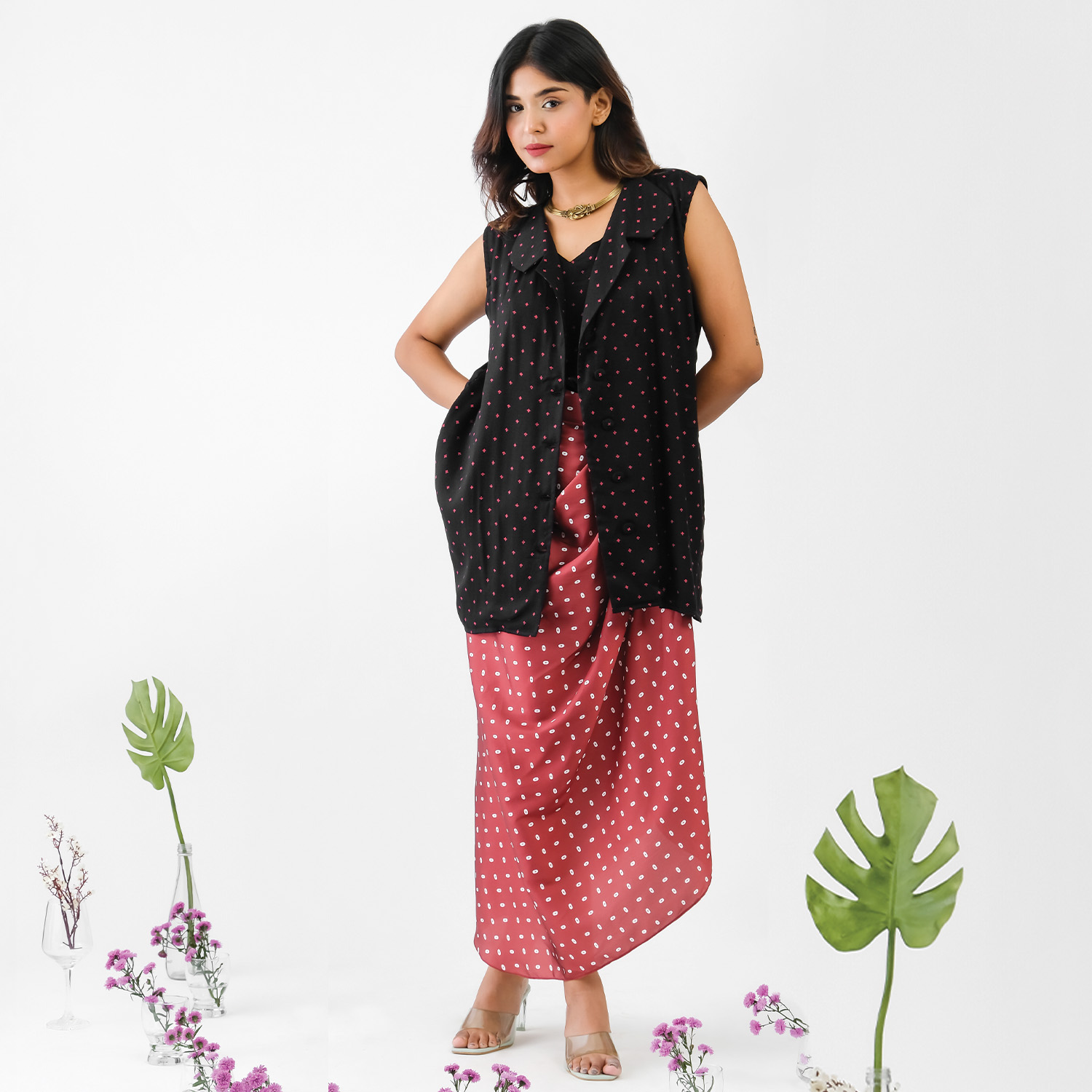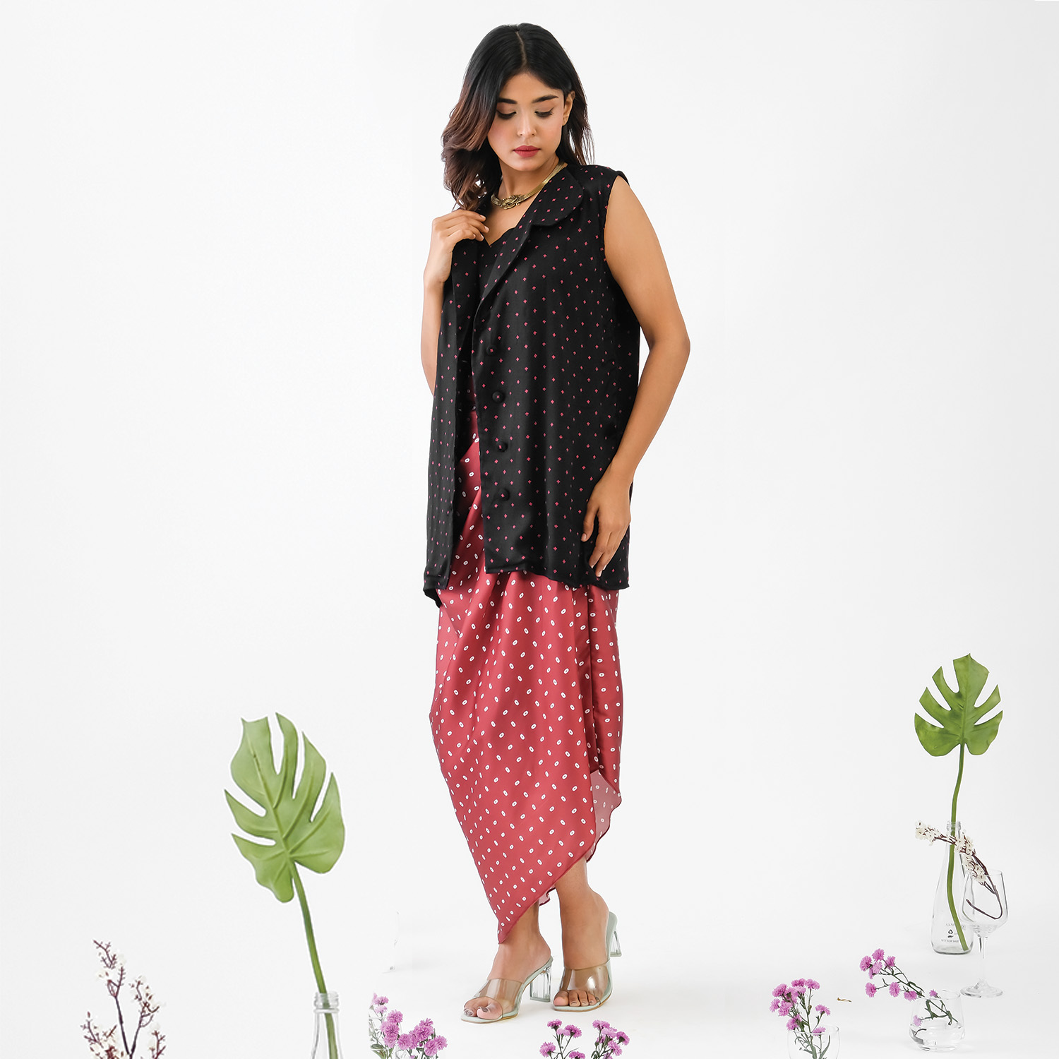 ₹ 7,999 (10% off)This set features a stunning maroon bandhej print drape skirt, offering an elegant look. It is paired with a sleek black blazer, offering a sophisticated look. This set is crafted from luxurious satin fabric, offering comfort and ease of wear. Style it with a solid camisole and statement earrings for a chic look.