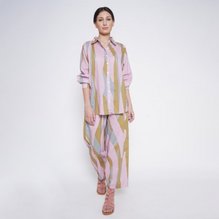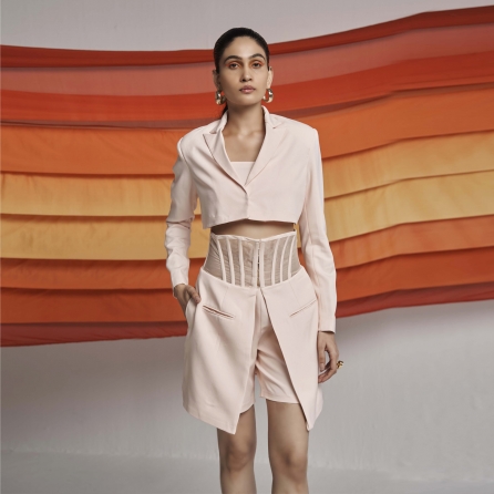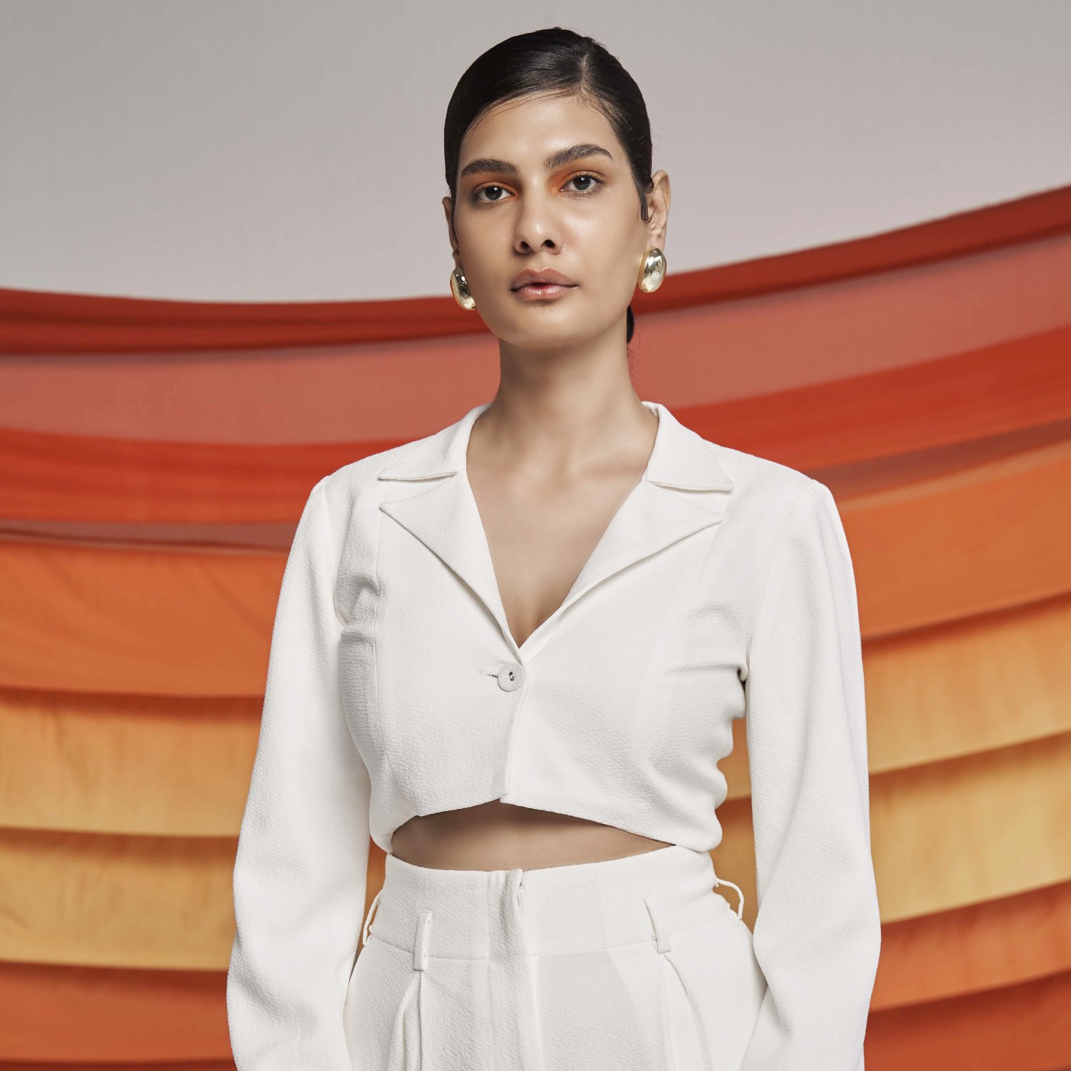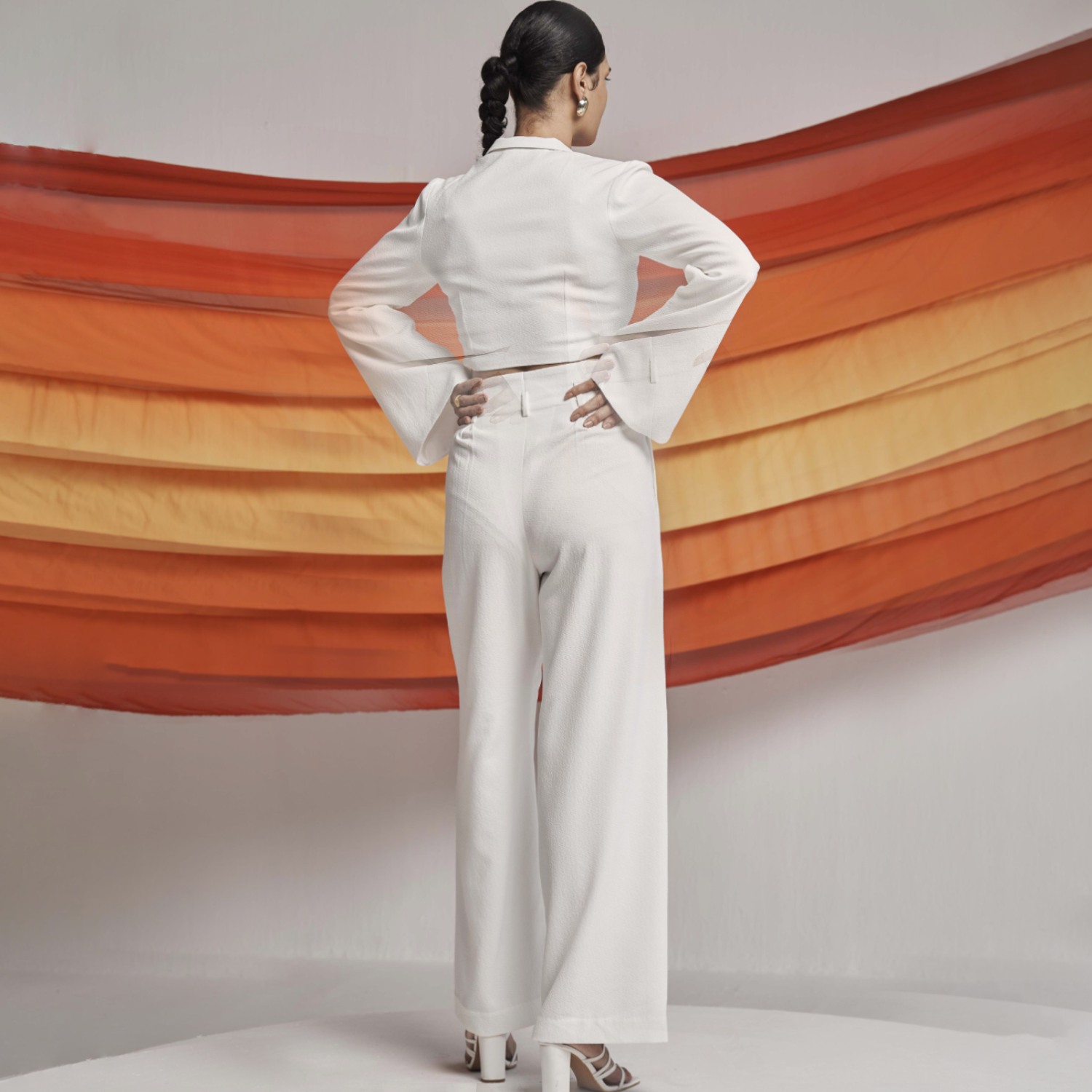 ₹ 14,500 (10% off)This co-ord set exudes effortless elegance and raw power. The self-fabric top features a button-up design with full bell sleeves and a collar, while the box-pleated trousers add a touch of femininity. This ivory statement outfit is perfect for the fall and winter seasons.