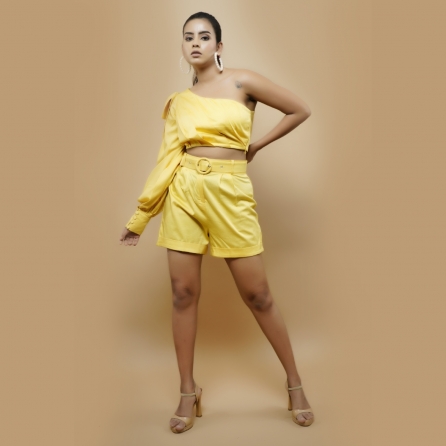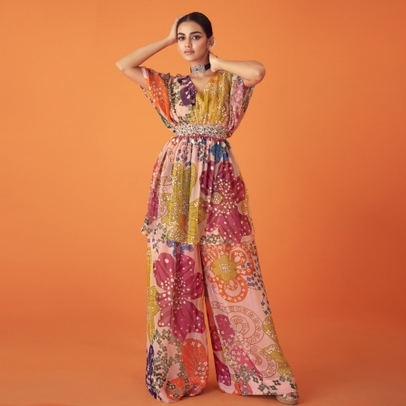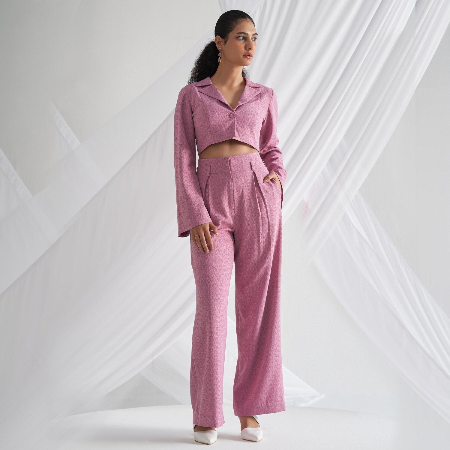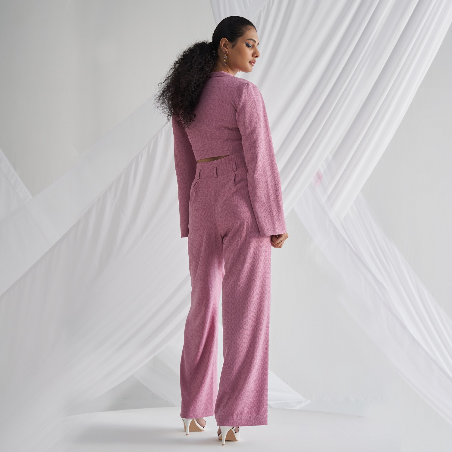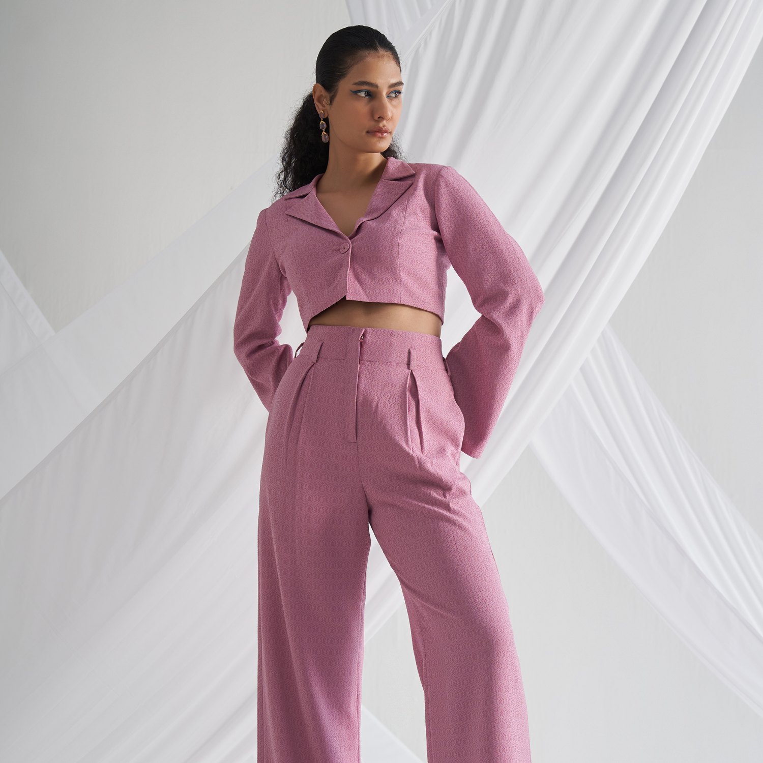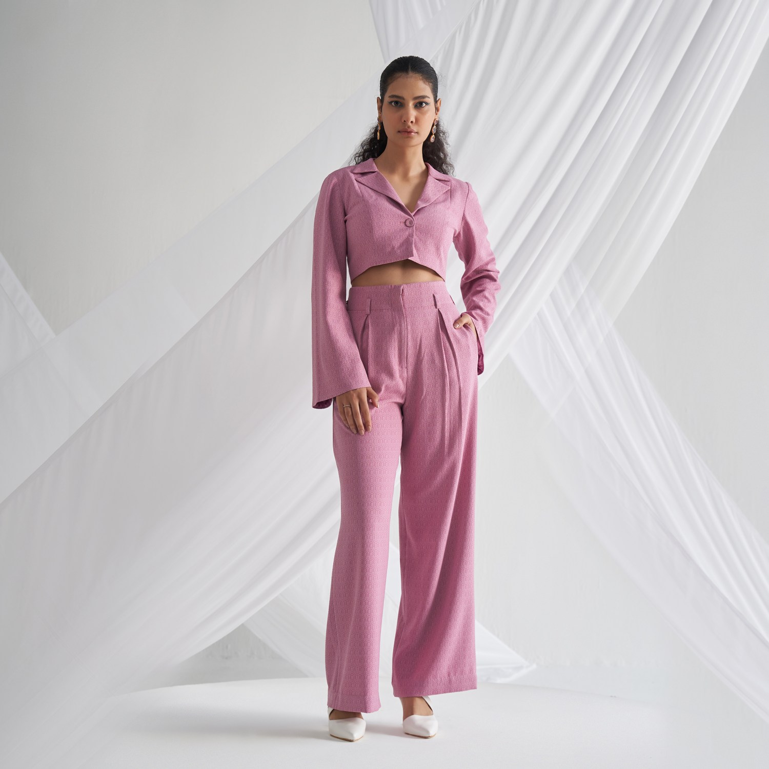 ₹ 14,500 (10% off)This co-ord set exudes effortless elegance and raw power. The self-fabric top features a button-up design with full bell sleeves and a collar, while the box-pleated trousers add a touch of femininity. This mauvelous pink statement outfit is perfect for the fall and winter seasons.