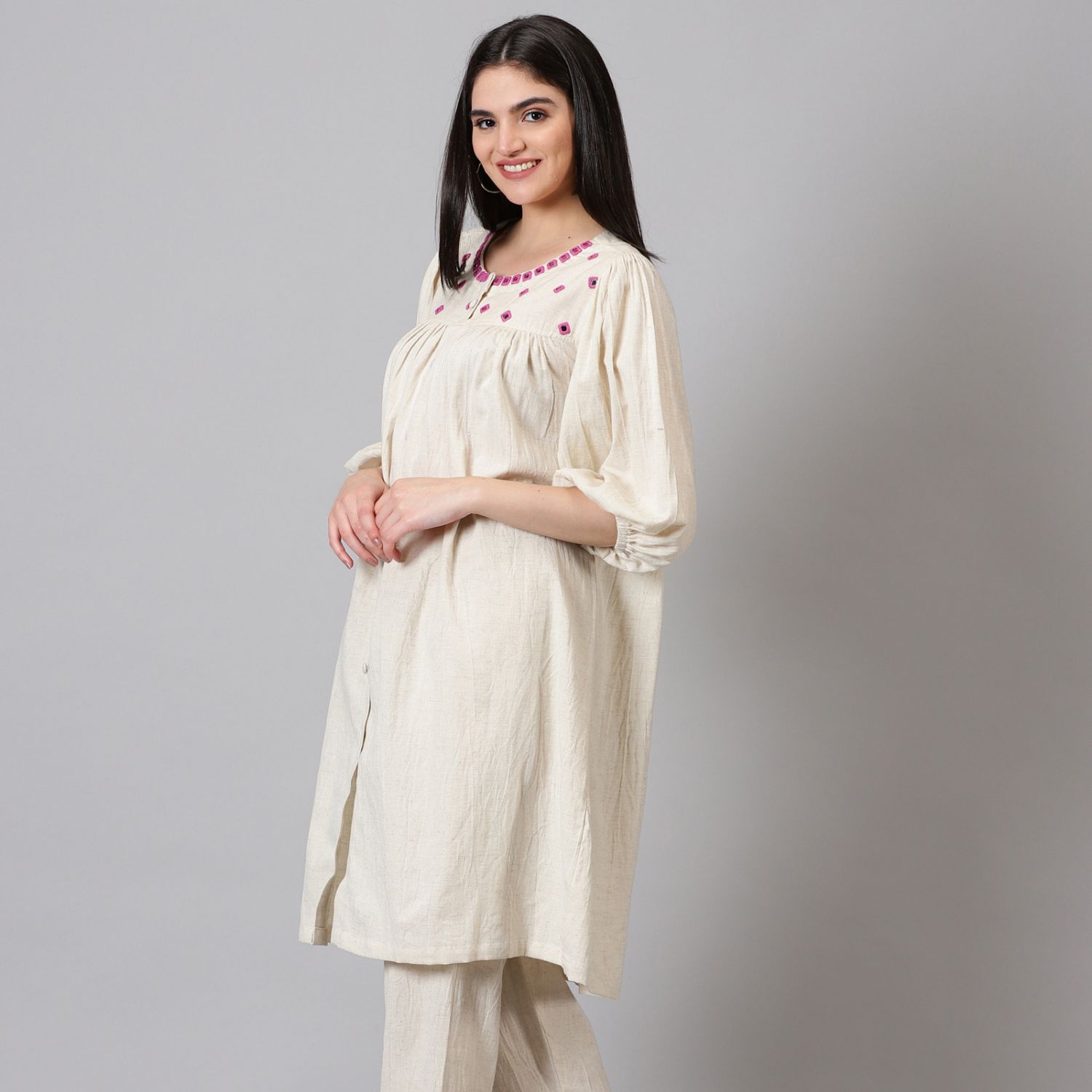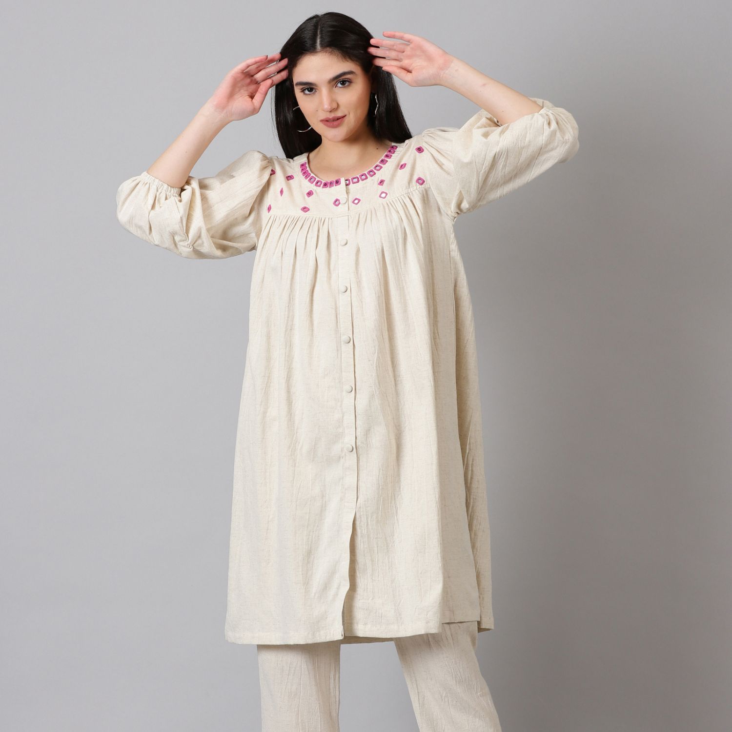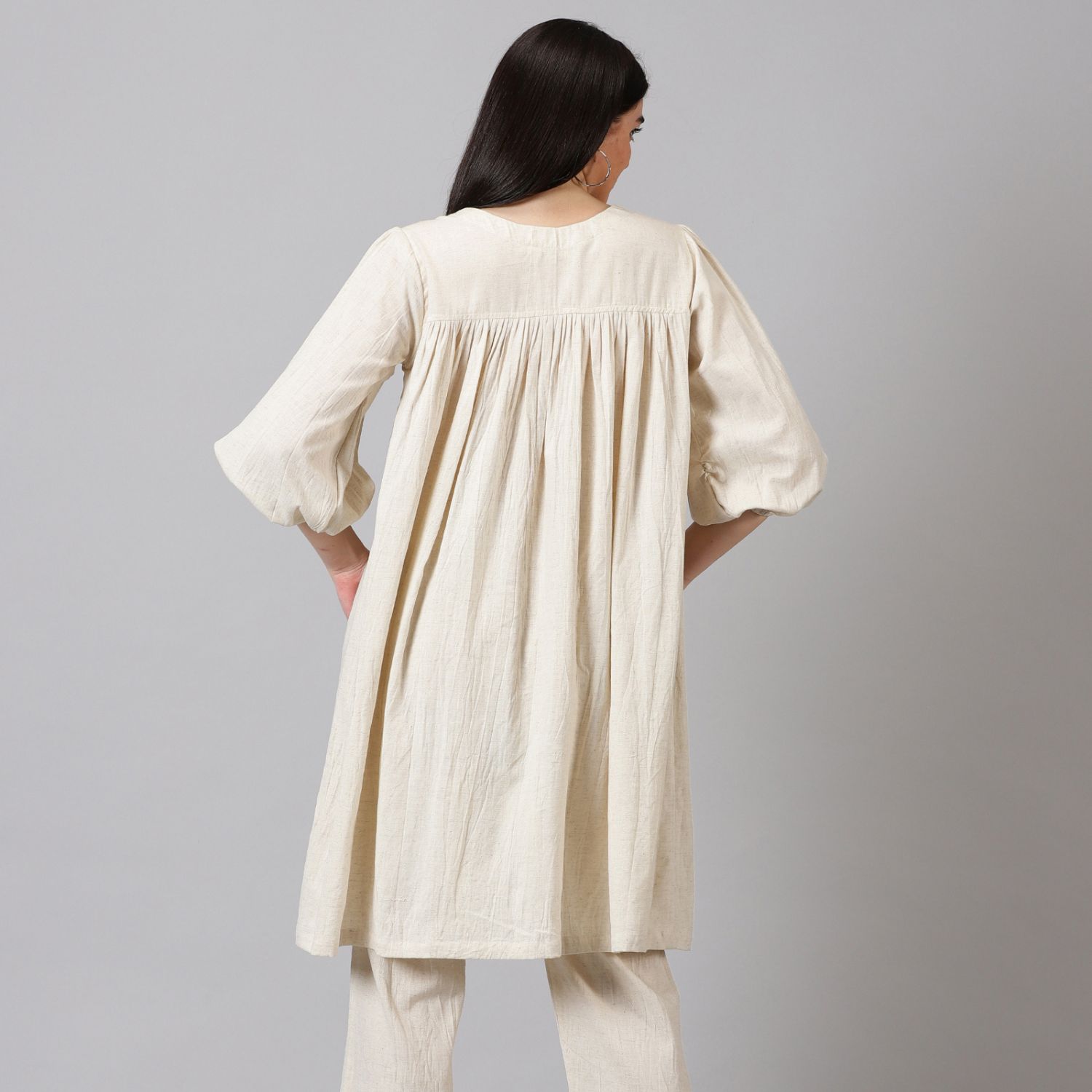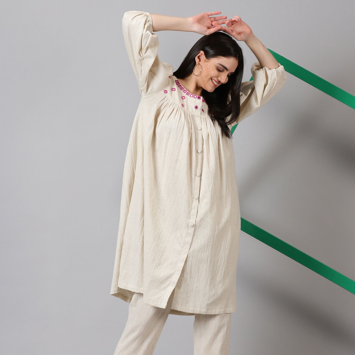 ₹ 5,600 (15% off)Introducing the off-white handloom cotton co-ord set, a stylish and versatile ensemble combining comfort with fashion-forward design. Made with premium handloom cotton fabric, it offers elegance and durability. The off-white colour allows easy coordination, while the 3/4 sleeves and round neck provide style and coverage. It's flattering for different body types and perfect for various occasions.