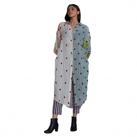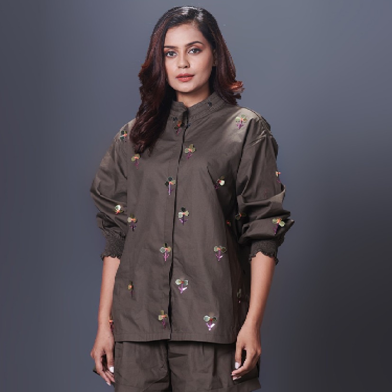 This beautiful set is crafted from high-quality cotton fabric. It includes a shirt and shorts, both in an olive green shade. The shirt has intricate hand embroidery and puffed sleeves, adding elegance to the look. The shorts come with pockets and have a relaxed fit that perfectly complements the outfit. Pair it with statement earrings and metallic heels for a dressy evening event.
