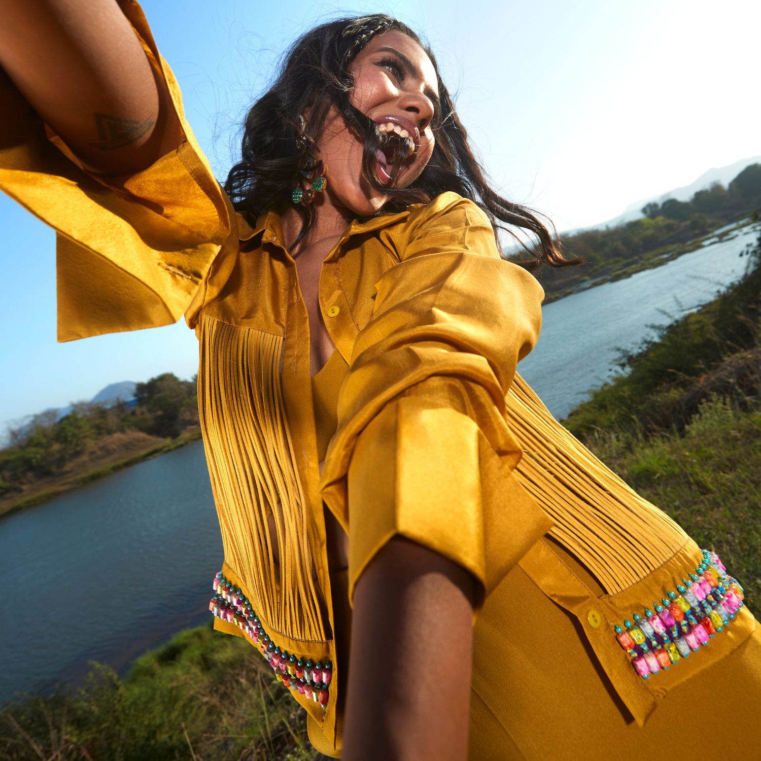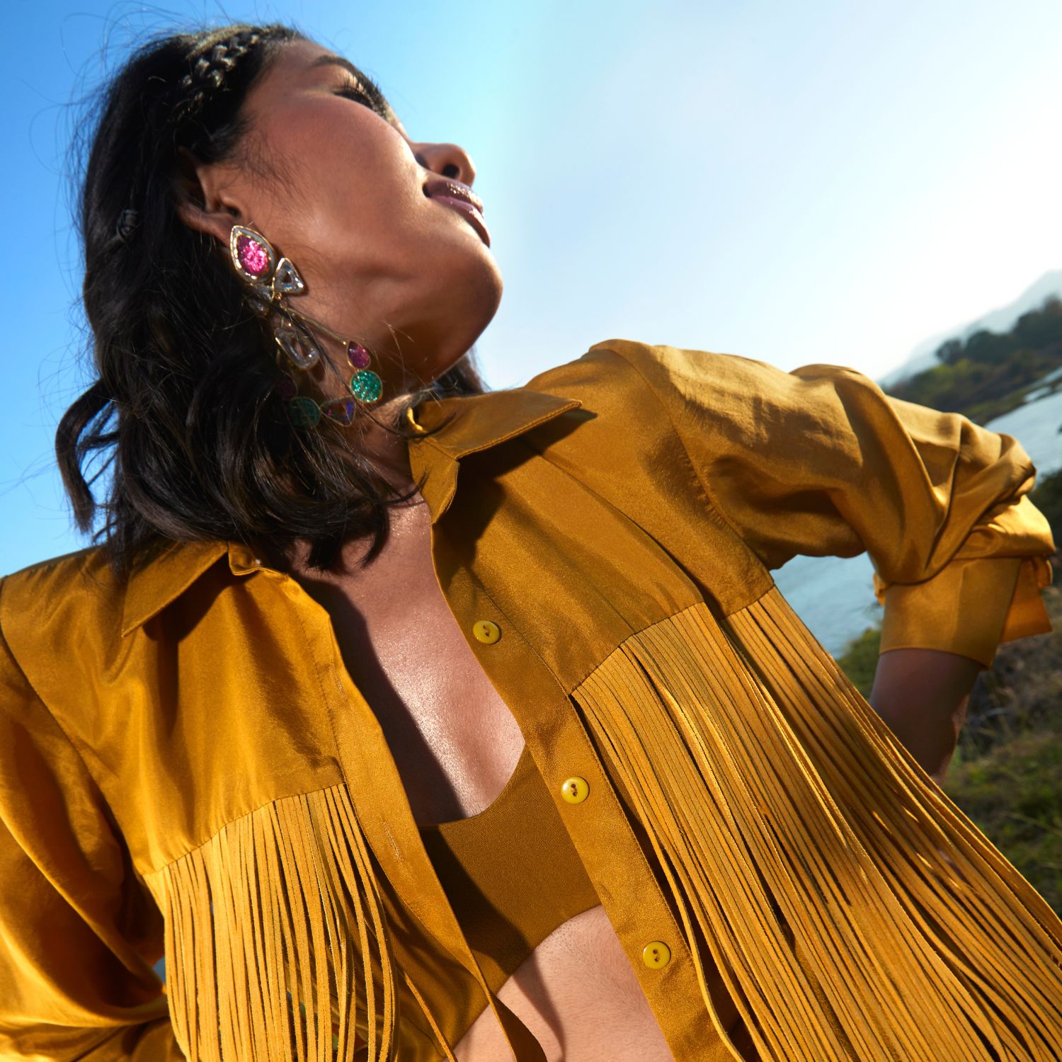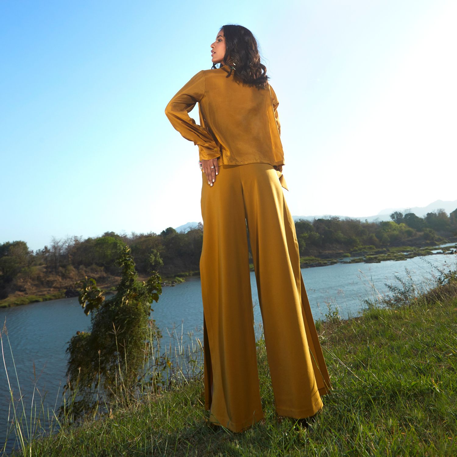 Exude timeless elegance with this olive silk jacket, paired flawlessly with a stylish bralette and side-slit straight-leg pants. This ensemble combines luxurious silk, a trendy cord detail, and a modern silhouette. With its sophisticated charm and versatile appeal, it's the perfect choice for both formal and casual occasions.