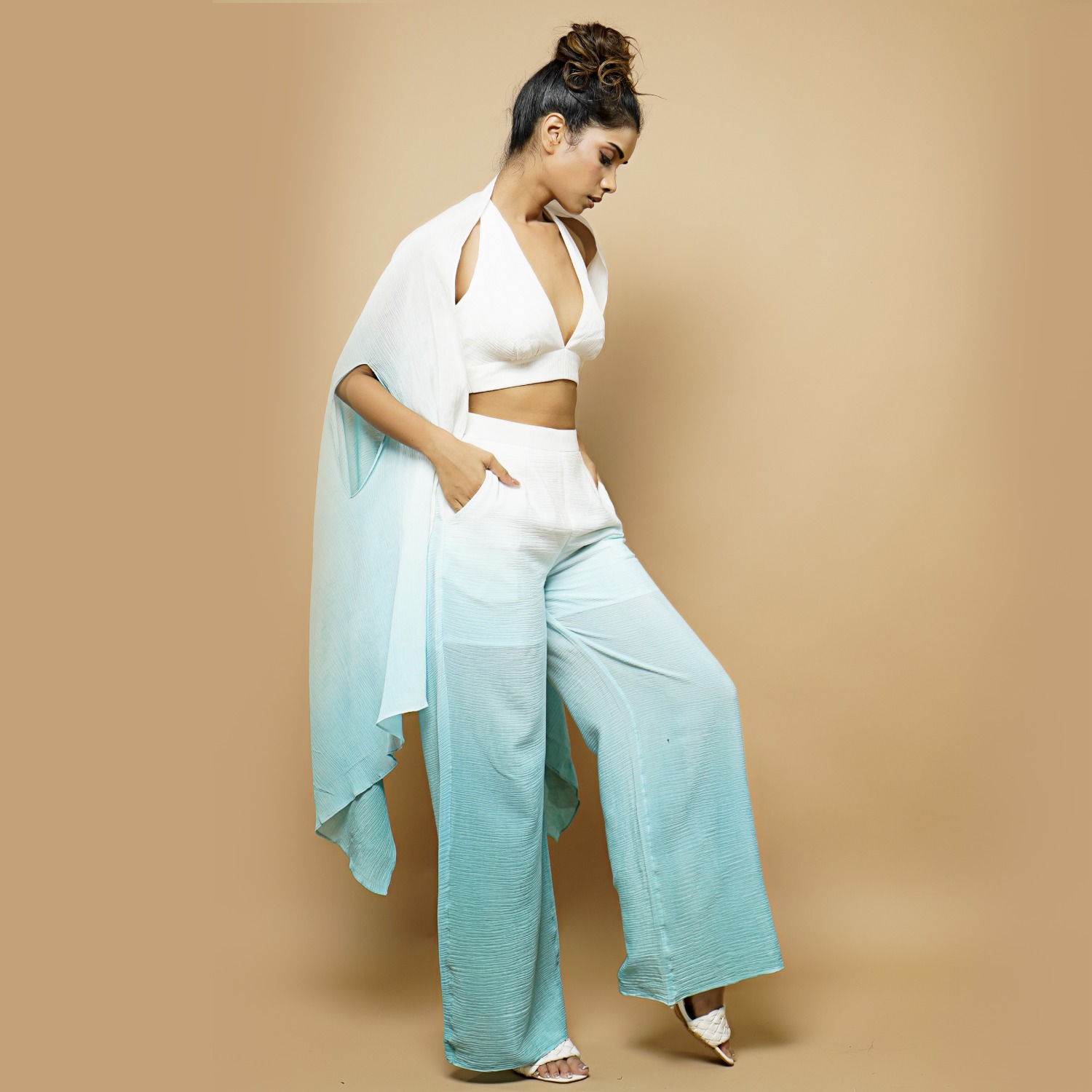 ₹ 9,495 (5% off)This set includes a stunning V-neck bikini top with a back-neck tie-up. It offers a versatile and chic look, paired with high-waisted pants featuring convenient pockets and an up-down cape shrug. Crafted from crushed cotton georgette fabric, the delicate ombre effect seamlessly transitions from sea blue to white. Style it with statement earrings and heels for a dressy day soiree.